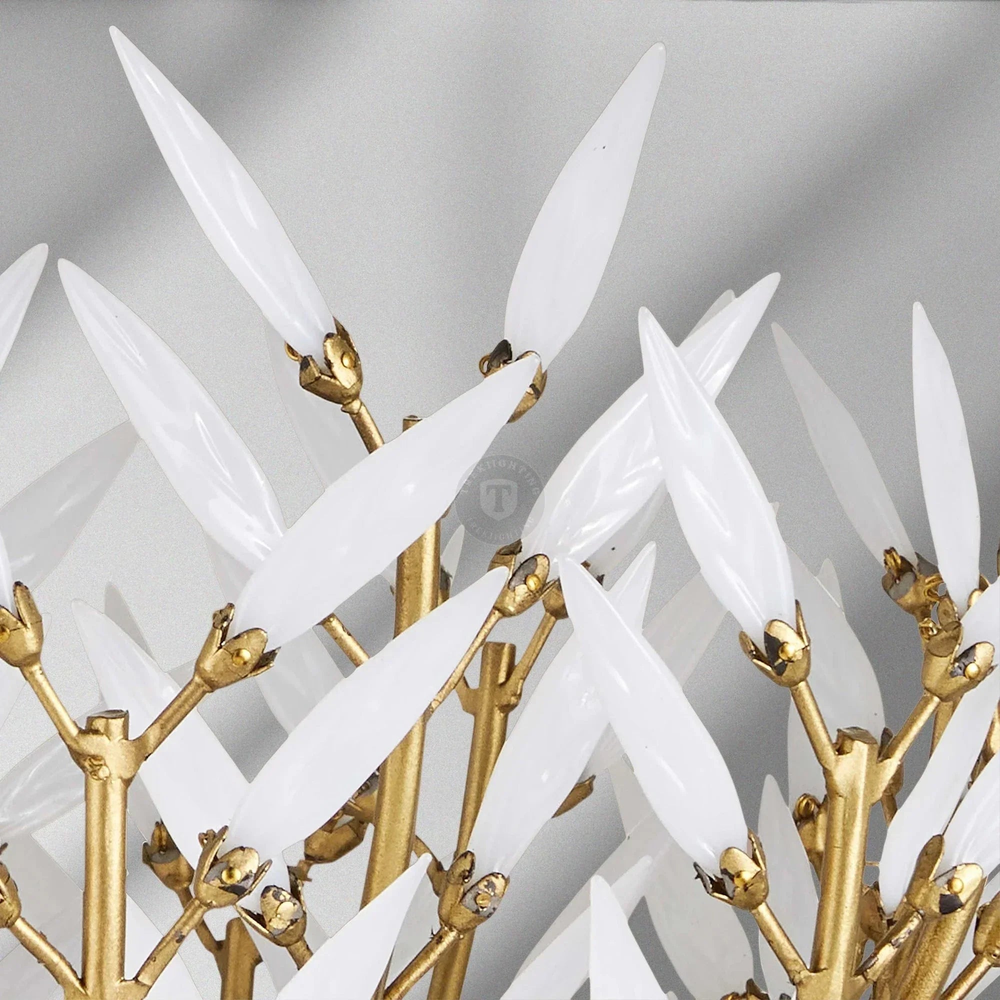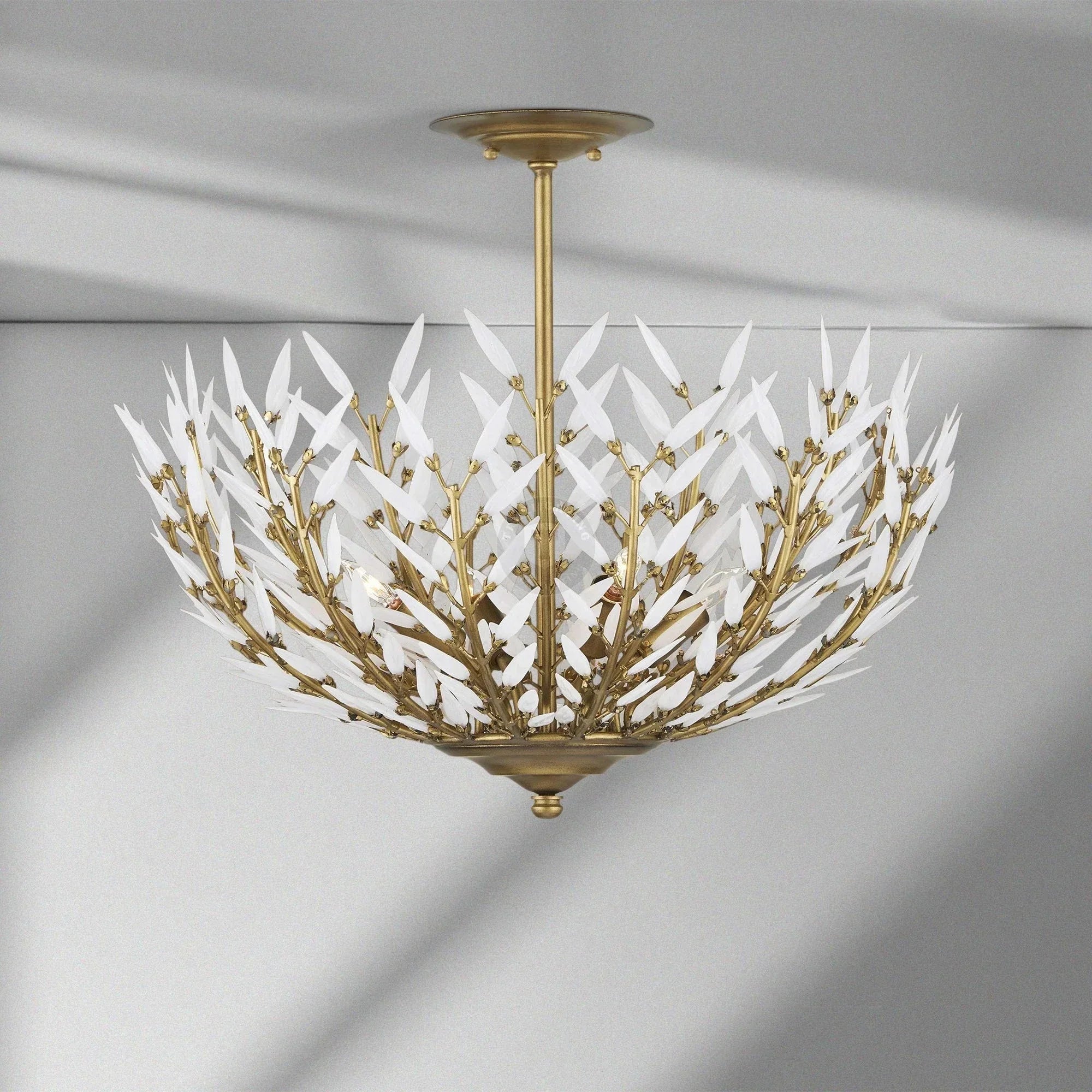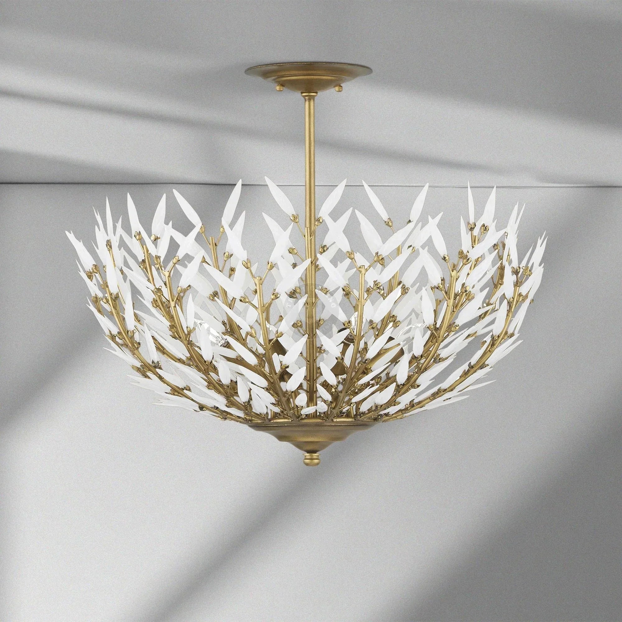 Our Morrigan Lighting Collection features vintage inspiration in three tiers of white glass leaves that fan across brass arcs—creating movement and subtle texture in an elevated, sculptural light.