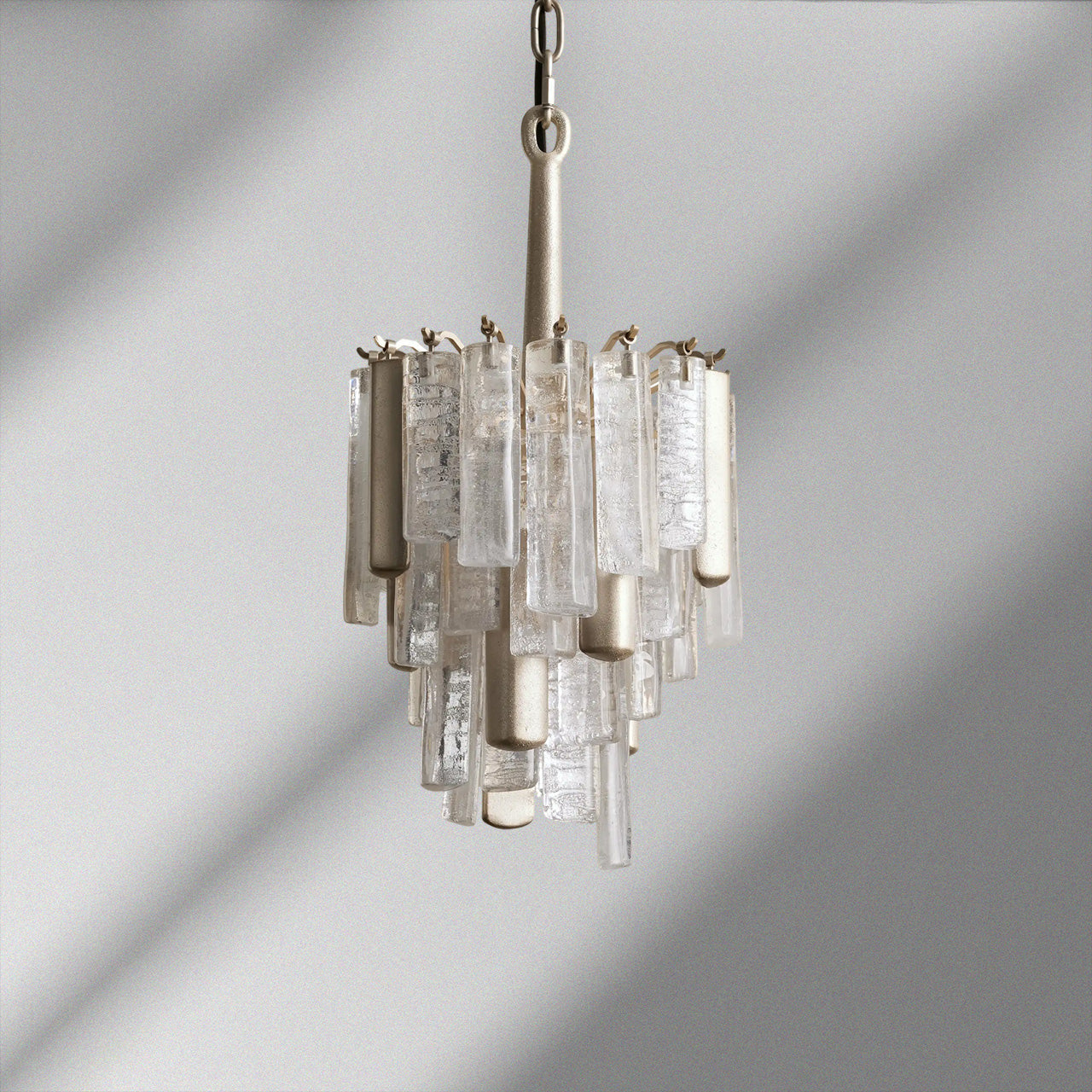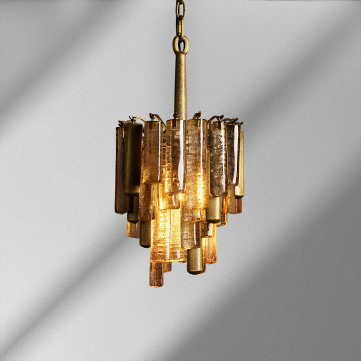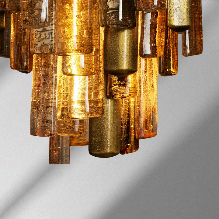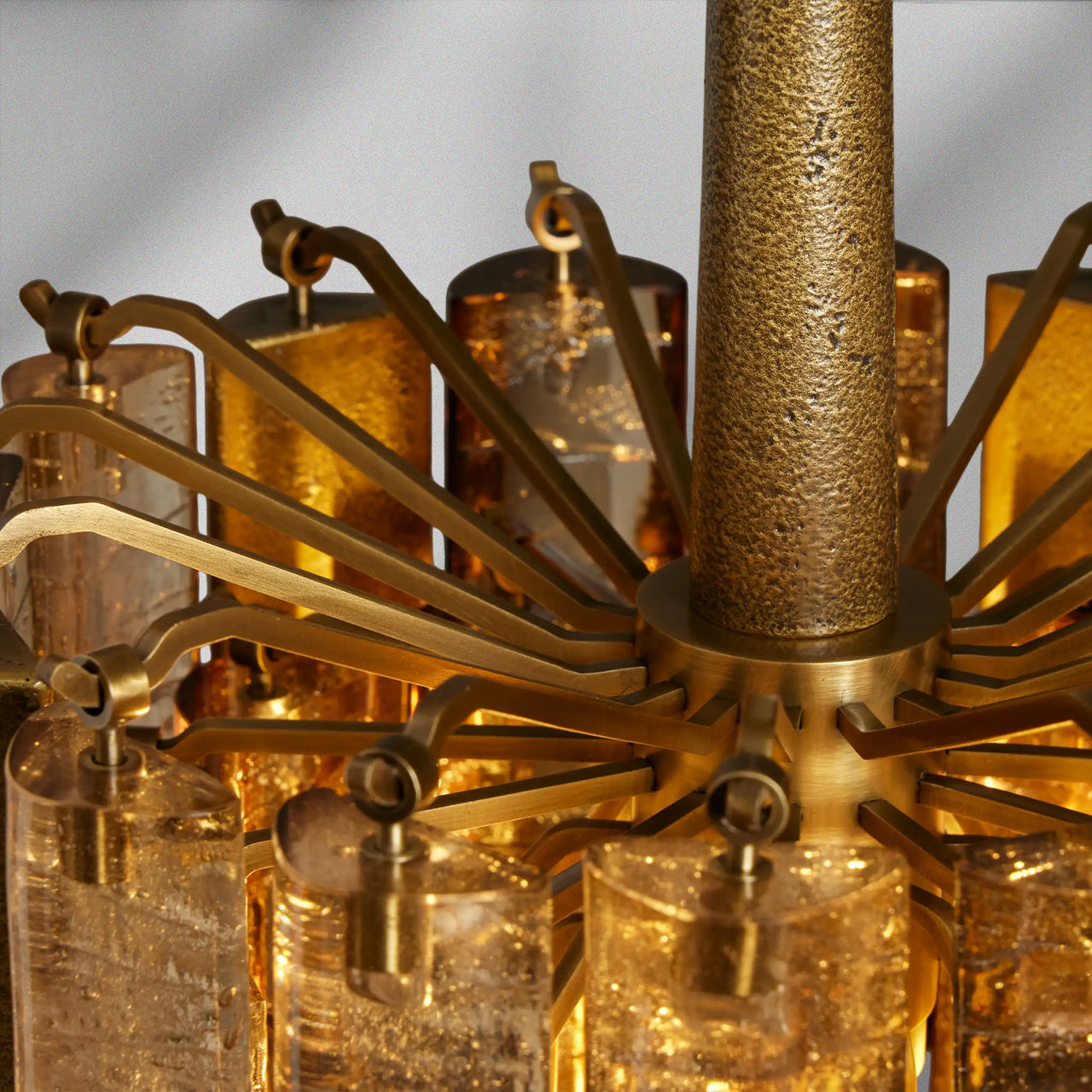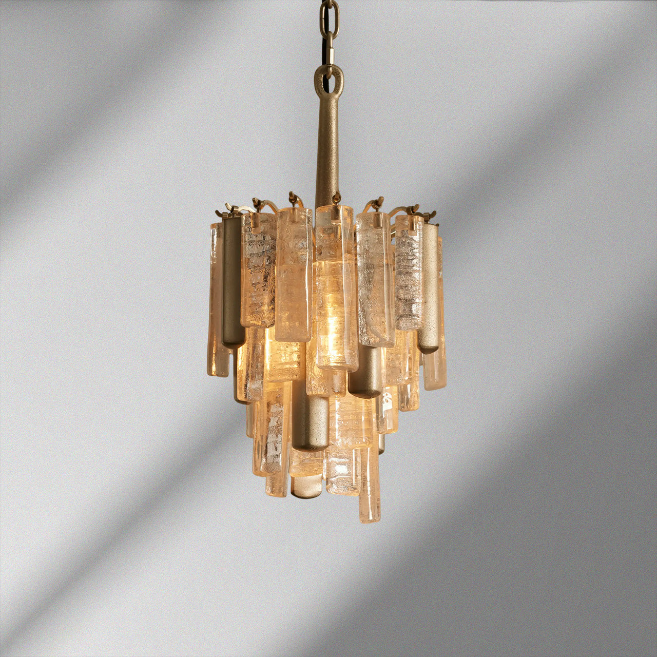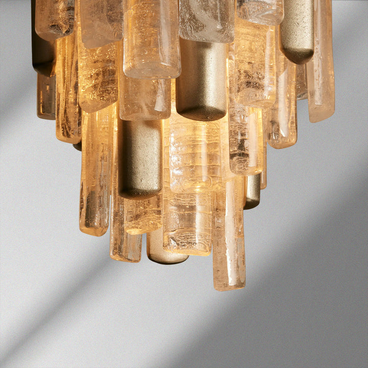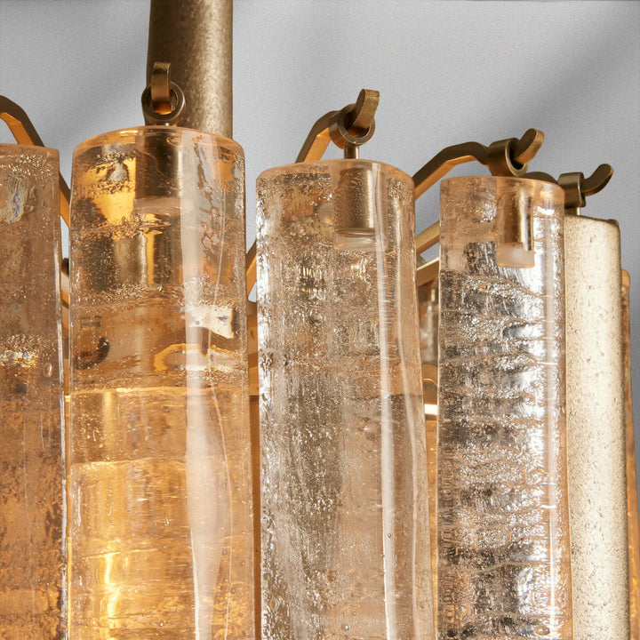 Inspired by traditional Italian Murano fixtures, our Neve Collection layers cast glass and metal into a richly textural, light-catching form. Offered in burnished brass with bronze glass or champagne silver with clear glass, each mixed-material piece glows with sculptural depth and artisanal character.