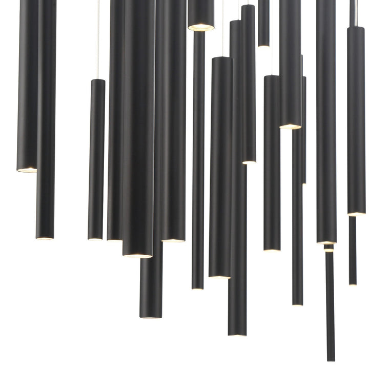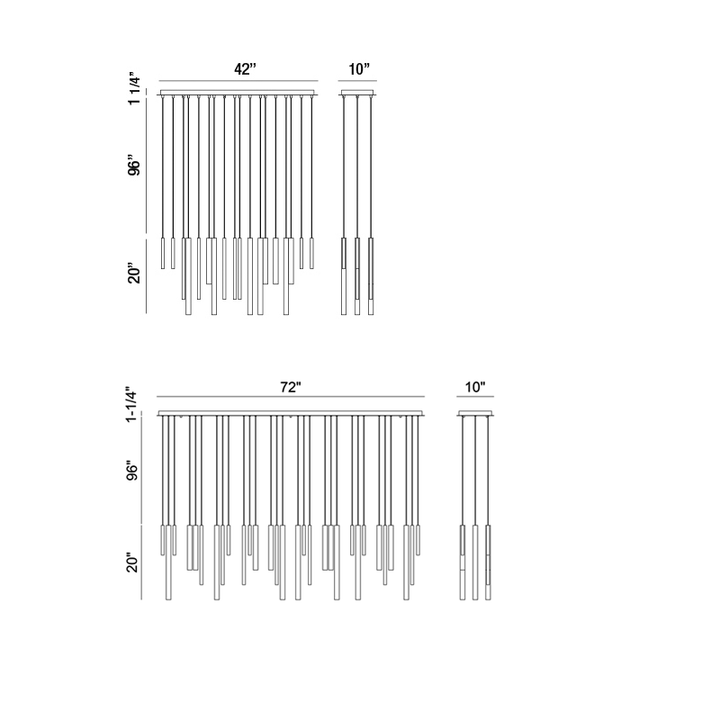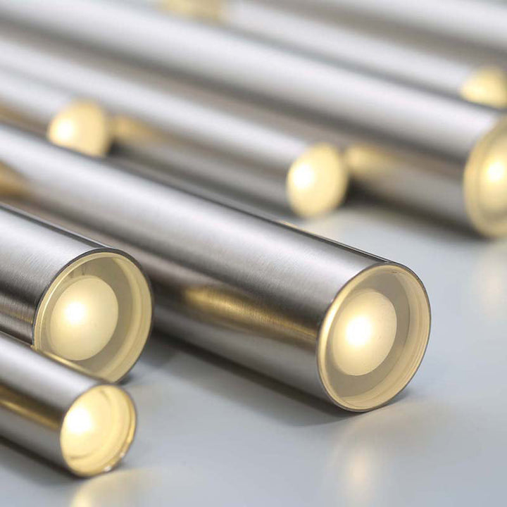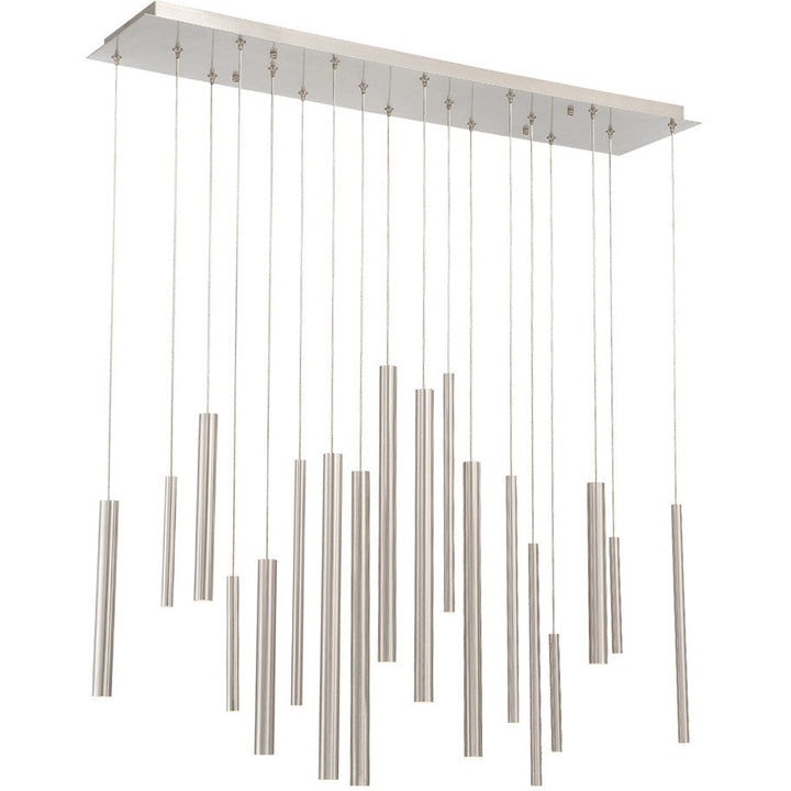 The Santana Linear Multi Light Pendant enhances your space with a sense of dynamic movement, composed of aluminum tubes of varying sizes hung at different adjustable heights. Each tube houses a recessed LED light at the end for collective spot lighting. This dramatic fixture is an ideal centerpiece for modern dining rooms and living areas.