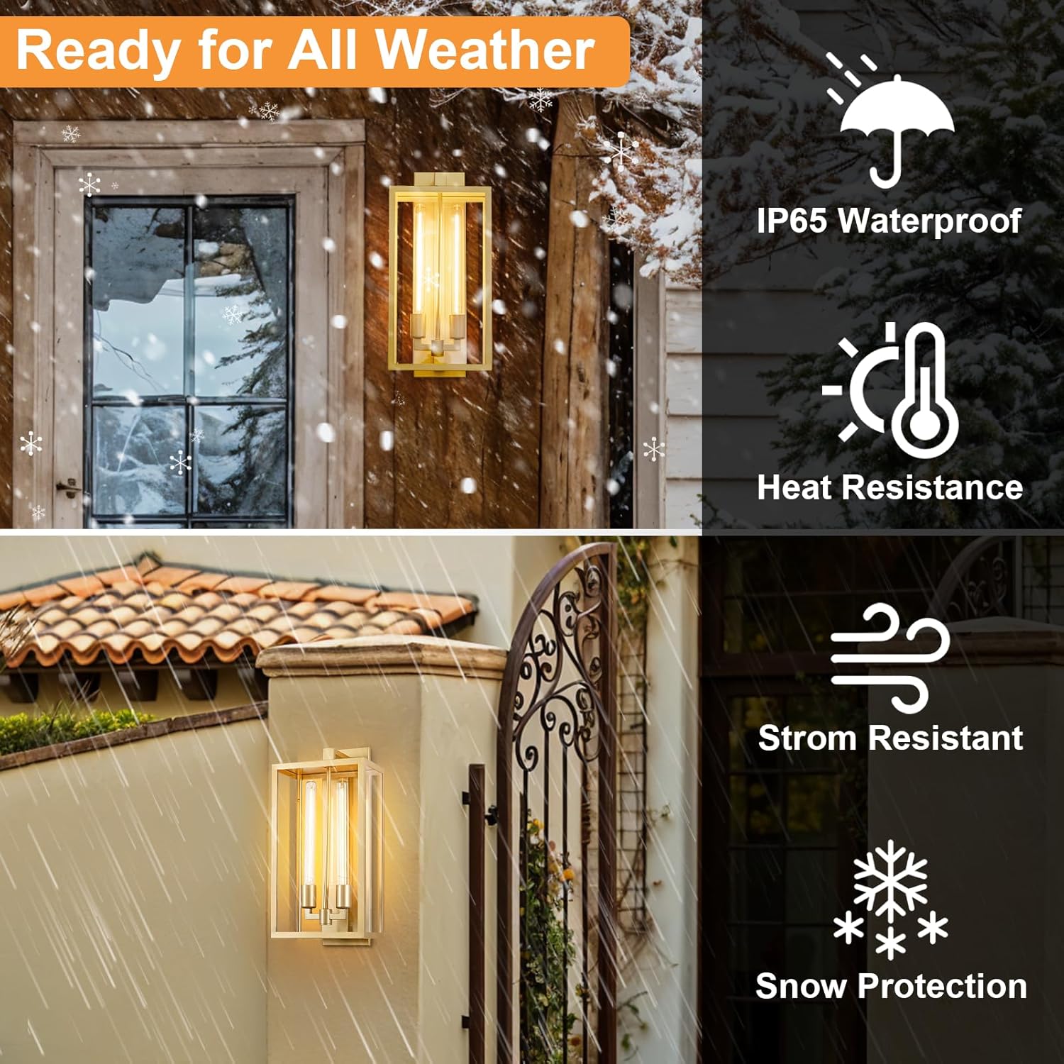 Add a splash of elegance to your porch with this 21‑inch gold‑toned wall sconce that combines classic glass shade design with modern durability. The waterproof IP65 rating means it laughs at rain, snow, and storms while delivering a warm yellow glow. Pre‑assembled and ready to mount, it features an open bottom for tool‑free bulb swaps using the included E26 bulbs. At 22 lb, it’s a sturdy statement piece that instantly elevates any entrance.