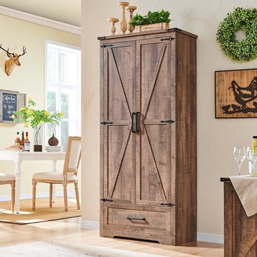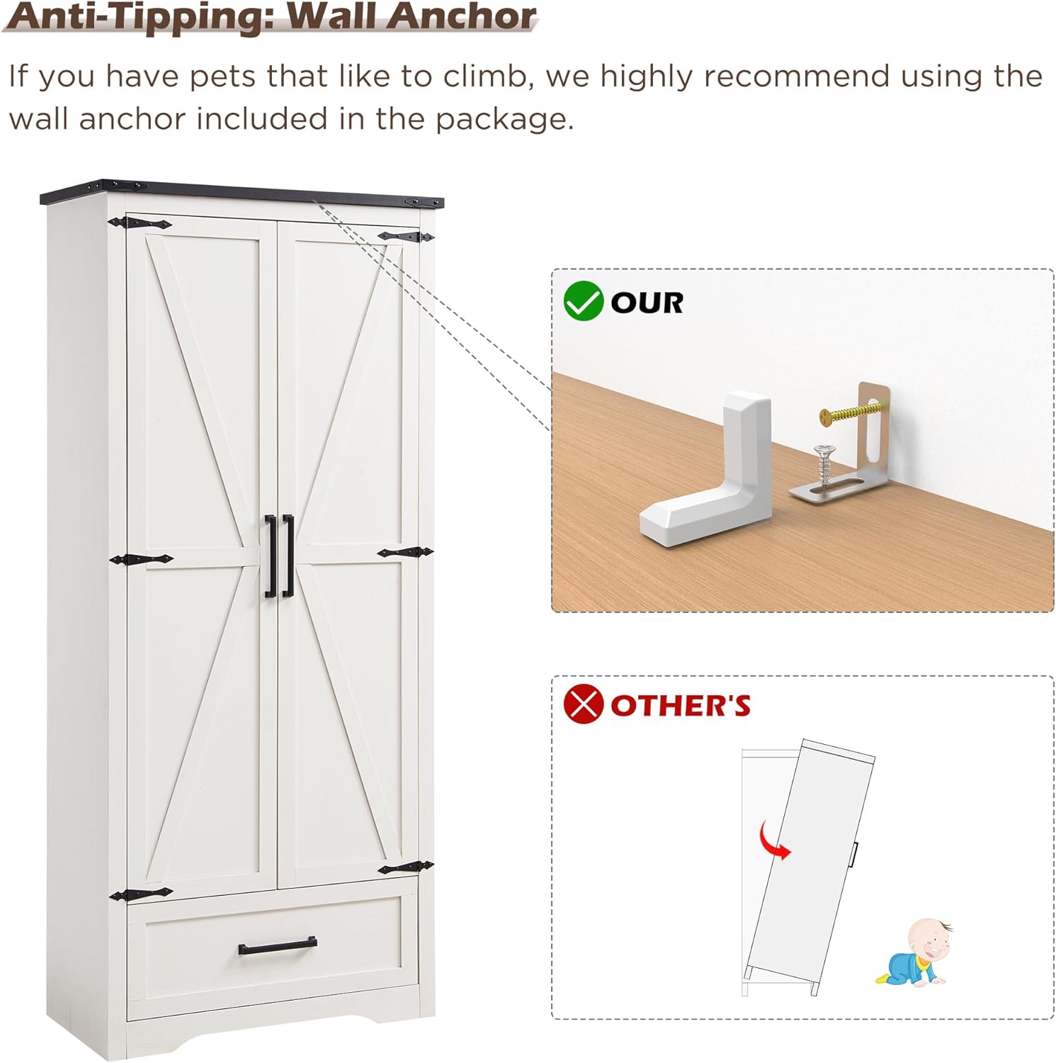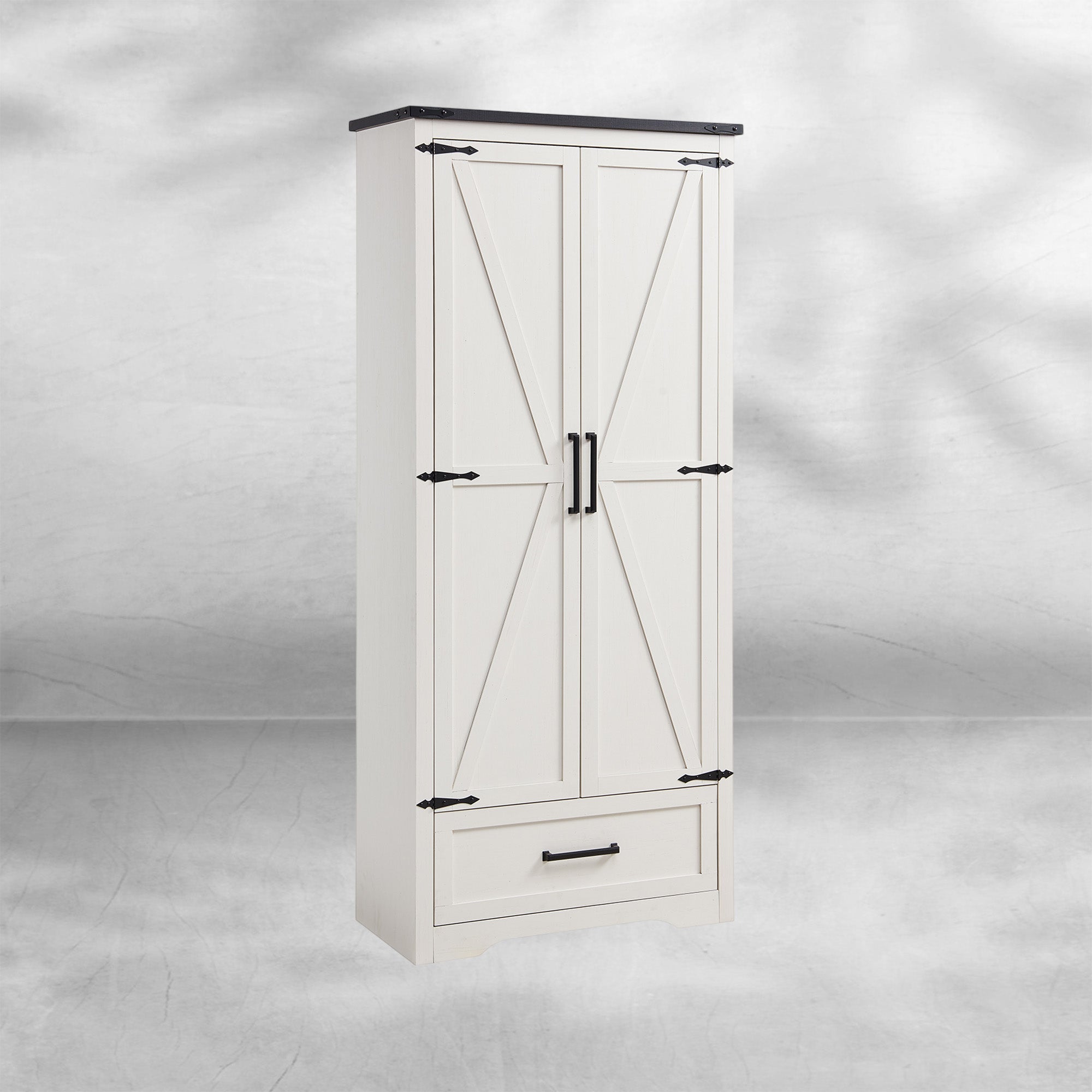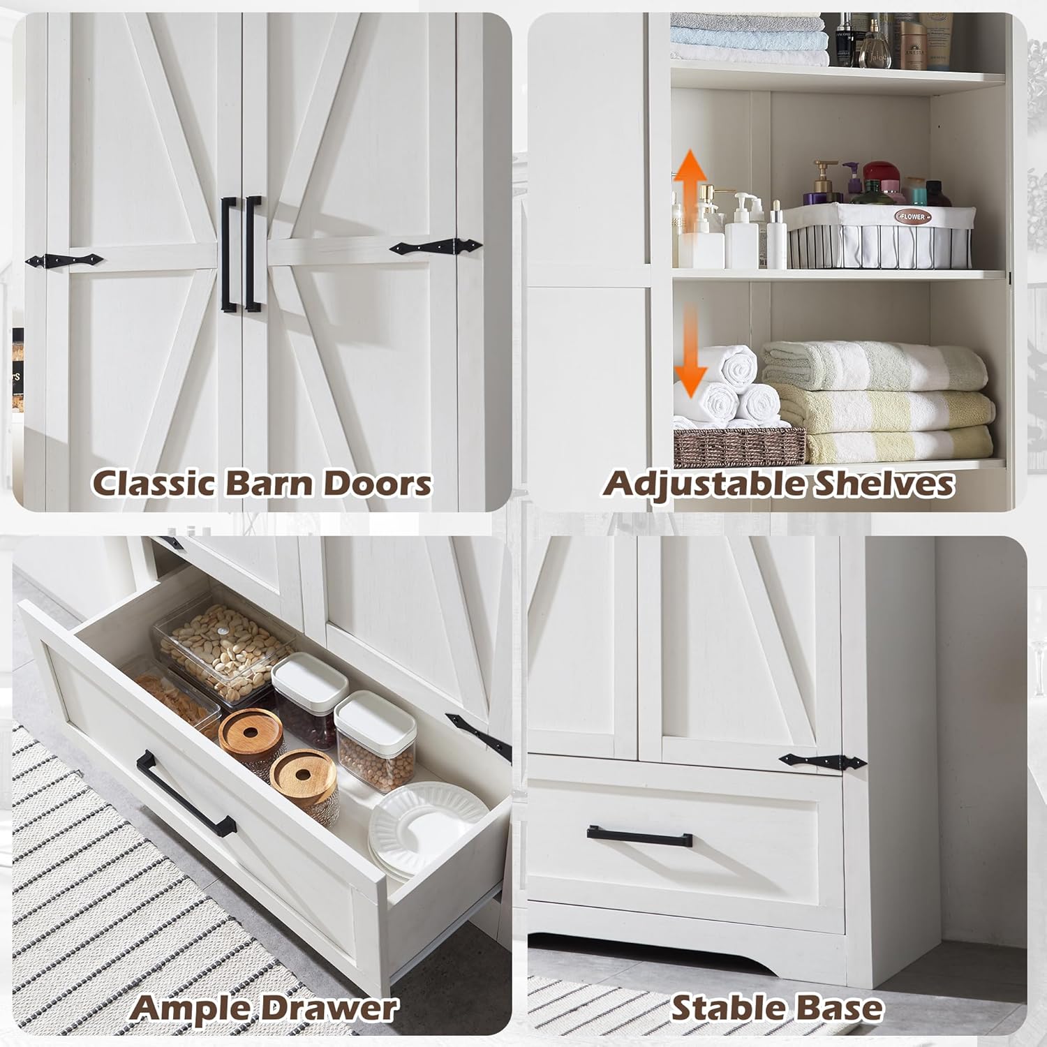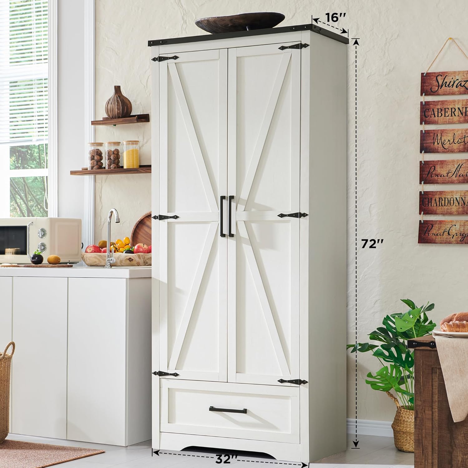 This 72-inch tall farmhouse kitchen pantry offers versatile storage for your dining room, living room, or bathroom. It features adjustable shelves, a drawer, and charming barn doors, adding a touch of rustic elegance. The white wood finish complements various decor styles, creating a functional and stylish storage solution. Keep your space organized and stylish with this versatile pantry cabinet.