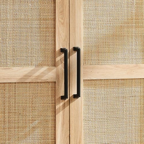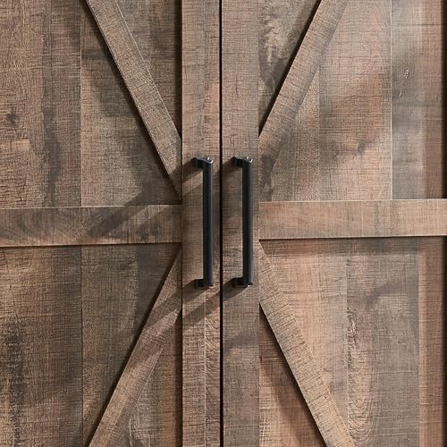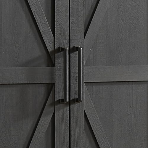 This 72" farmhouse kitchen pantry cabinet is a stylish storage solution. It features two barn doors and shelves, offering versatile storage. Perfect for the dining room, bathroom, or living room. With its rustic black finish, it adds a touch of charm to any space.