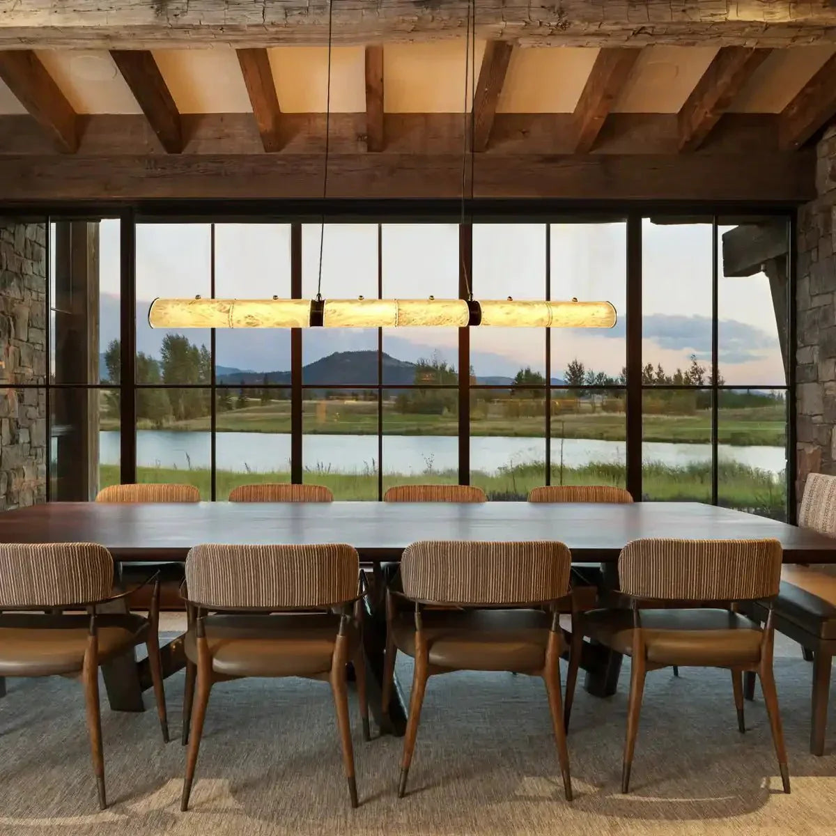 The Alabaster Modern Art Linear Chandelier boasts a sleek linear design, elevated by its alabaster shade, creating a standout fixture. Crafted from premium Spanish alabaster, the shade not only ensures a captivating light effect but also imparts a warm and natural ambiance.