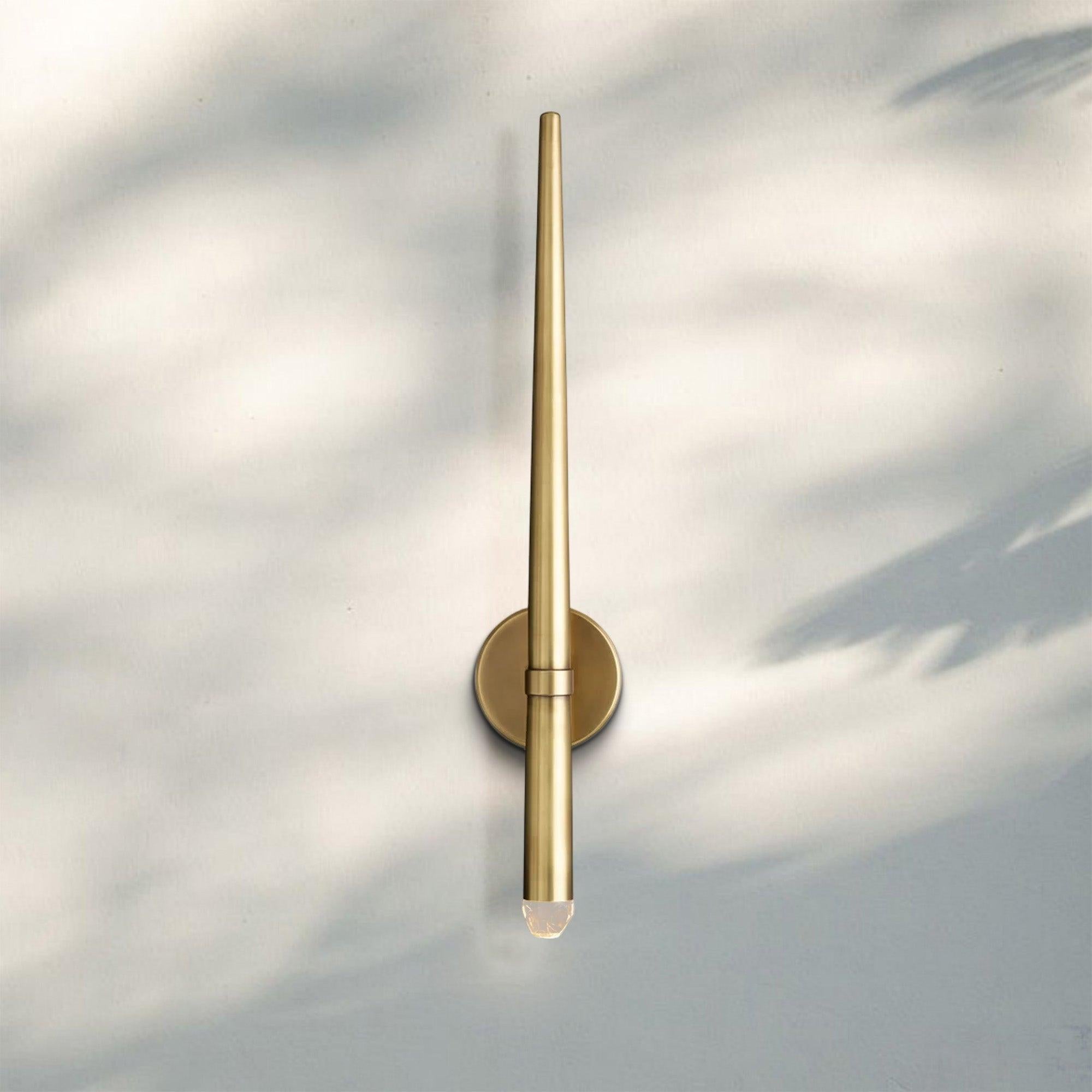 Aquitain light fixture features a collection of sleek, elongated brass cylinders with tapered ends. The ends are capped with clear crystal-like elements that allow the light to shine through, creating a soft and warm glow. The brass finish provides a luxurious and modern aesthetic, while the minimalist design adds elegance to any space. The staggered lengths of the cylinders create a dynamic visual effect, making this chandelier ideal for contemporary living spaces, dining rooms, or high-ceilinged areas where a statement piece is desired.