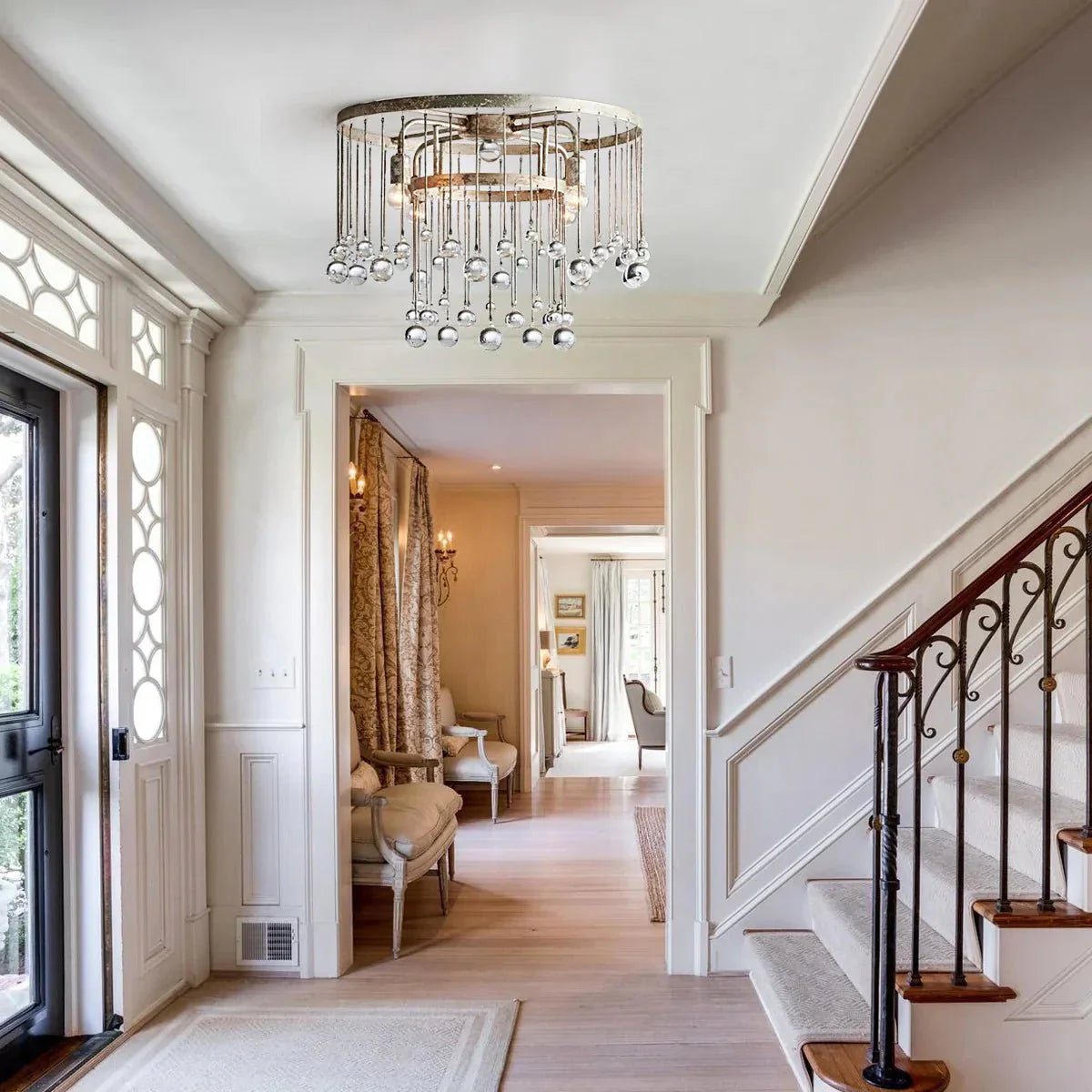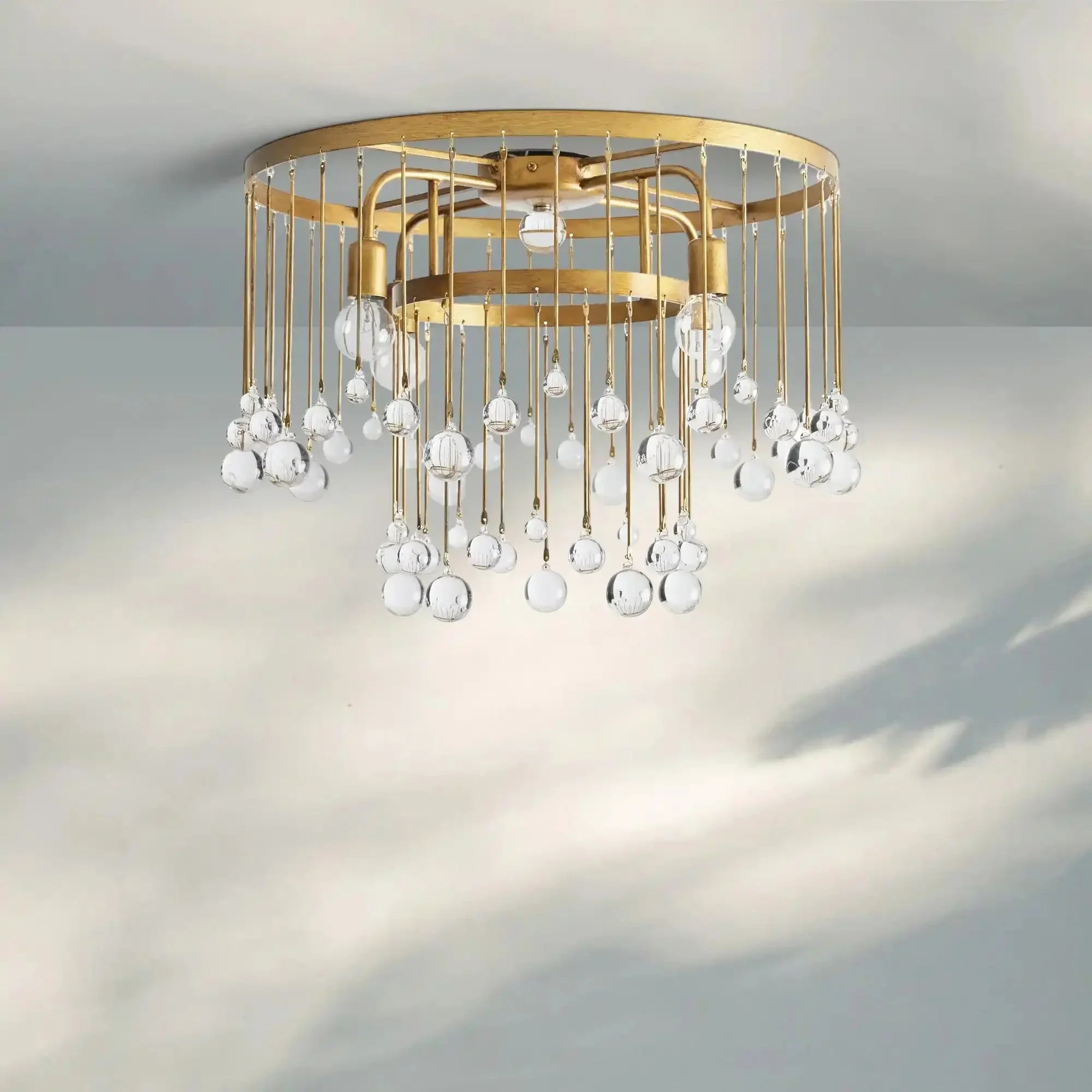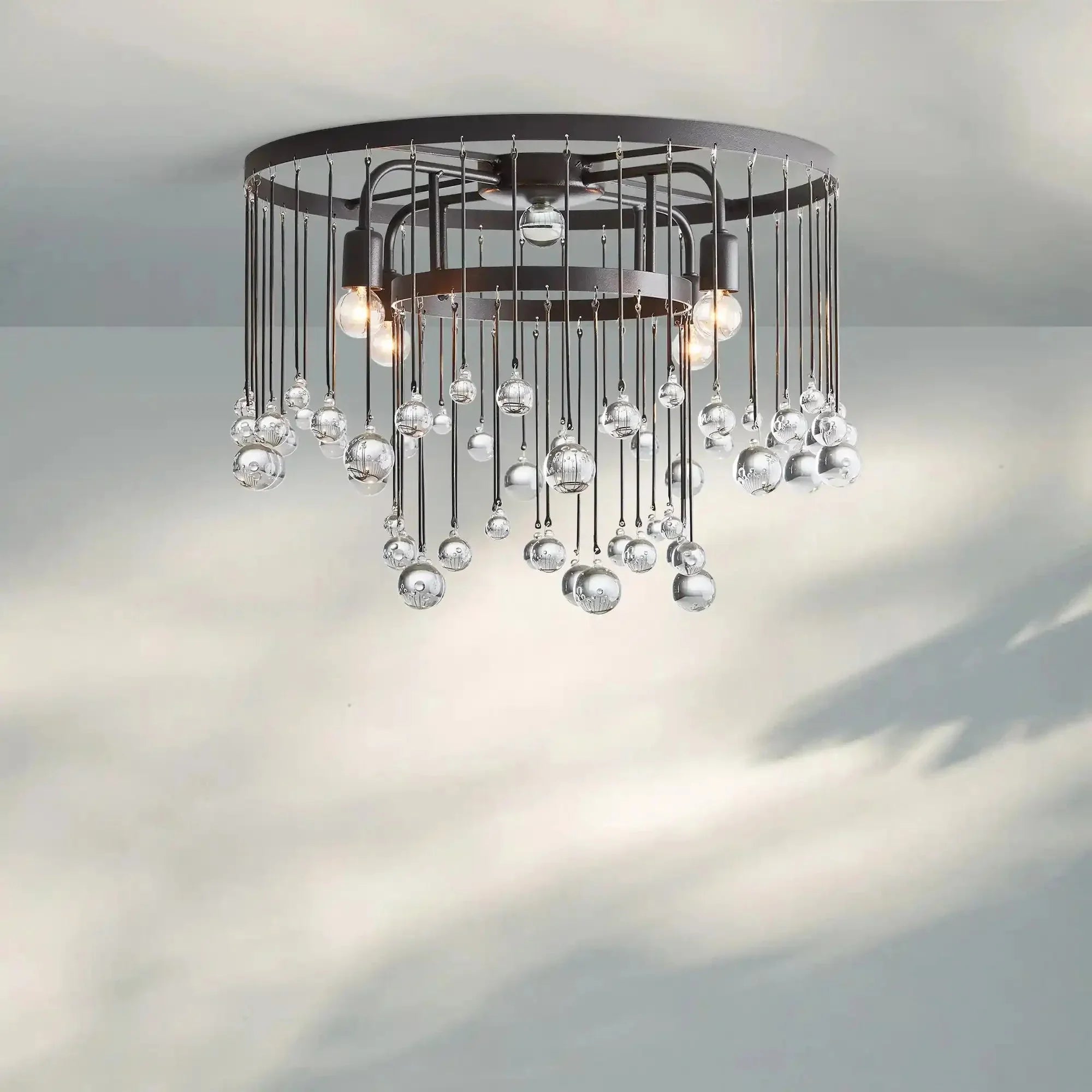 Equally at home in an ancient French castle or a downtown New Orleans loft, our Aubrey Flushmount creates dramatic ambiance in any setting. Crystal drops hanging in varying lengths from an iron cage create the illusion of movement as they catch the light, refracting brilliant beams around your room.