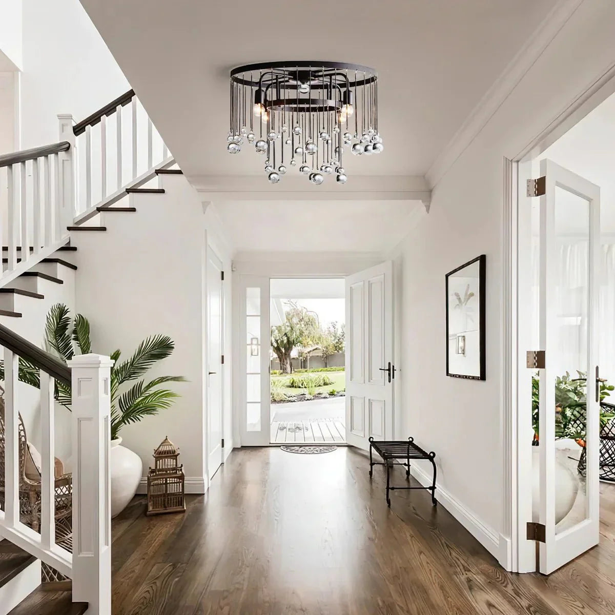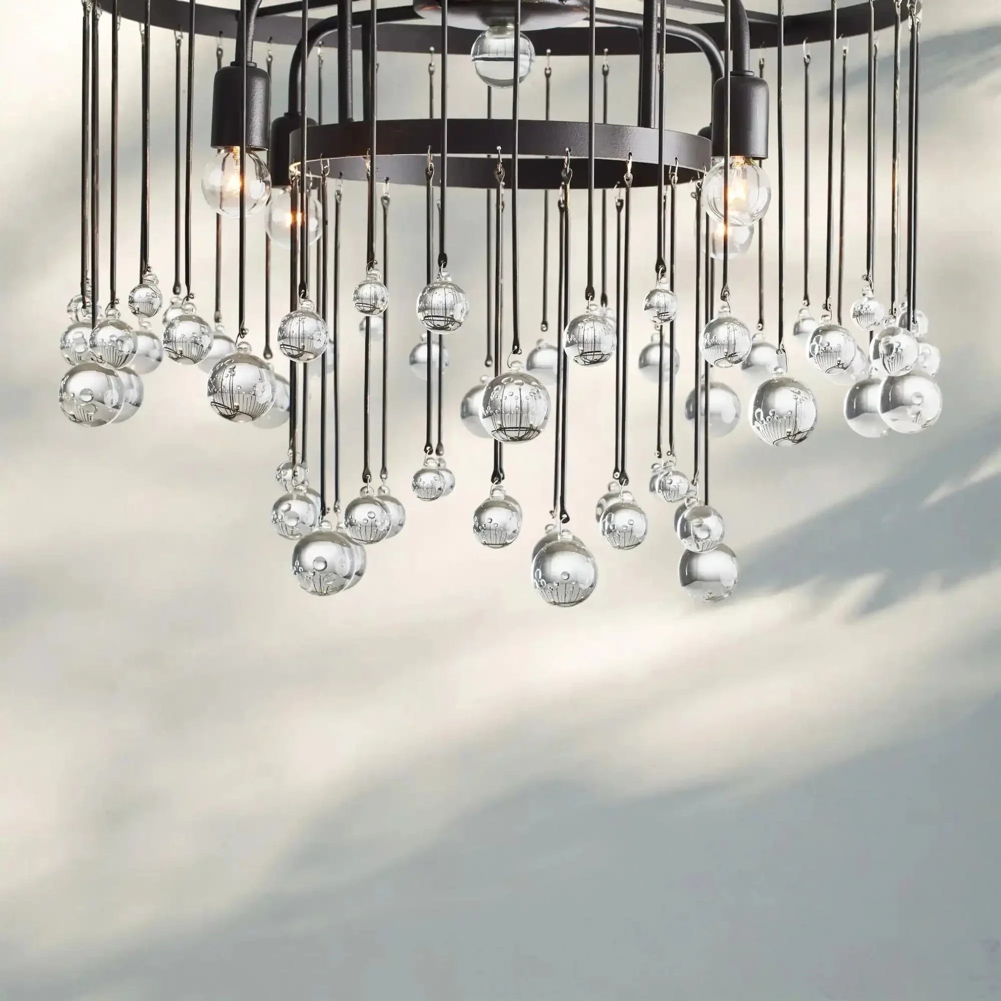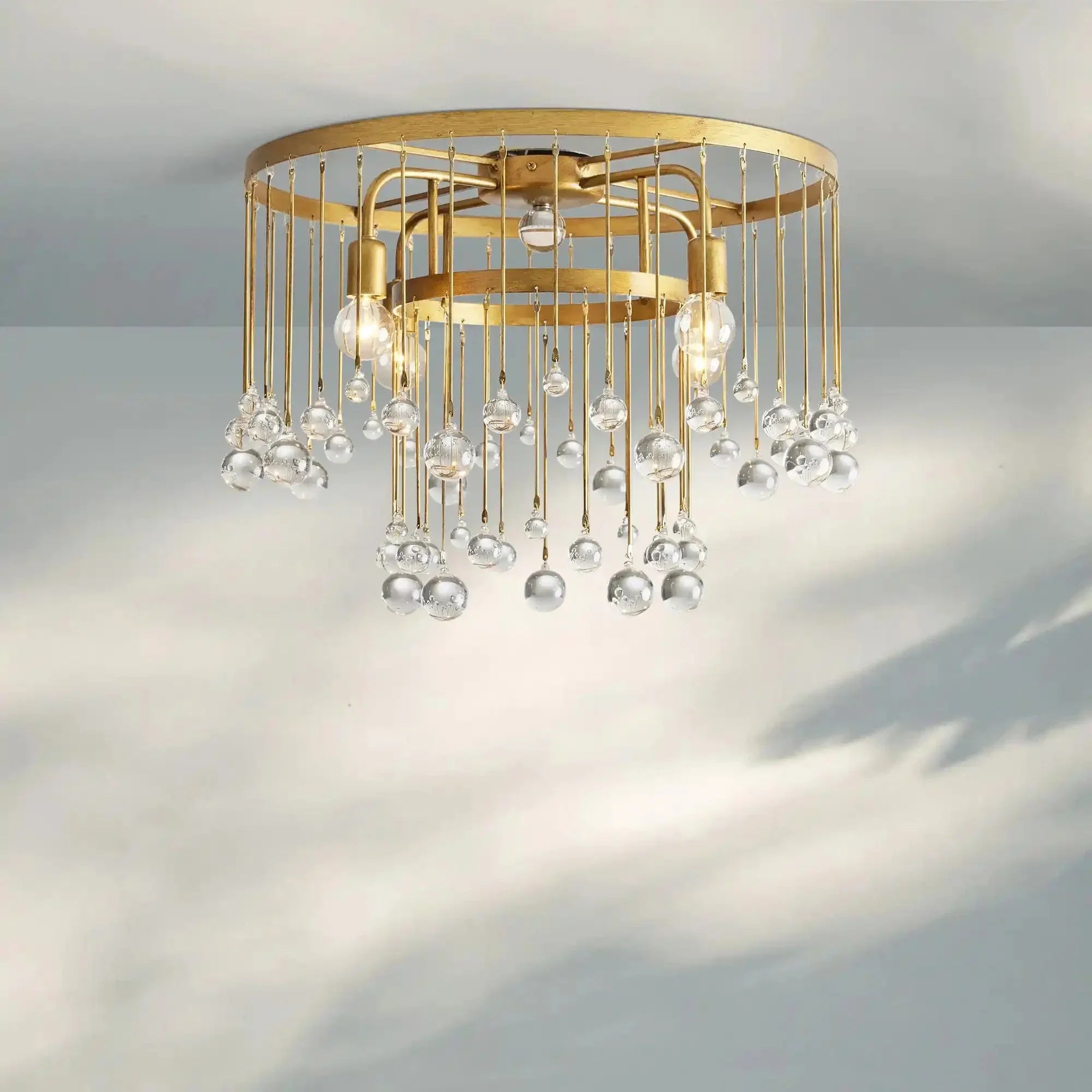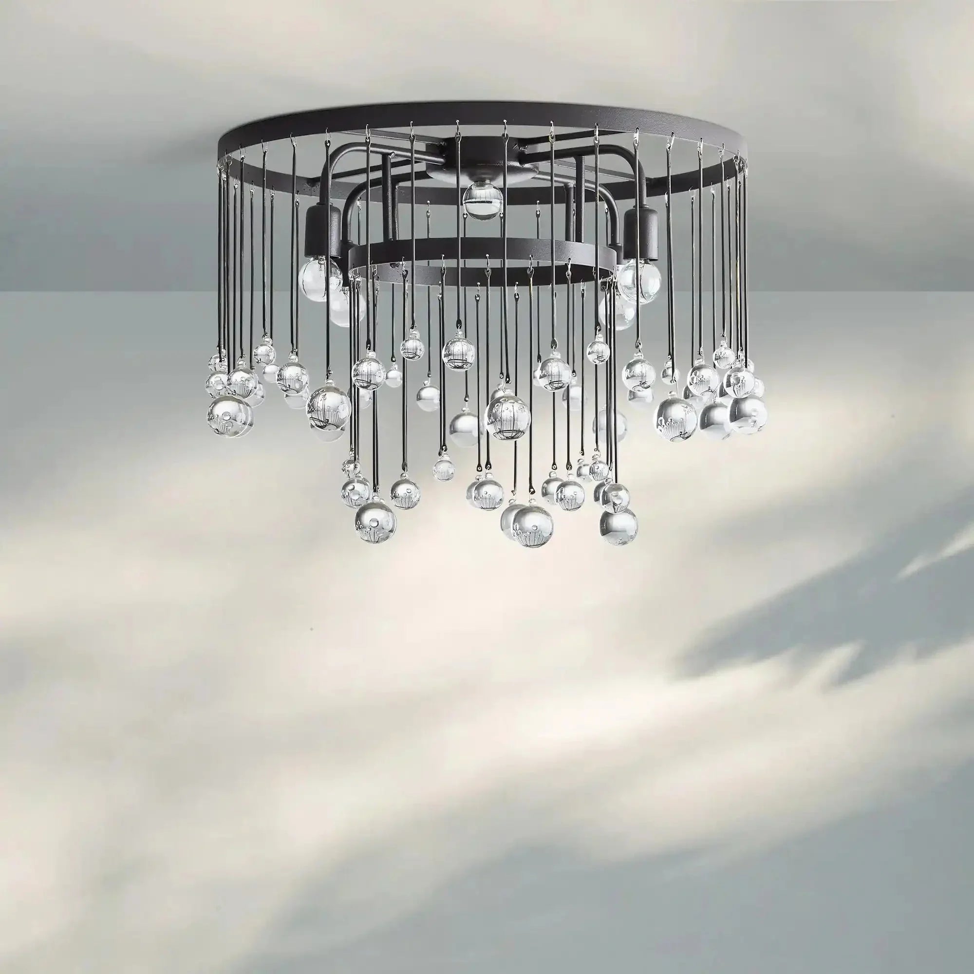 Equally at home in an ancient French castle or a downtown New Orleans loft, our Aubrey Flushmount creates dramatic ambiance in any setting. Crystal drops hanging in varying lengths from an iron cage create the illusion of movement as they catch the light, refracting brilliant beams around your room.