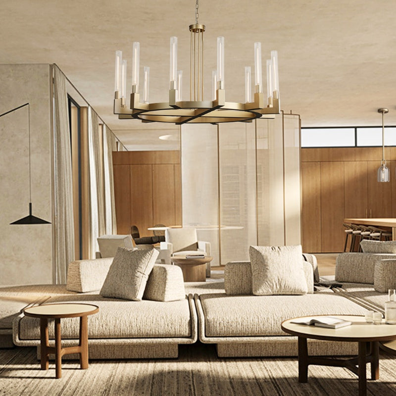 This chandelier is a reinterpretation of the simple art chandelier form in solid brass. The fixture features clean lines and sharp angles, and its elegant prismatic glass hurricane showcases an Edison filament bulb that flickers inside like a candle.