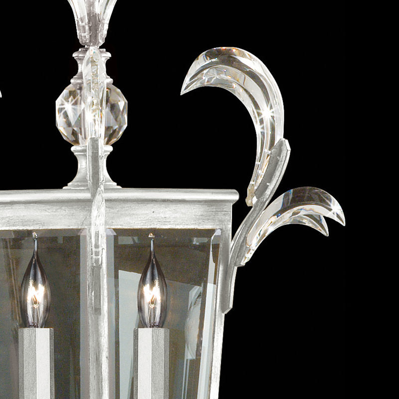 Lantern in a gold leaf finish with matching candlesticks, featuring beveled crystal accents.