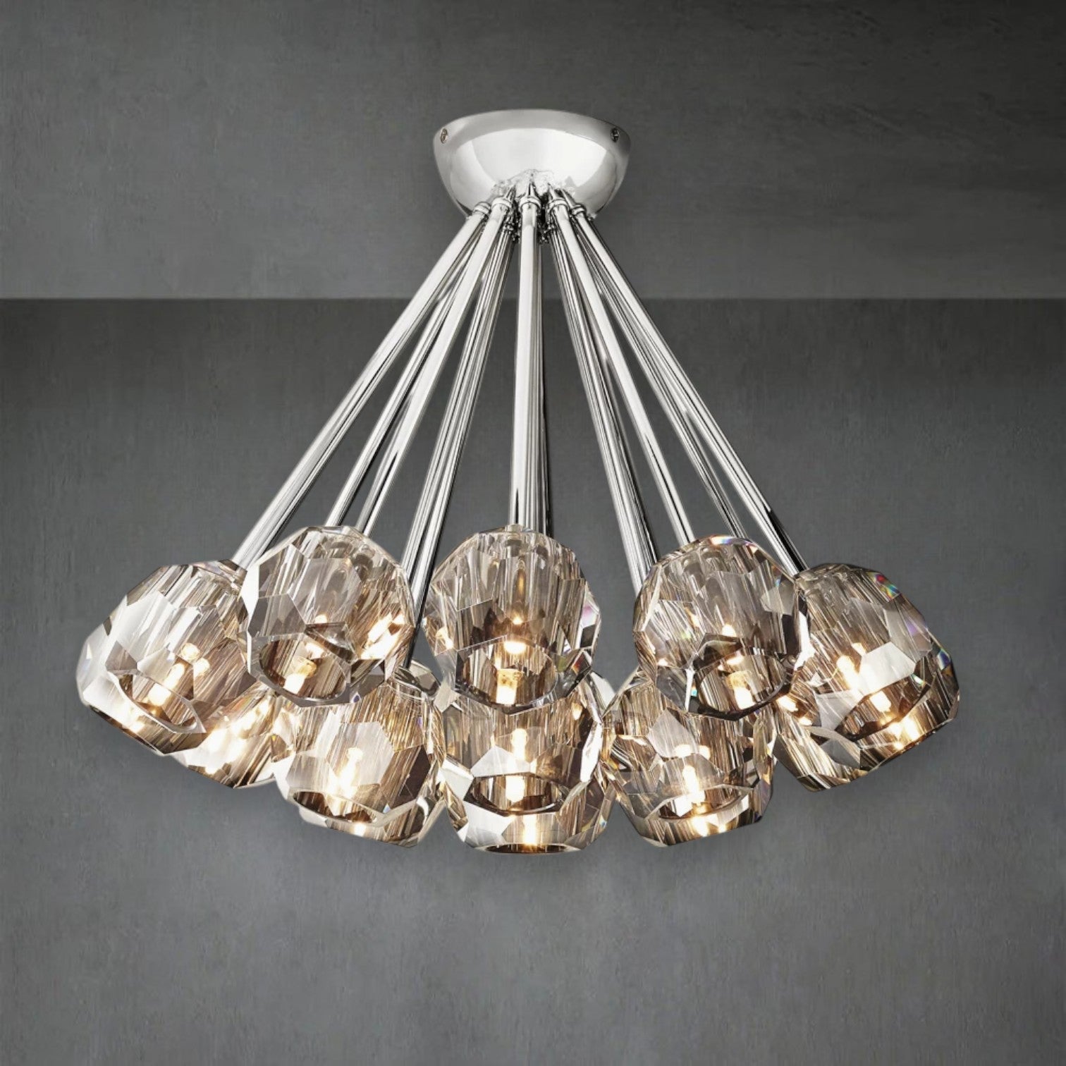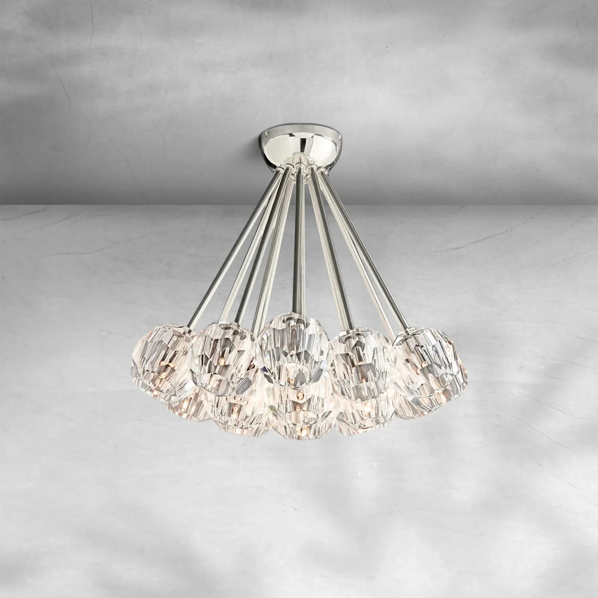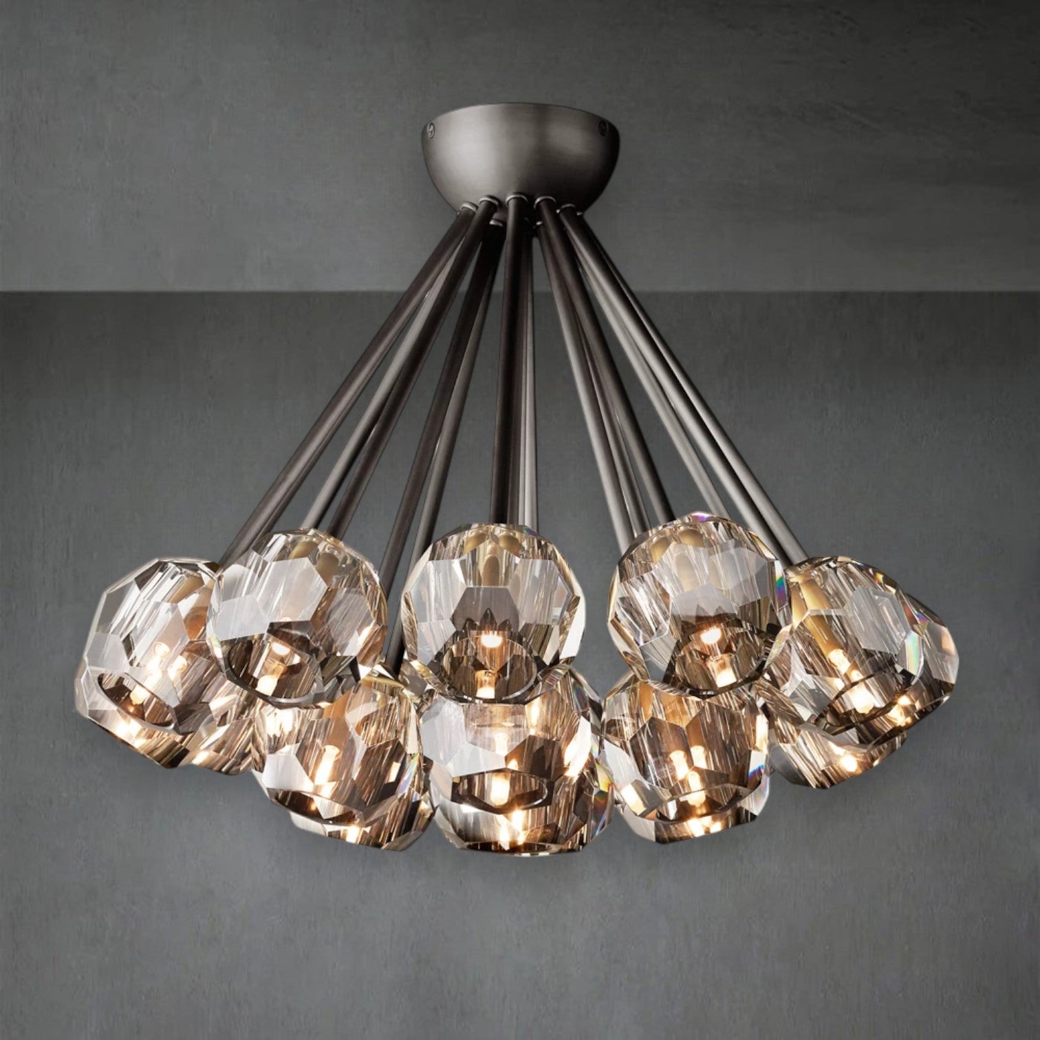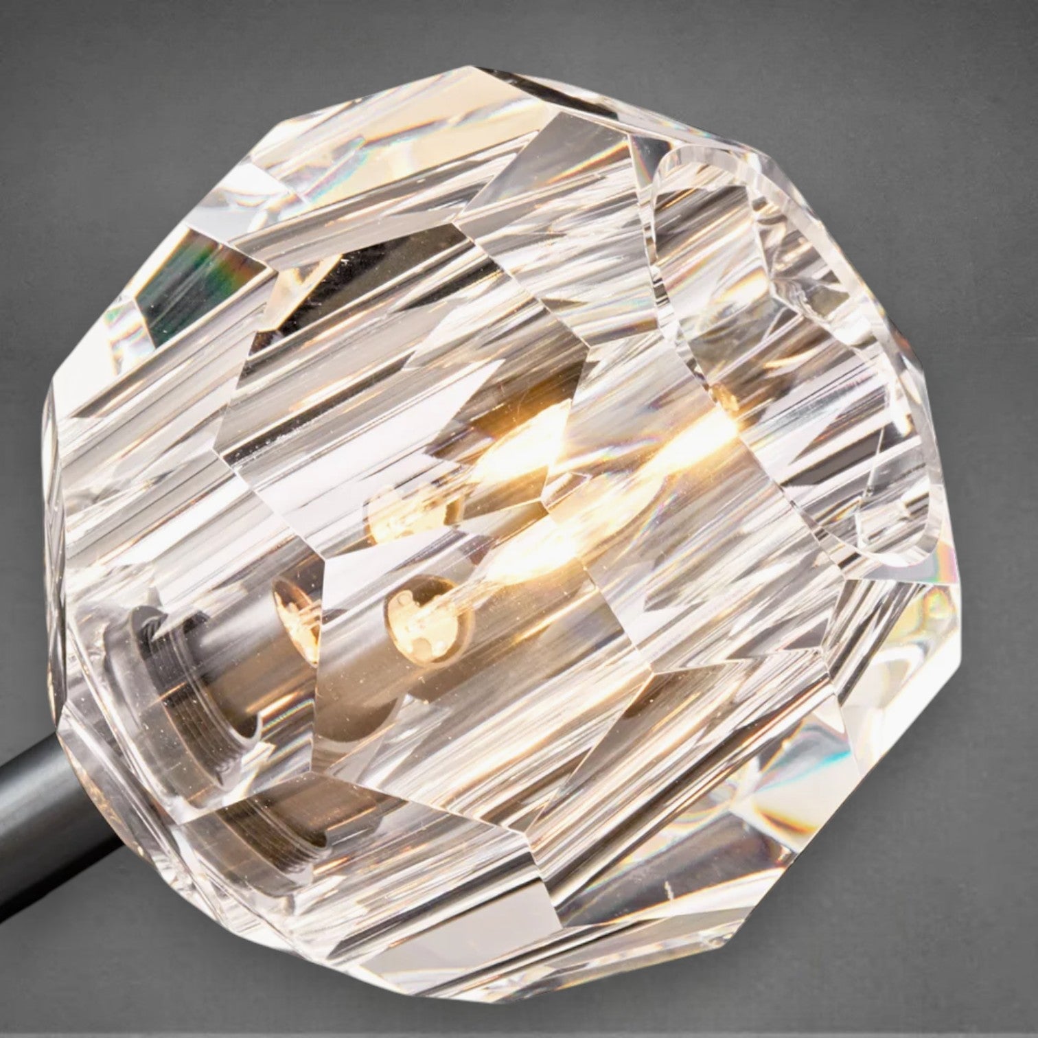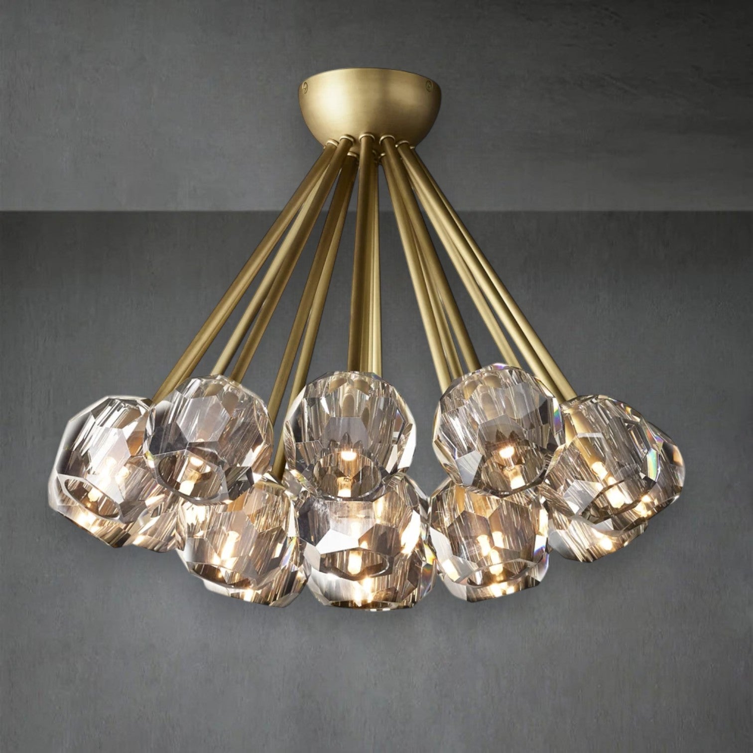 Crafted of solid brass and crystal glass, designer Jonathan Browning's sculptural fixture is a testament to his passion for luxe materials and superior craftsmanship. Evoking the minimalist spirit of 1960s design, each finely faceted sphere is ground and polished by hand to reflect and refract the light.