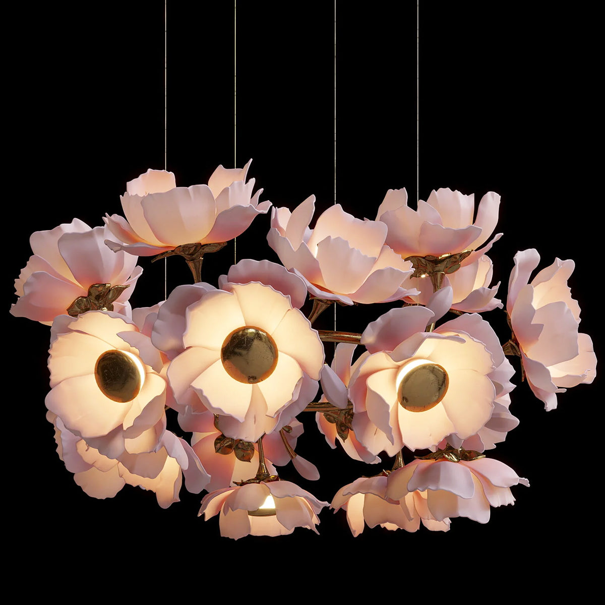 Immerse yourself in the luxurious charm of the Camellia chandelier, where elegant craftsmanship meets modern lighting technology. Shaped into a circular arrangement, this exquisite fixture is adorned with delicate pink camellia flowers, each housing a brilliant LED centerpiece. The chandelier’s ceramic petals and warm copper framework enhance its allure, casting a soft, warm glow throughout your room with its stepless dimming feature and soothing 3000K light.