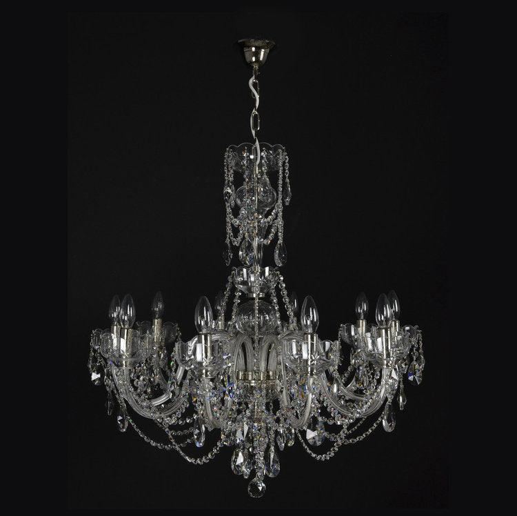 Glass arms and other parts of this beautiful chandelier are made of the finest Bohemian crystal glass. richly decorated with the highest quality cut crystal trimmings with high lead content. Gold or silver coloured metal parts are provided with a protective layer.