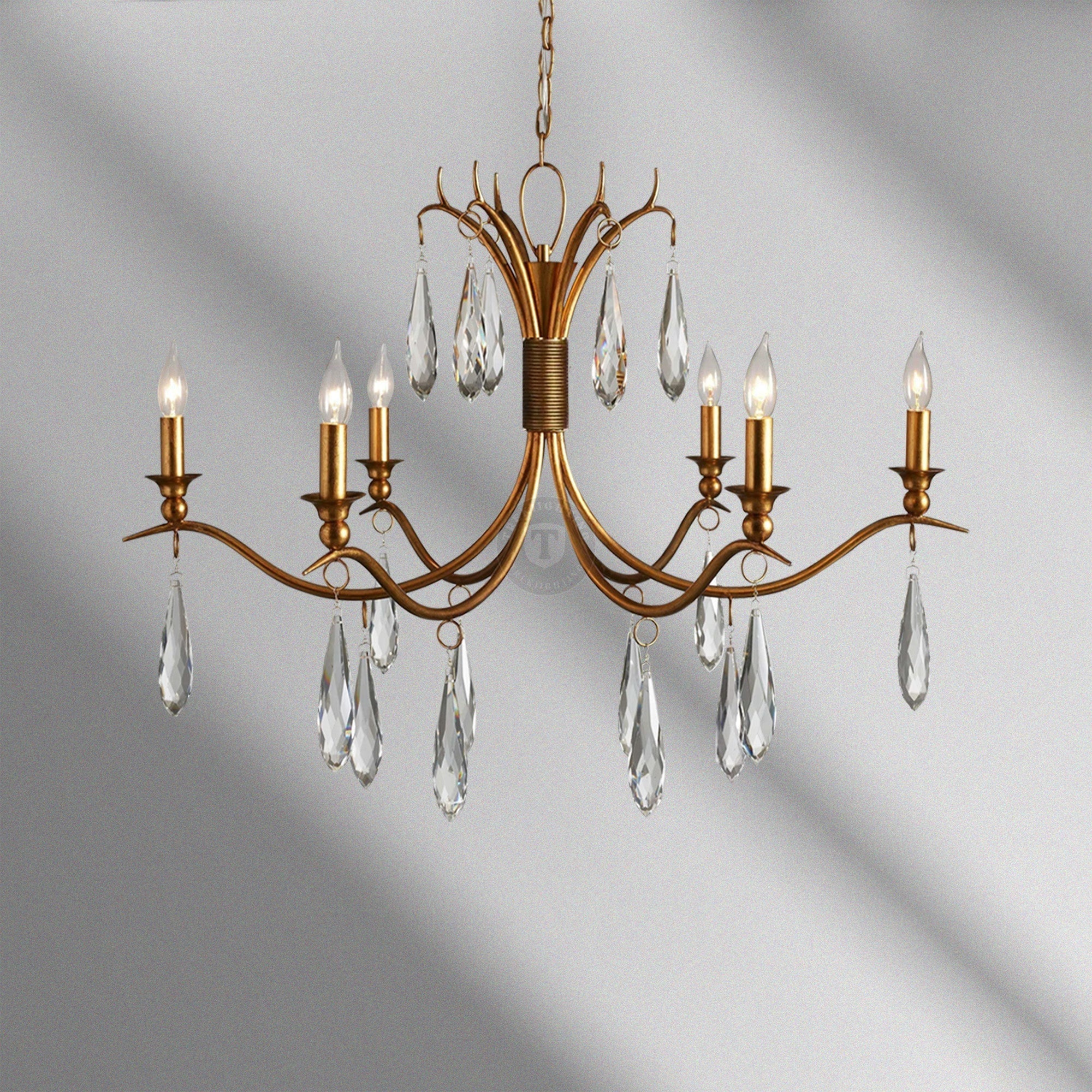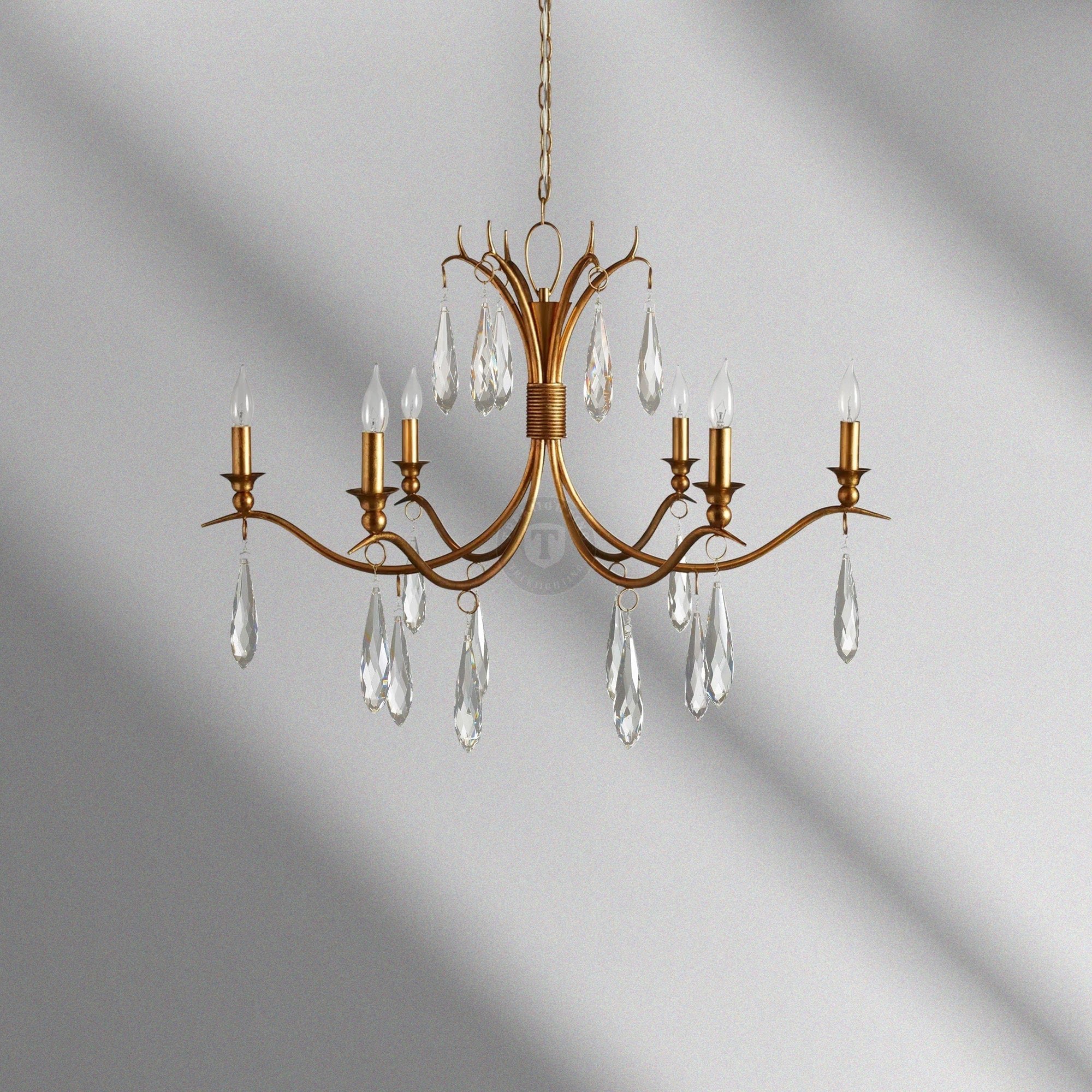 Our stunning Celine Chandelier is adorned with 18 crystal drops that shimmer when illuminated. Its grand scale and warm, gold leaf finish make Celine a focal point in any home.