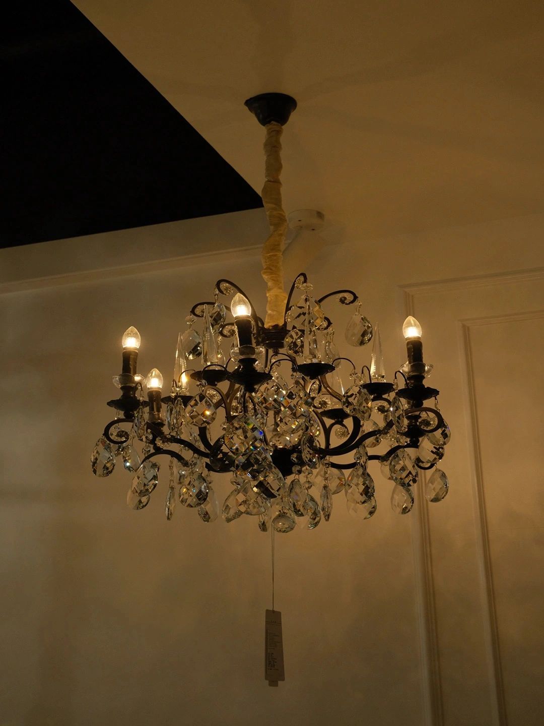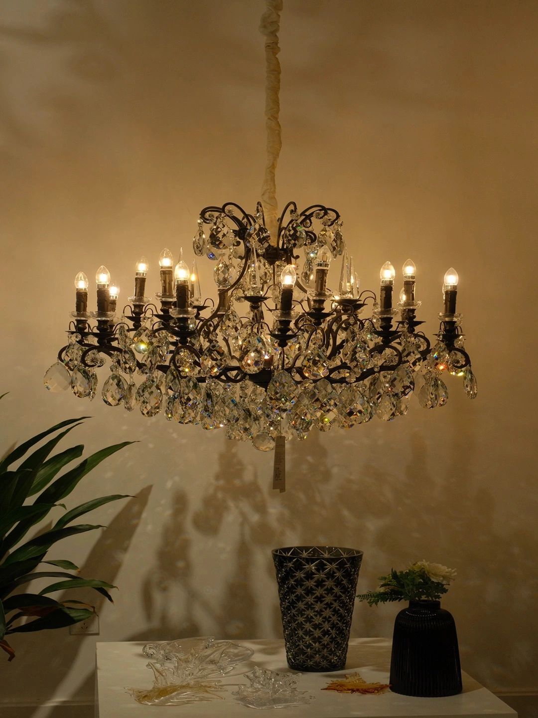This luxurious, European-style chandelier is crafted from premium crystals and an antique black copper finish frame, adding a touch of elegance to any room. Its sophisticated details bring a sparkle to the home, creating a stunning and timeless centerpiece.