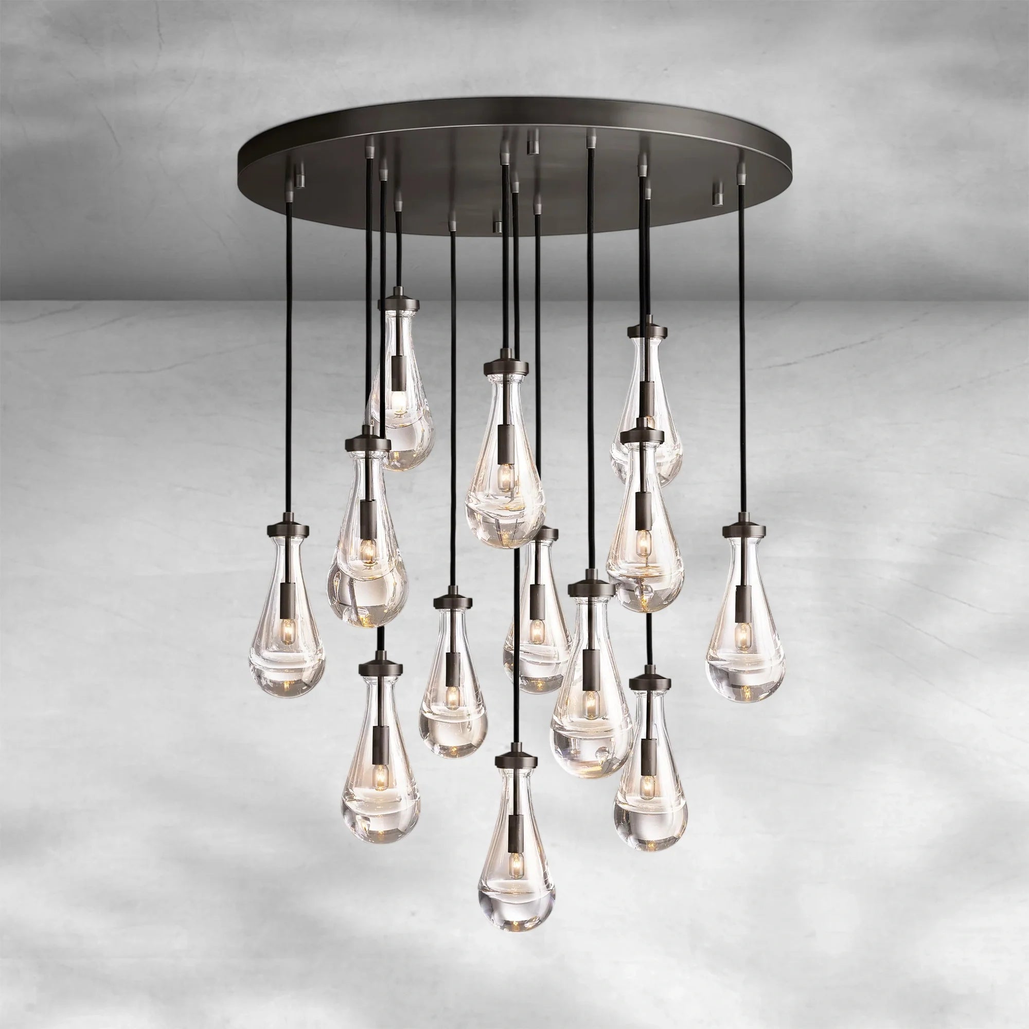 | Much like the rhythm of a rainstorm itself. Suspended from slim black cords, drops of blown glass encase the bulbs - creating the illusion of underwater illumination - and cast luminous ripples that wash across ceilings and walls. |