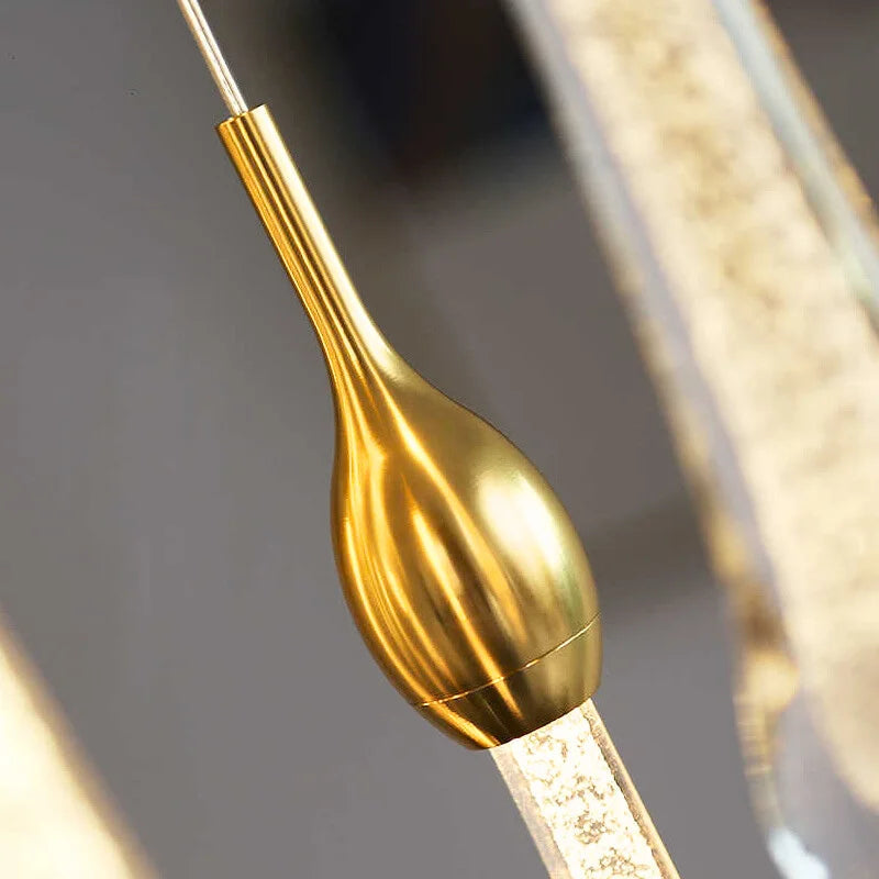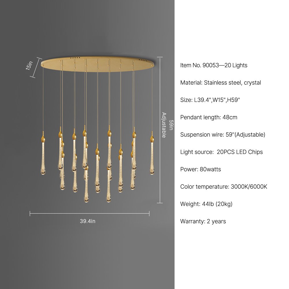 This elegant Dewdrop chandelier features delicate crystal droplets suspended from golden accents. The luminous glass creates a captivating glow, resembling shimmering raindrops frozen in time. This sophisticated lighting fixture adds a touch of luxury and warmth to any modern space, making it a stunning focal point in any dining room or grand interior.
