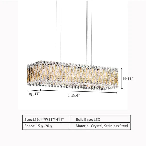 This chandelier features rectangular framework trimmed with numerous clear crystal pendants, that providing a particular counterpoint to the classic design.The crystal pendant extending from the edge adds a luxurious atmosphere to this lamp.The golden leaves attached between the crystal strings make the design of this chandelier richer and more sophisticated.Extra large size,perfect for modern dining room,kitchen island,etc.