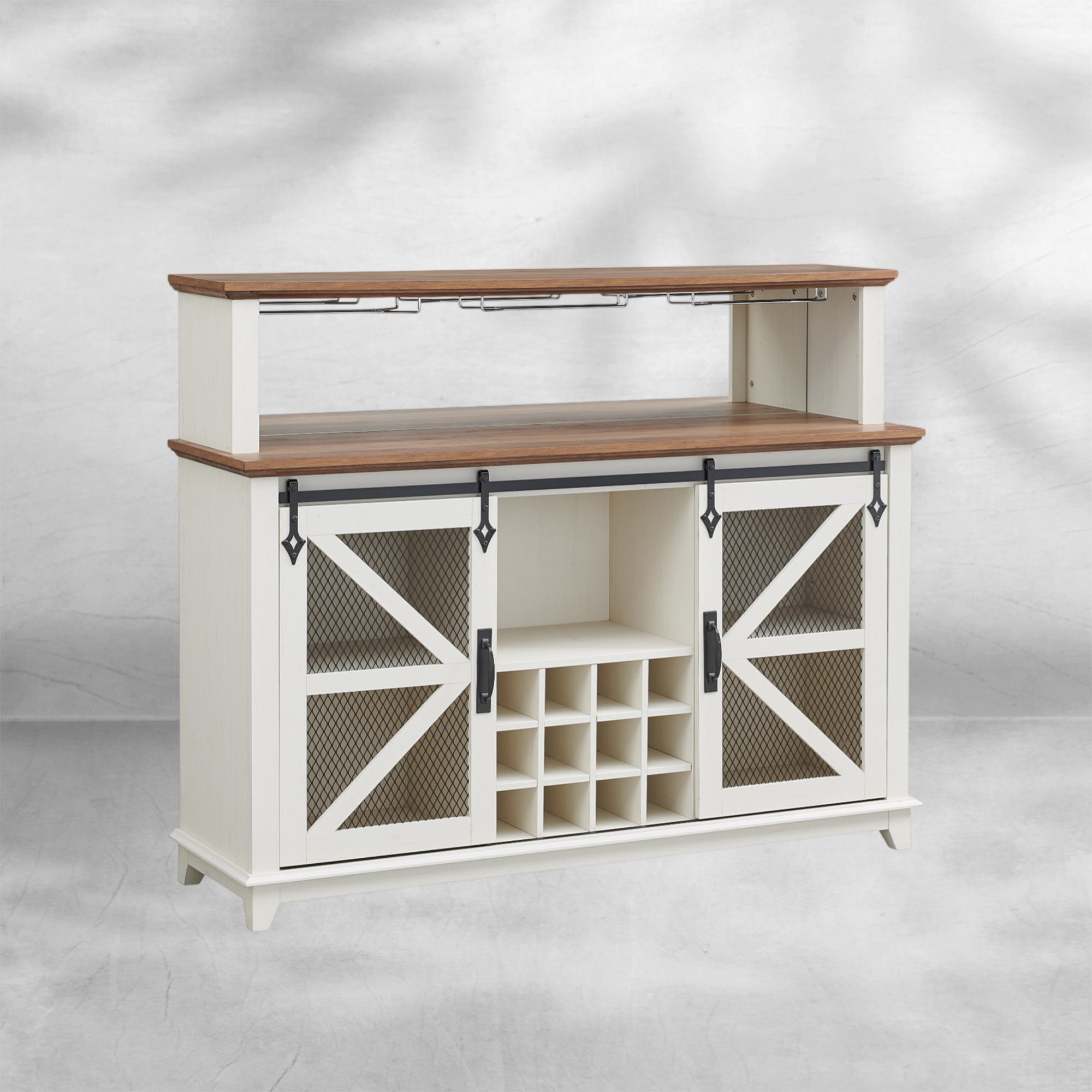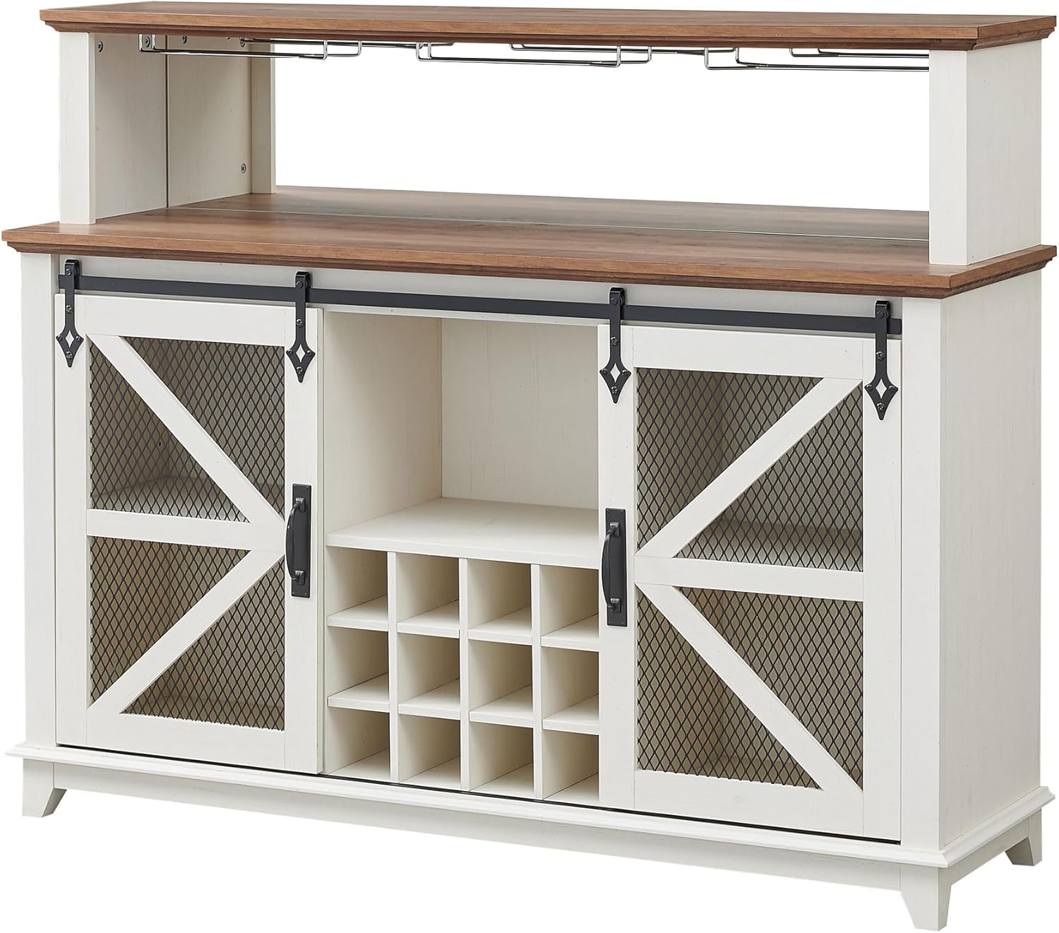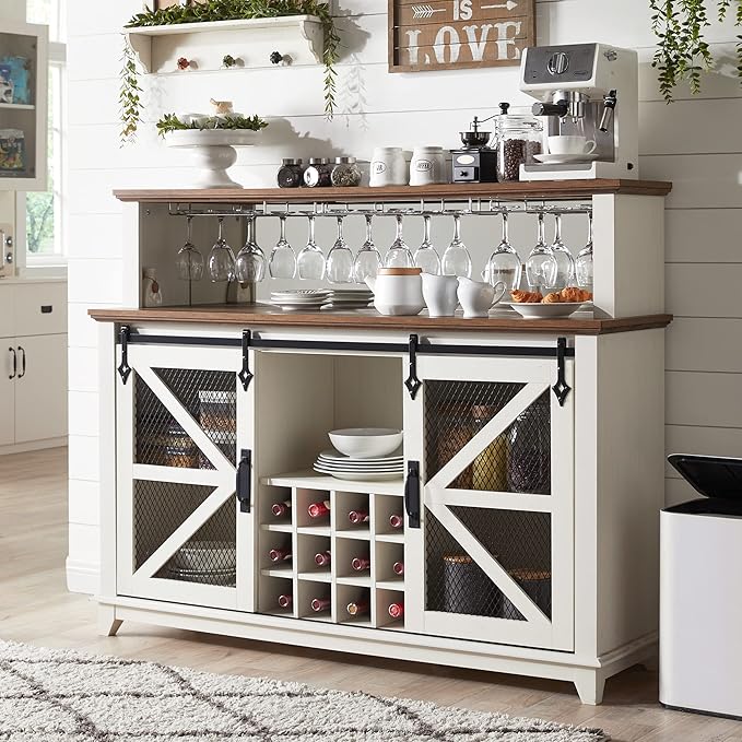Elevate your dining space with this farmhouse-style coffee bar cabinet, blending rustic charm and modern convenience. It features an eye-catching sliding barn door and integrated LED lights, creating a cozy ambiance. The cabinet offers ample storage with built-in wine and glass racks, plus additional shelving, all within a 55-inch frame. Perfect for showcasing your drinks and dinnerware while adding a touch of elegance with its antique white finish.