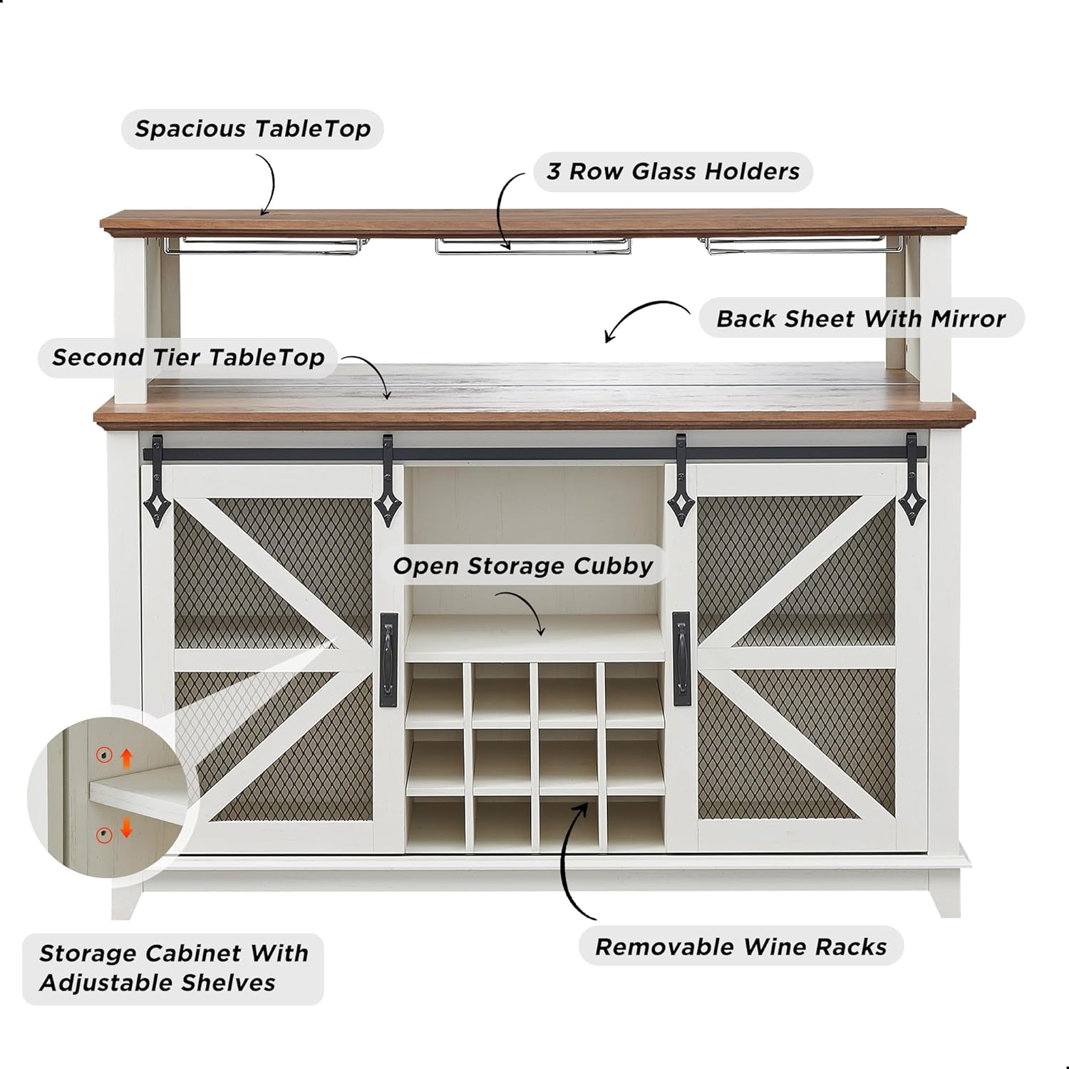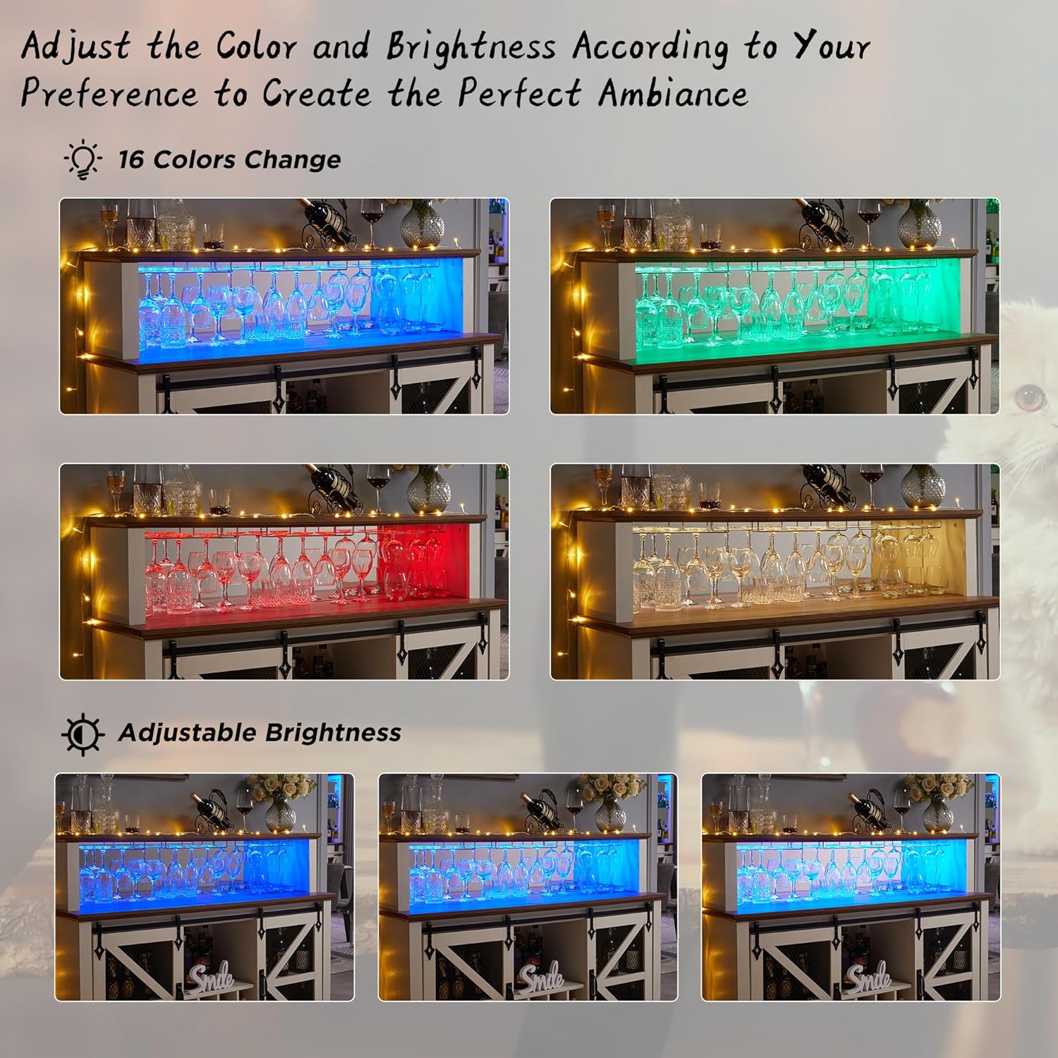 Farmhouse Coffee Bar Cabinet with LED Lights Antique White, 55-Inch