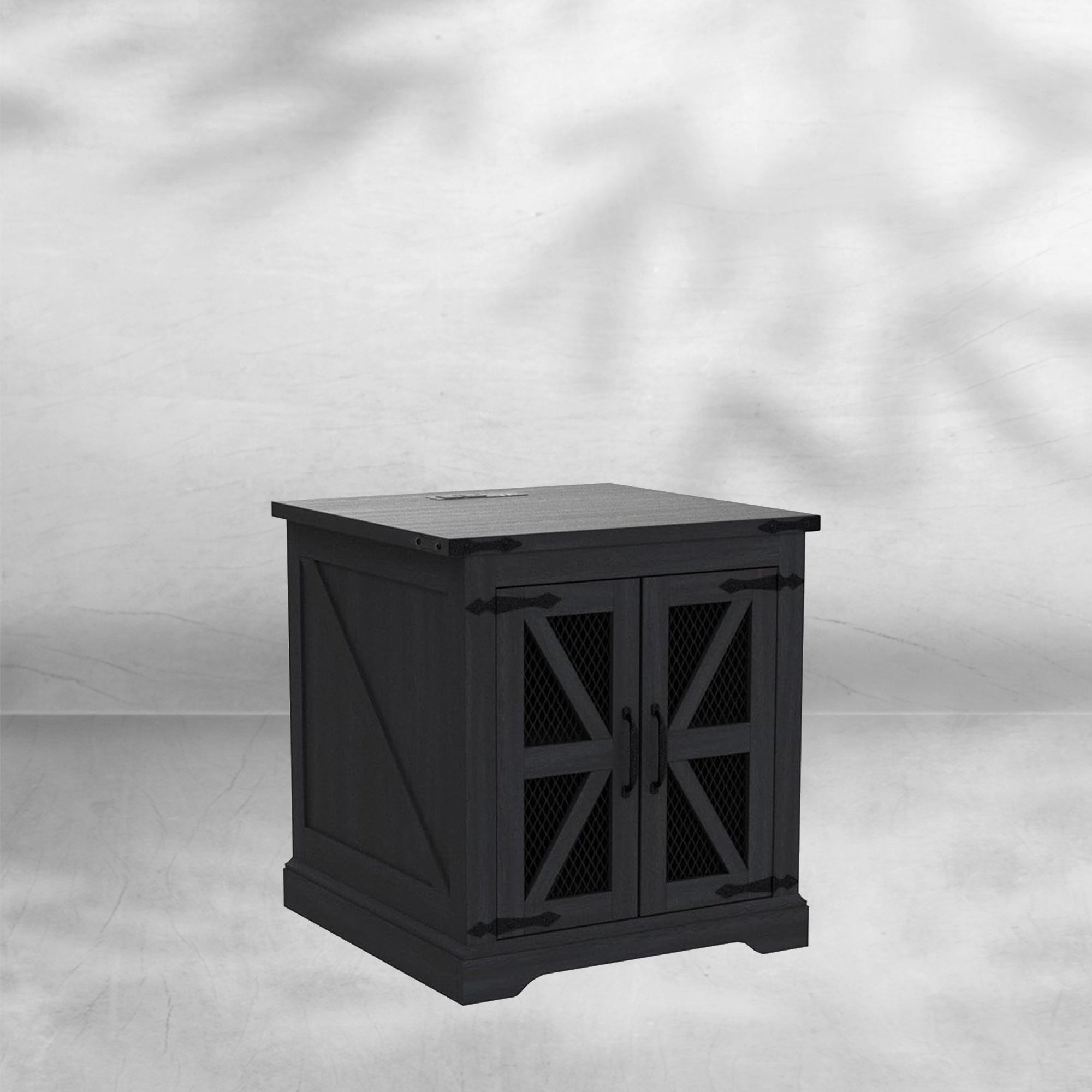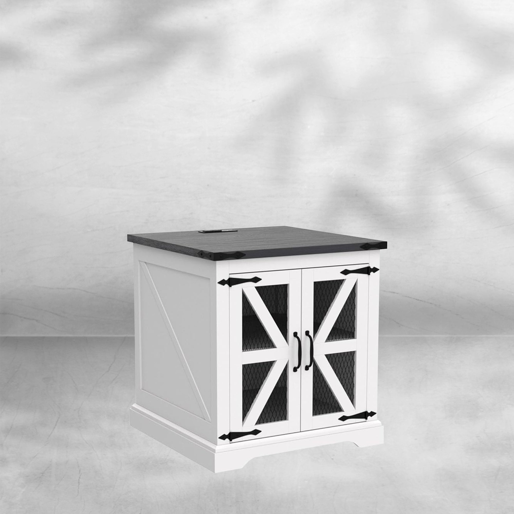 Add a touch of rustic charm to your living space with this farmhouse end table. It features a charging station, mesh barn door, and adjustable storage shelf. Perfectly sized as a sofa side table or nightstand for your living room, bedroom, or office. This rustic wood square table is both stylish and functional.