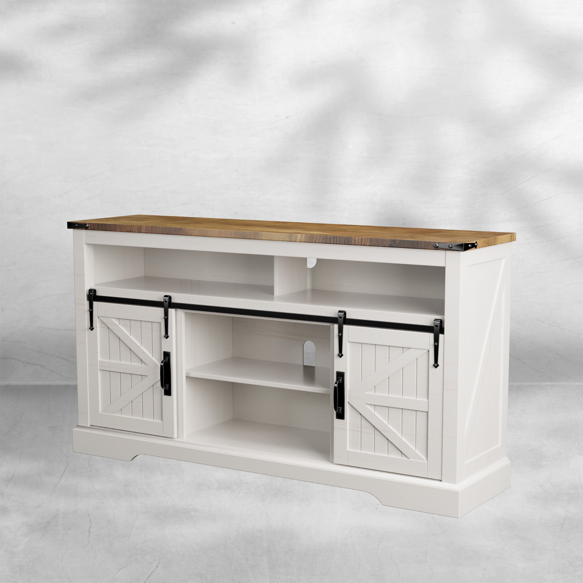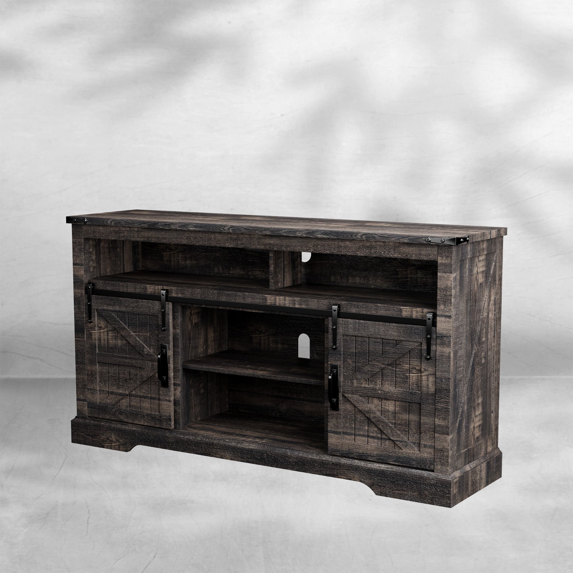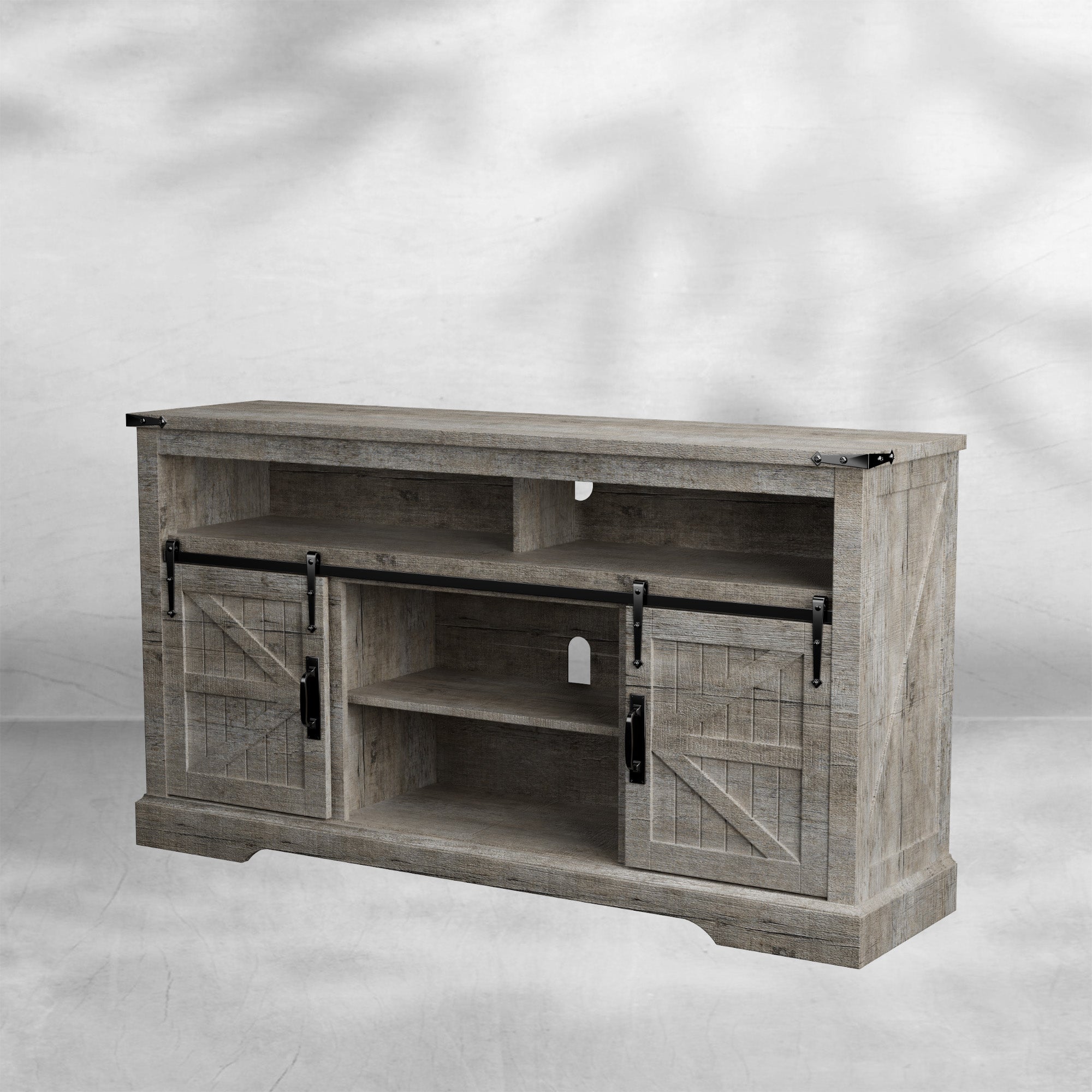 Elevate your living space with this farmhouse-style entertainment center, a perfect blend of rustic charm and modern functionality. The sliding barn door design adds a touch of country elegance while providing easy access to your media components. Organize your living room with its spacious storage shelves. Designed to accommodate TVs up to 65 inches, it's an ideal centerpiece for your home entertainment setup.