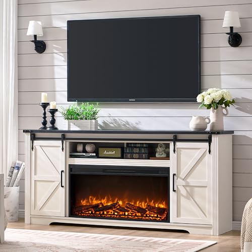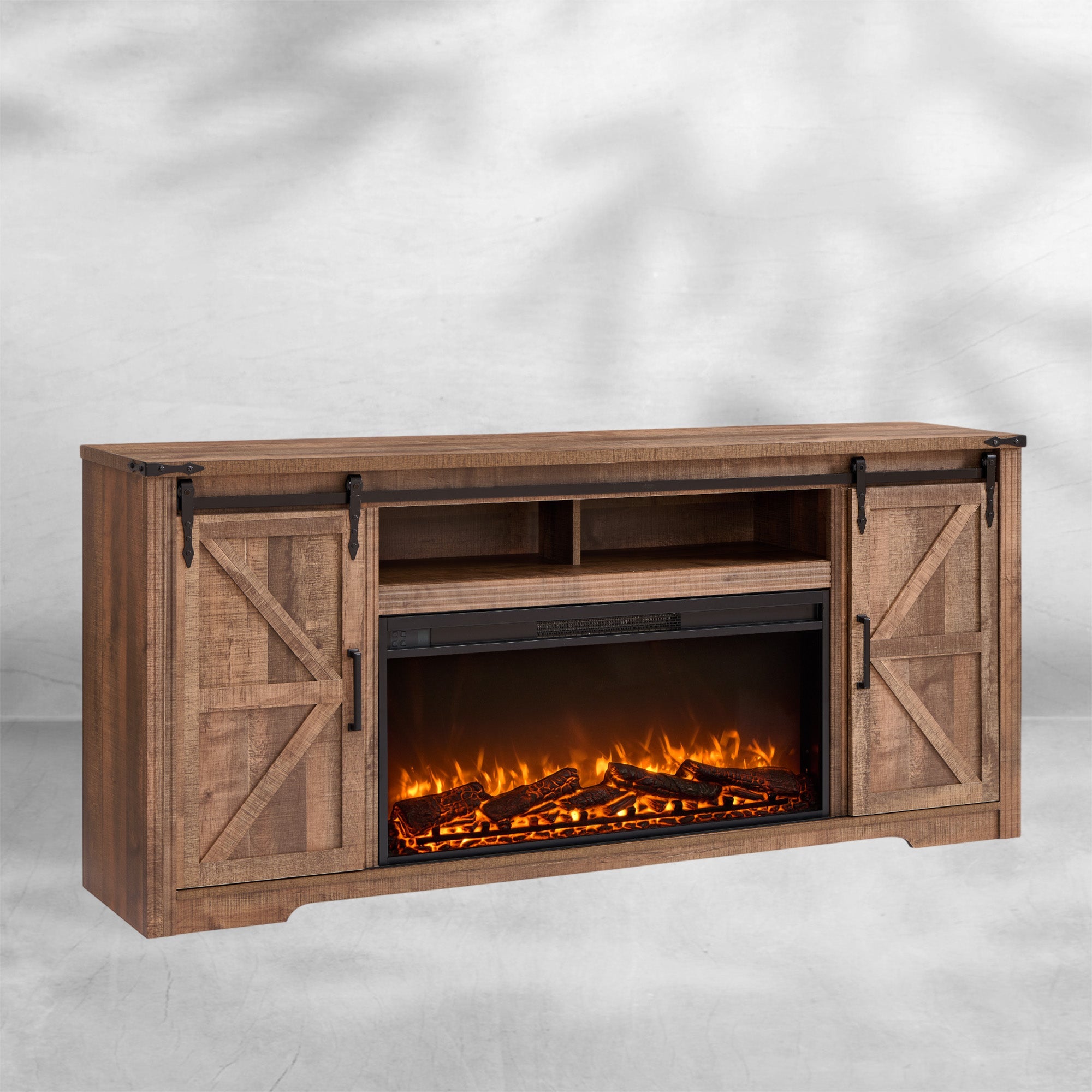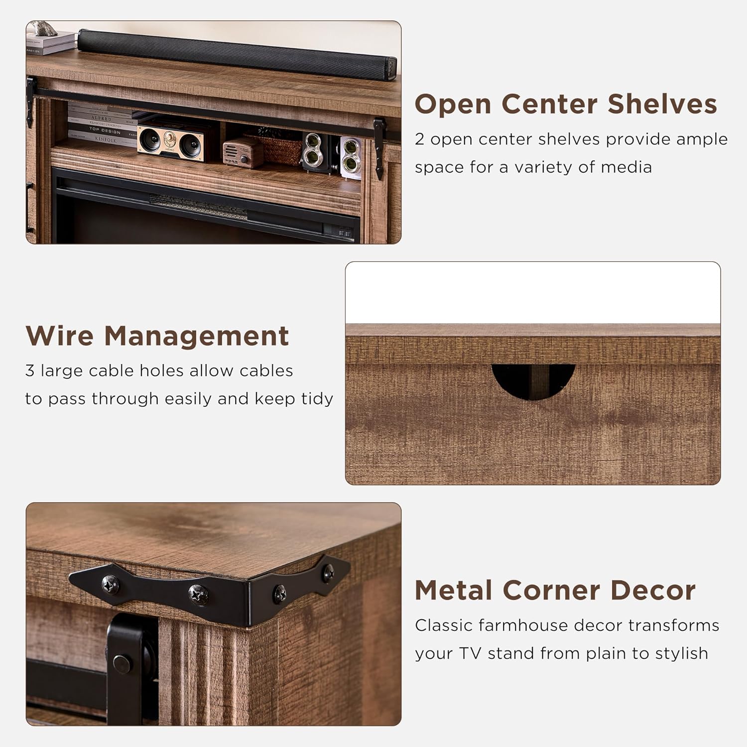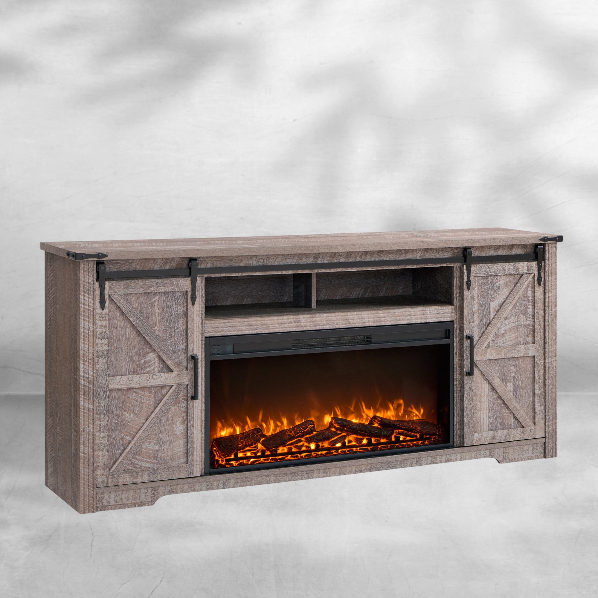 Cozy up your living room with this farmhouse-style fireplace TV stand! Designed to accommodate up to an 80-inch TV, this modern media console features a 36\" electric fireplace to keep you warm. It also includes sliding barn doors and storage drawers for all your media essentials. This light brown entertainment center is the perfect blend of style and functionality.
