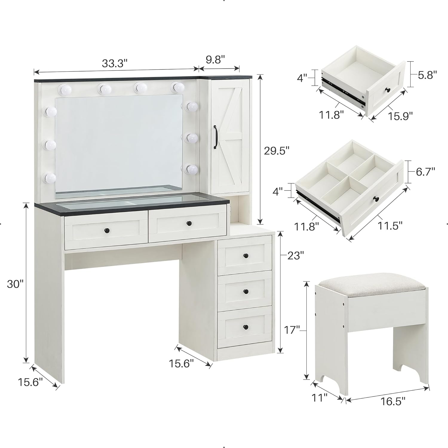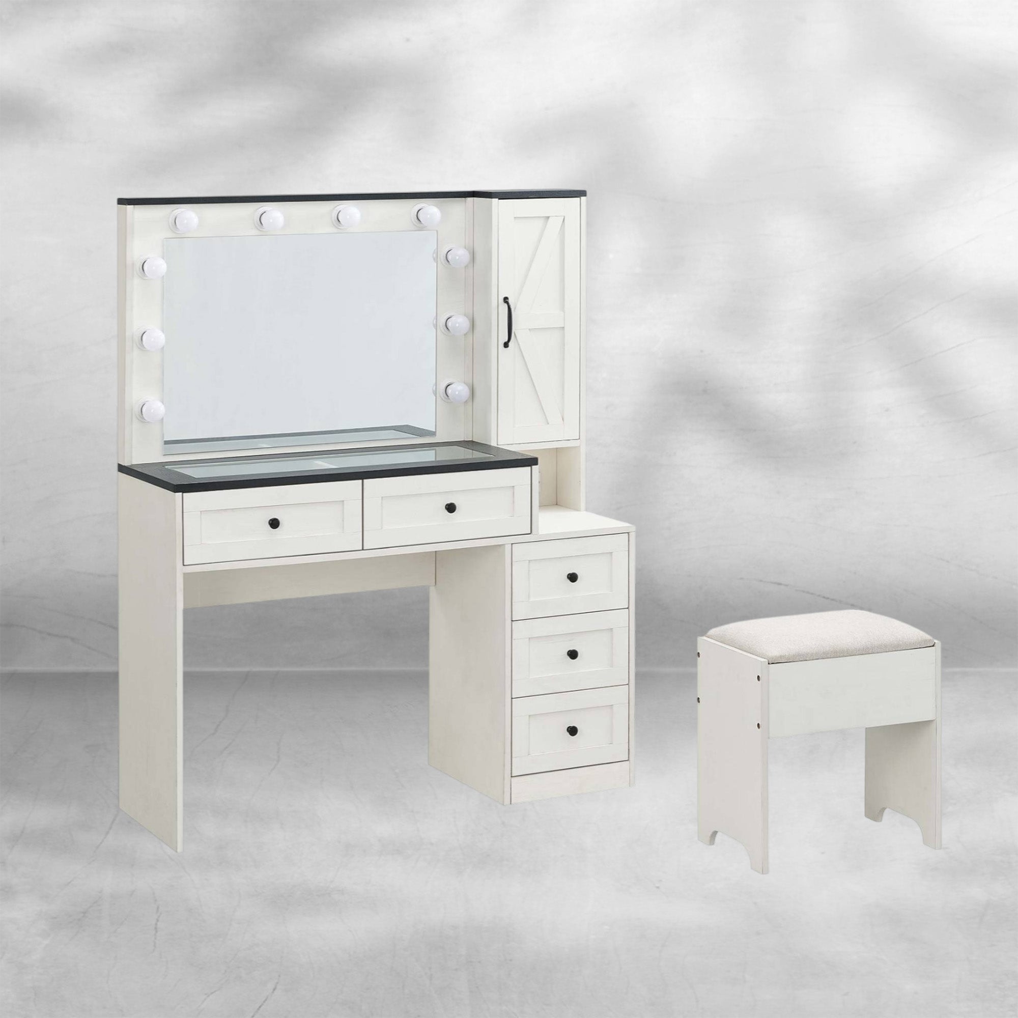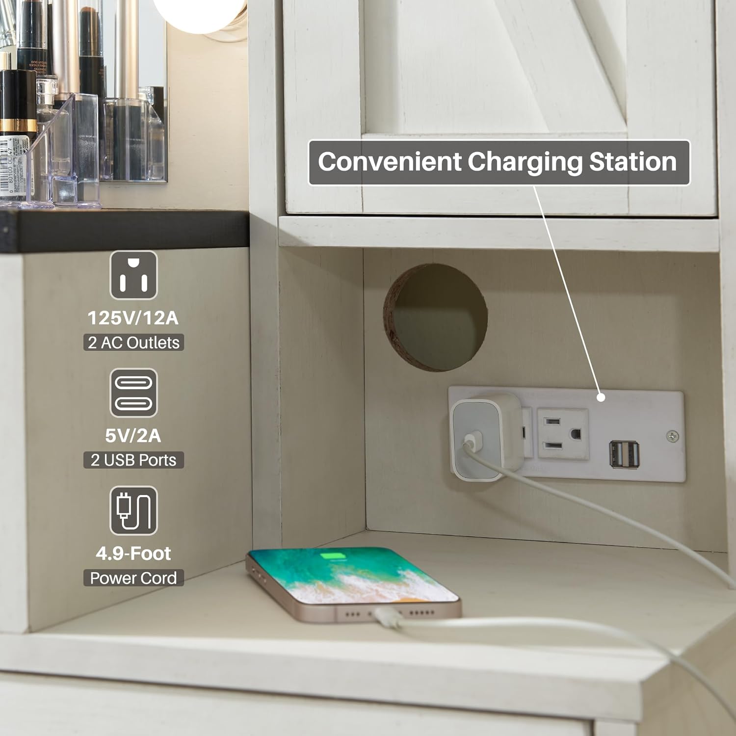 Elevate your daily beauty ritual with this farmhouse-style vanity desk, it comes complete with a lighted mirror to ensure flawless makeup application every time. The built-in charging station keeps your devices ready for action. Ample drawer space allows you to organize all your essential beauty must-haves. With its charming design and practical features, this makeup table set turns any space into a personal glam station.
