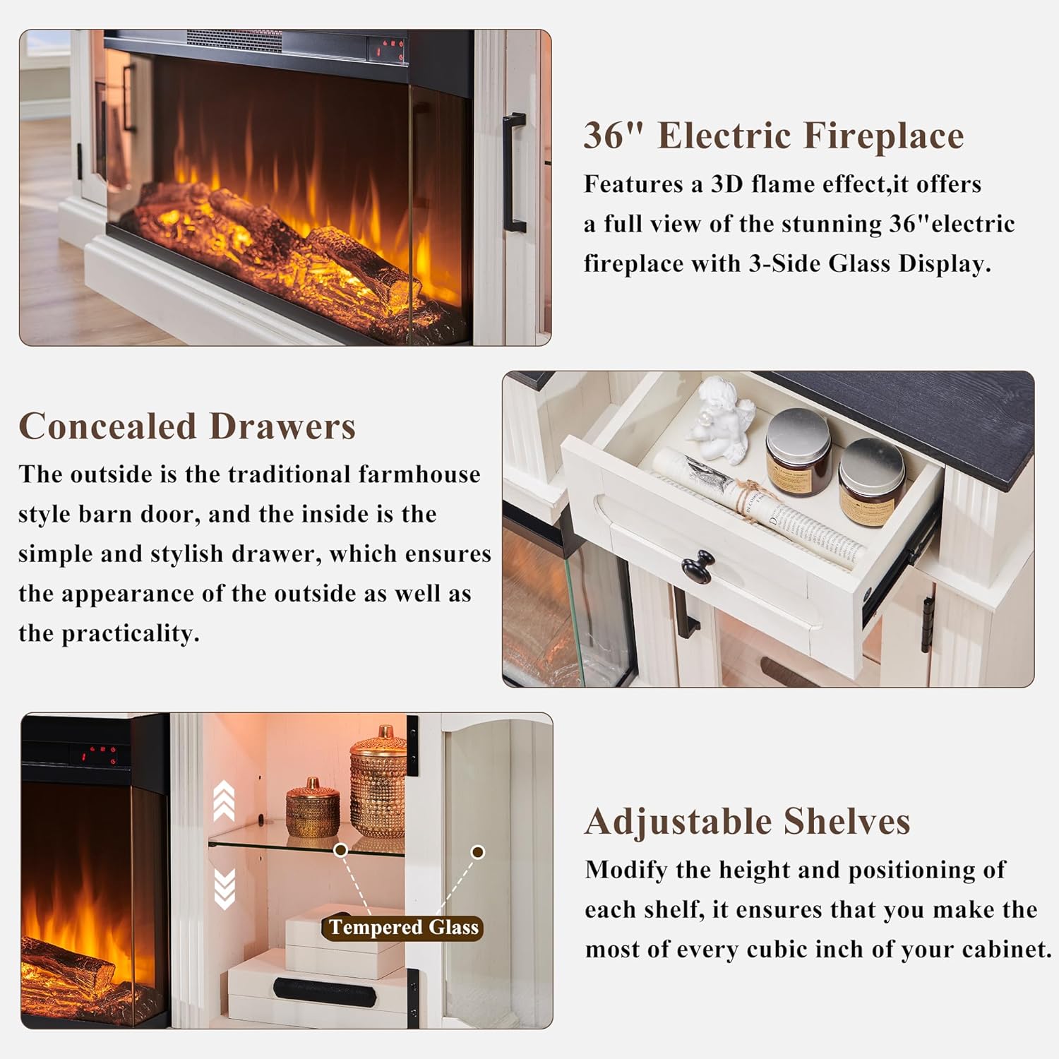 Farmhouse TV Stand with 36" Fireplace & LED - Antique White