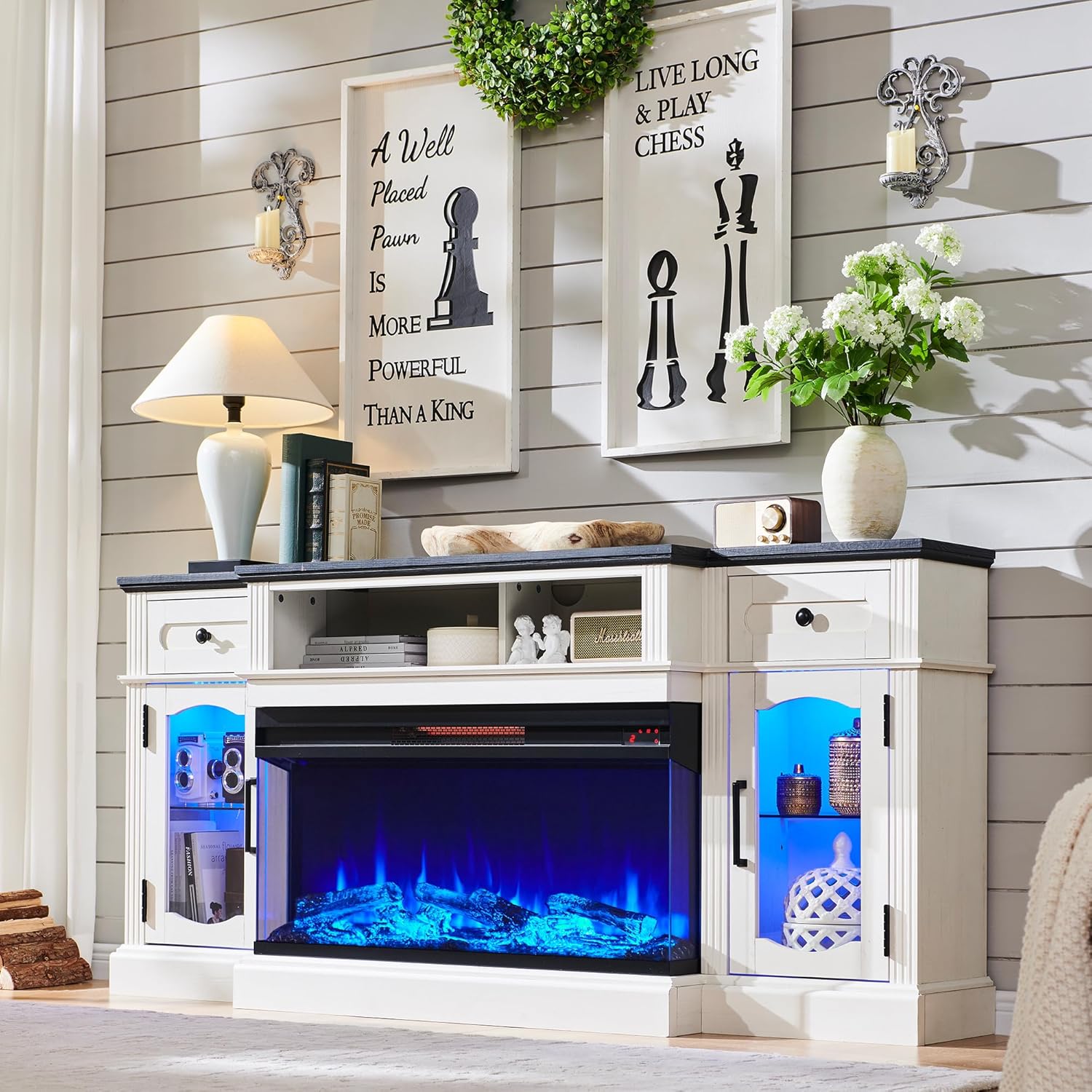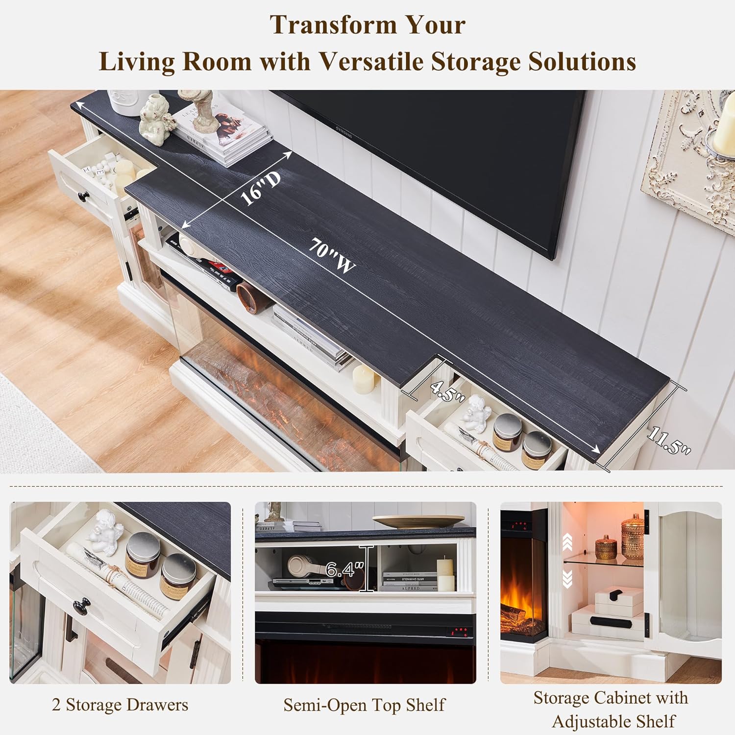Create a cozy and inviting entertainment area with this farmhouse-style TV stand. It features a stunning 36-inch electric fireplace with three-sided glass, providing a mesmerizing view of the flames from multiple angles. The built-in LED lights add a touch of modern flair, creating a captivating ambiance. This 70-inch console offers ample storage for your media components and accessories.