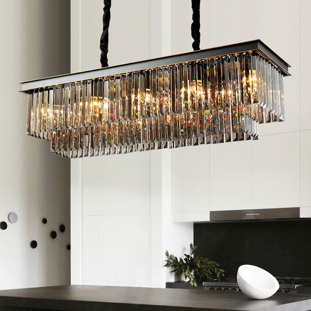 Fashion Kitchen Island Crystal Chandelier In Black/ Smoky Gray Finish Two Tiers Rectangle Chain Pendant Light/ Lamp For Long Dining Table