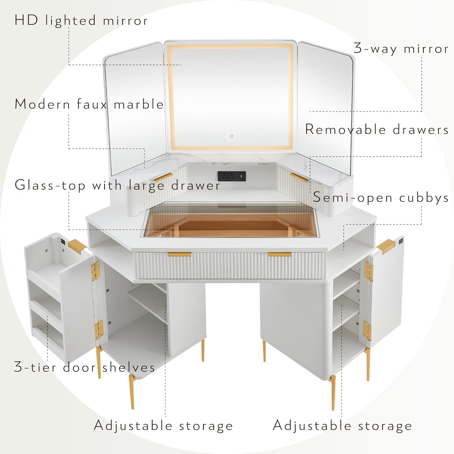 Transform your corner into a glam station with this stunning vanity desk! The fluted details and glass top give it a luxurious feel, while the built-in lights ensure you're always photo-ready. With plenty of drawers and storage cabinets, you can keep all your beauty essentials organized and within reach. This corner vanity desk is the perfect blend of style and function