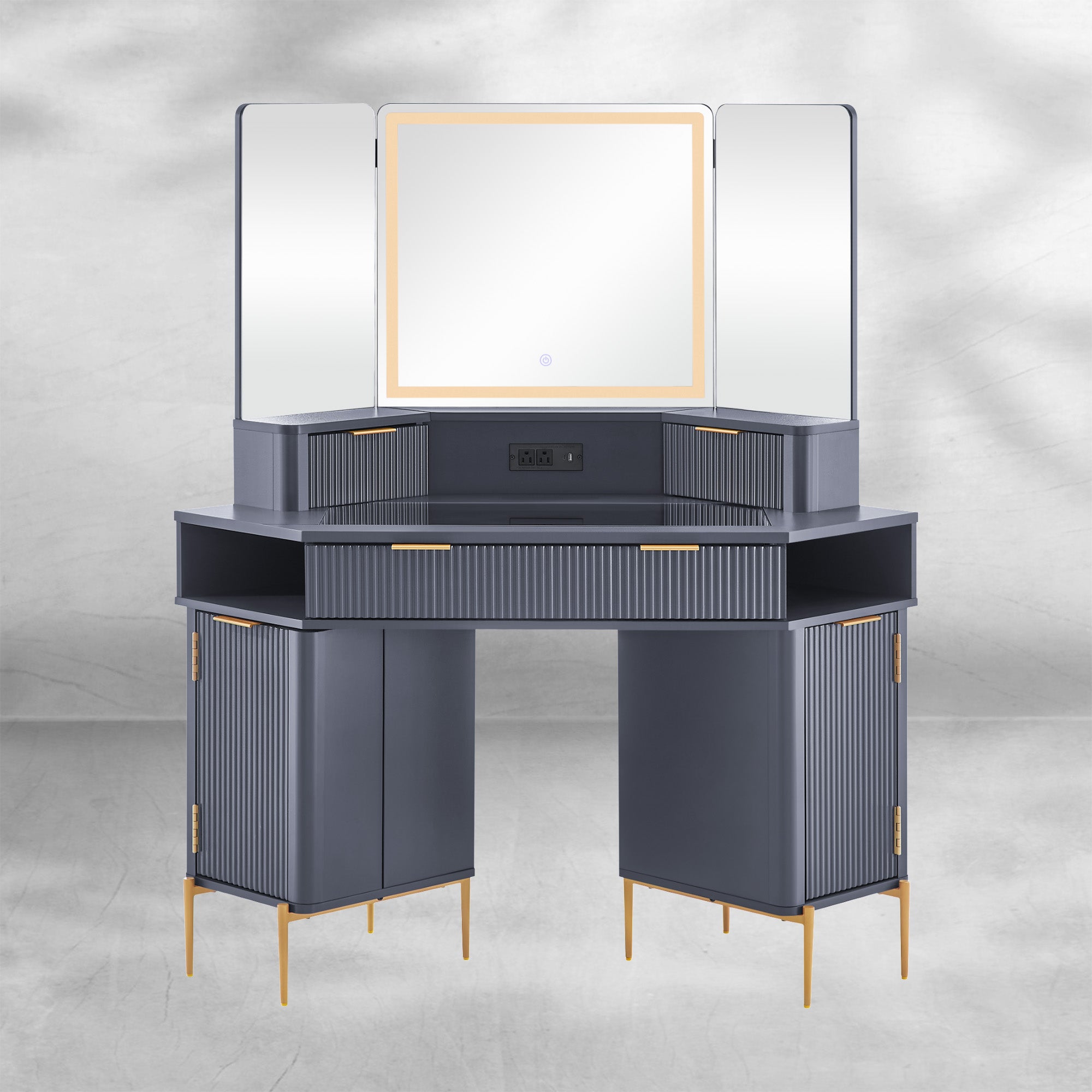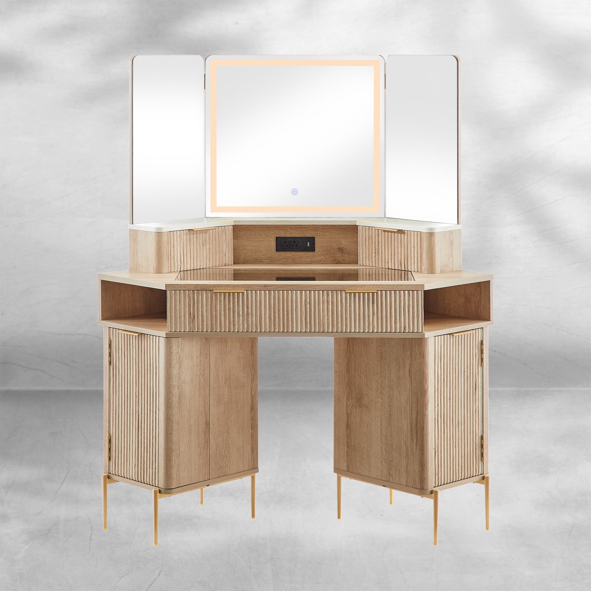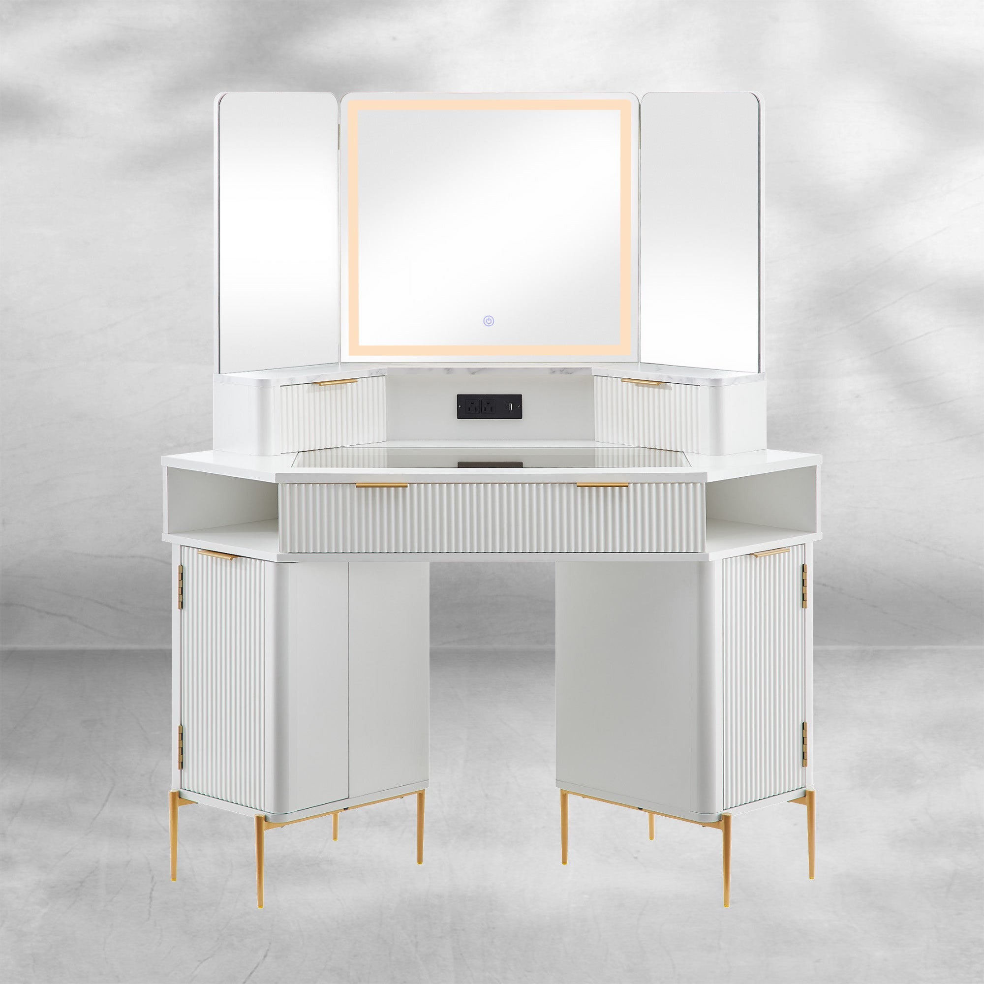 Fluted Corner Vanity Desk 48" with Lighted Mirror and Charging Outlet