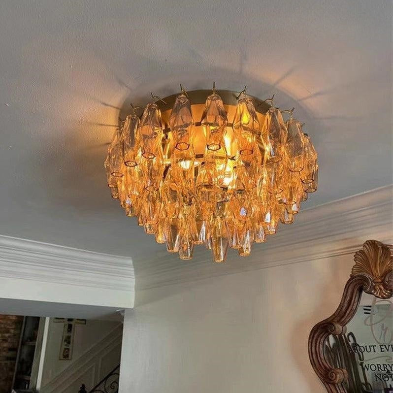 This Flushmount is suspended from a tiered steel frame with dozens of hand-blown glass polyhedra on individual hooks. Illuminated from within, the faceted chandeliers dramatically reflect and refract light. A tribute to the Italian lighting style of the 1950s with this minimalist style. |