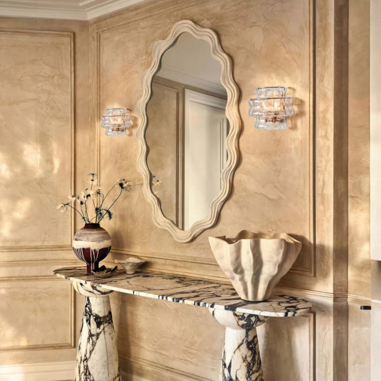 Inspired by famously adorned Italian glass, our Ghiaccio Lighting Collection artfully diffuses light through pieces of curved, textured glass. Complemented by a plated-brass finish, Ghiaccio elegantly illuminates any room.