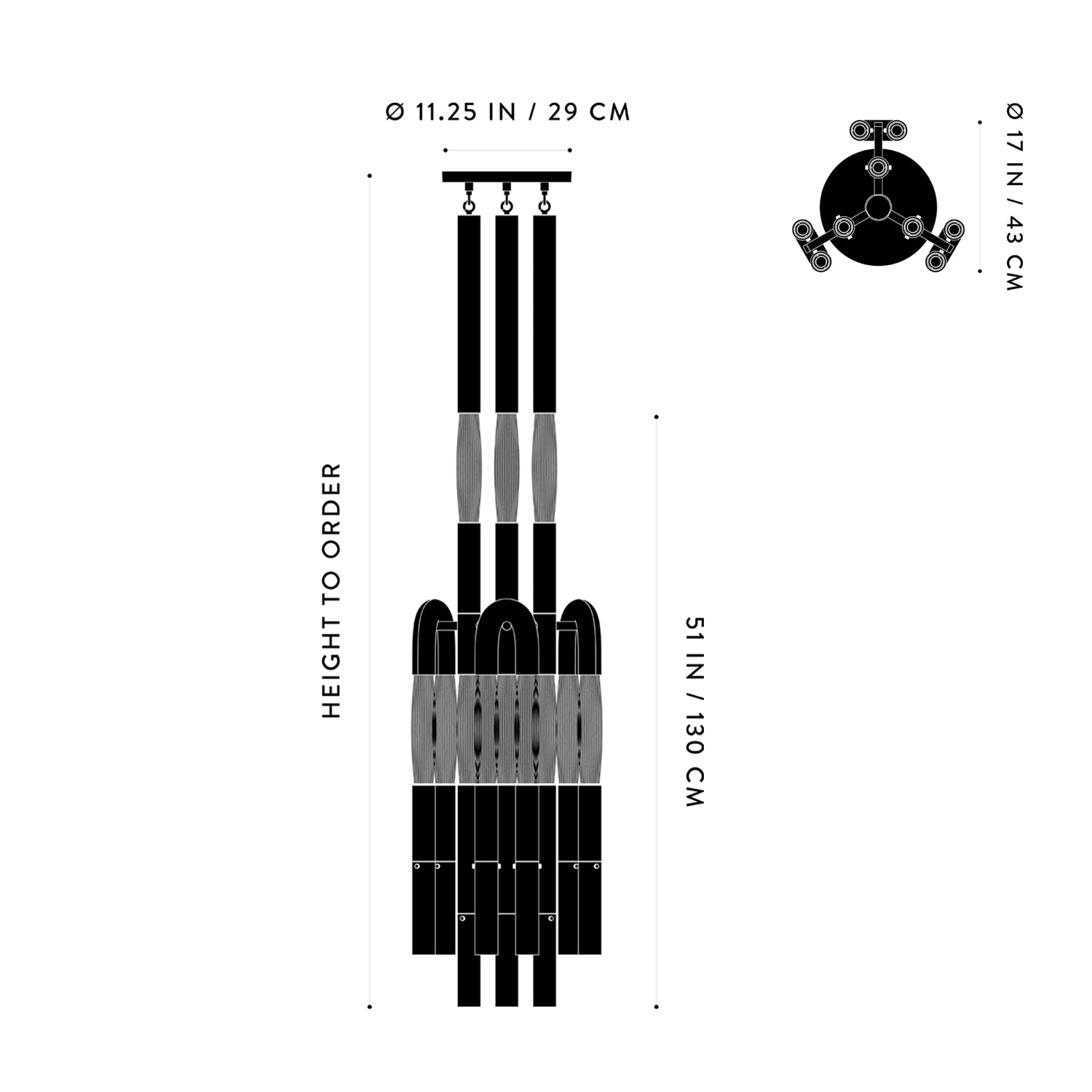 - Overall: 17"D × 11.25"W × 51"H (HEIGHT TO ORDER)