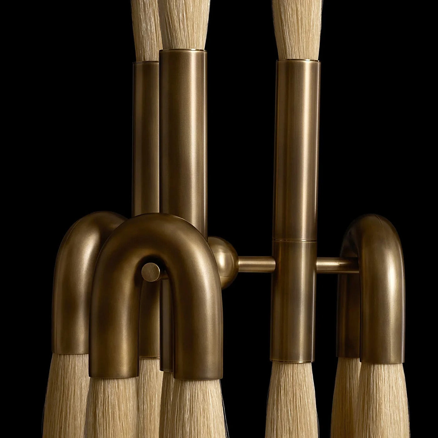 This Heritage Horsehair 9-Light Pendant Lamp combines horsehair, brass, and etched glass for a unique design and exquisite materials. The warp of the horsehair combines with the brass body of the lamp to create a visual effect that is both sturdy and elegant.