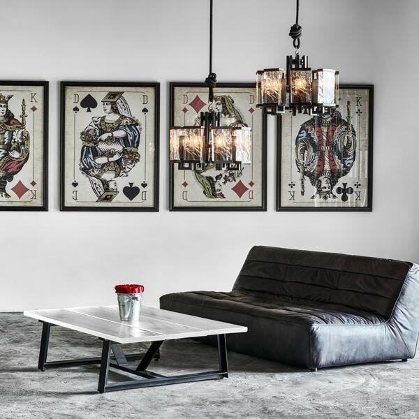 This powerfully bracing design features polished glass that has been uniquely textured by extreme heat to resemble blocks of frozen ice. Each block is lit from behind to accentuate its rugged crystallised swirls, and held in an industrial matt black frame. A formidable conversation piece, to proverbially break the ice with new found friends over dinner.