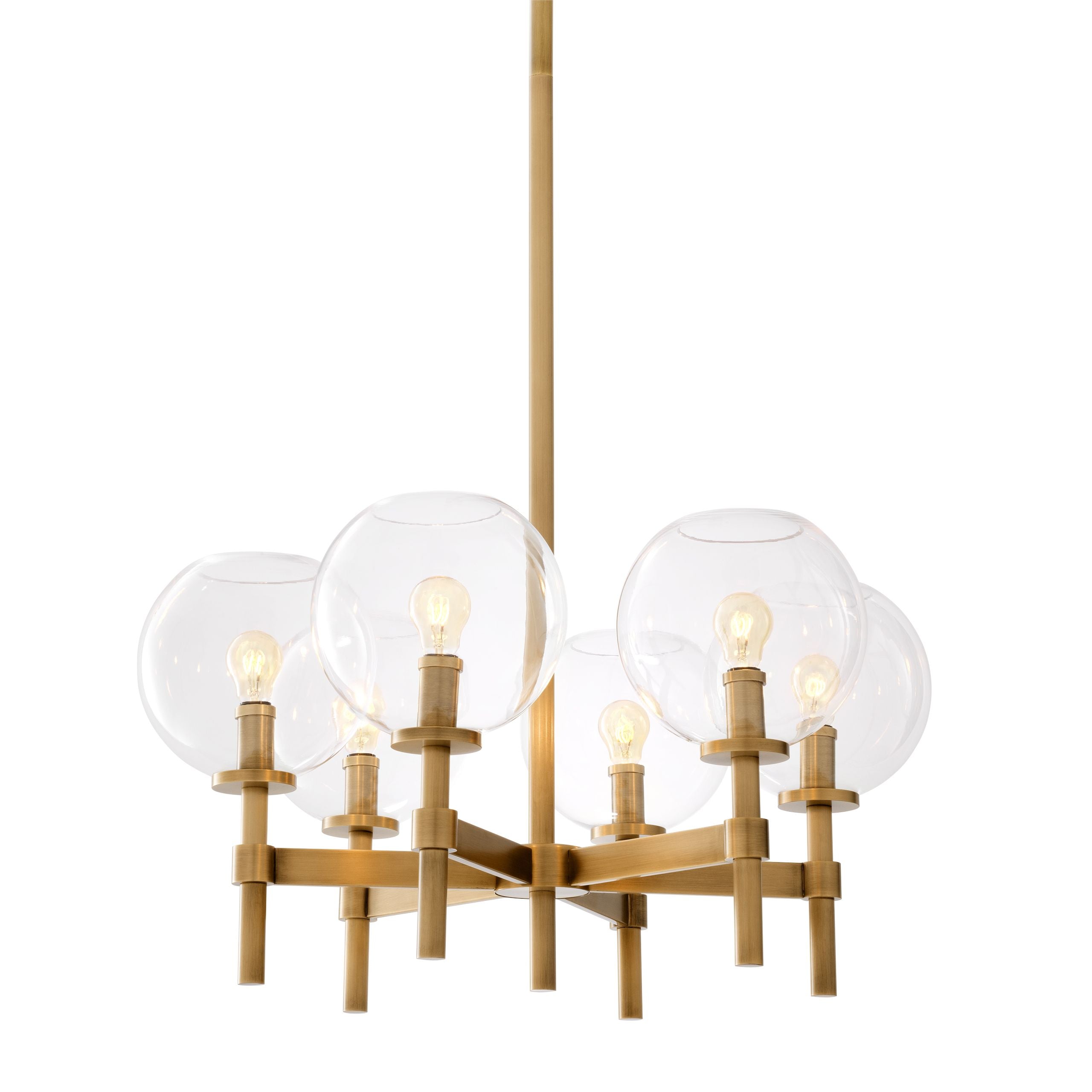 Illuminate your living room interior in contemporary style with the Jade S Chandelier. This lovely luminaire has an antique brass finish. From a central stem 6 arms extend in every direction. Clear glass globe shades disperse the light from the bulbs (not included) throughout your space.