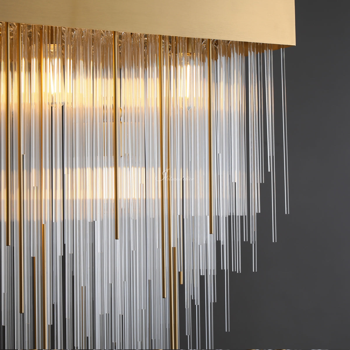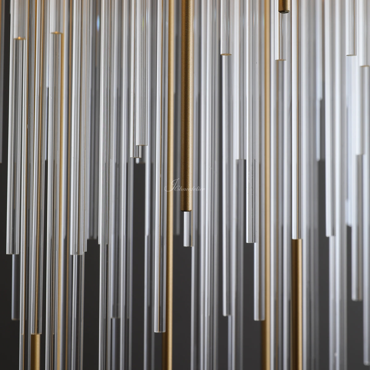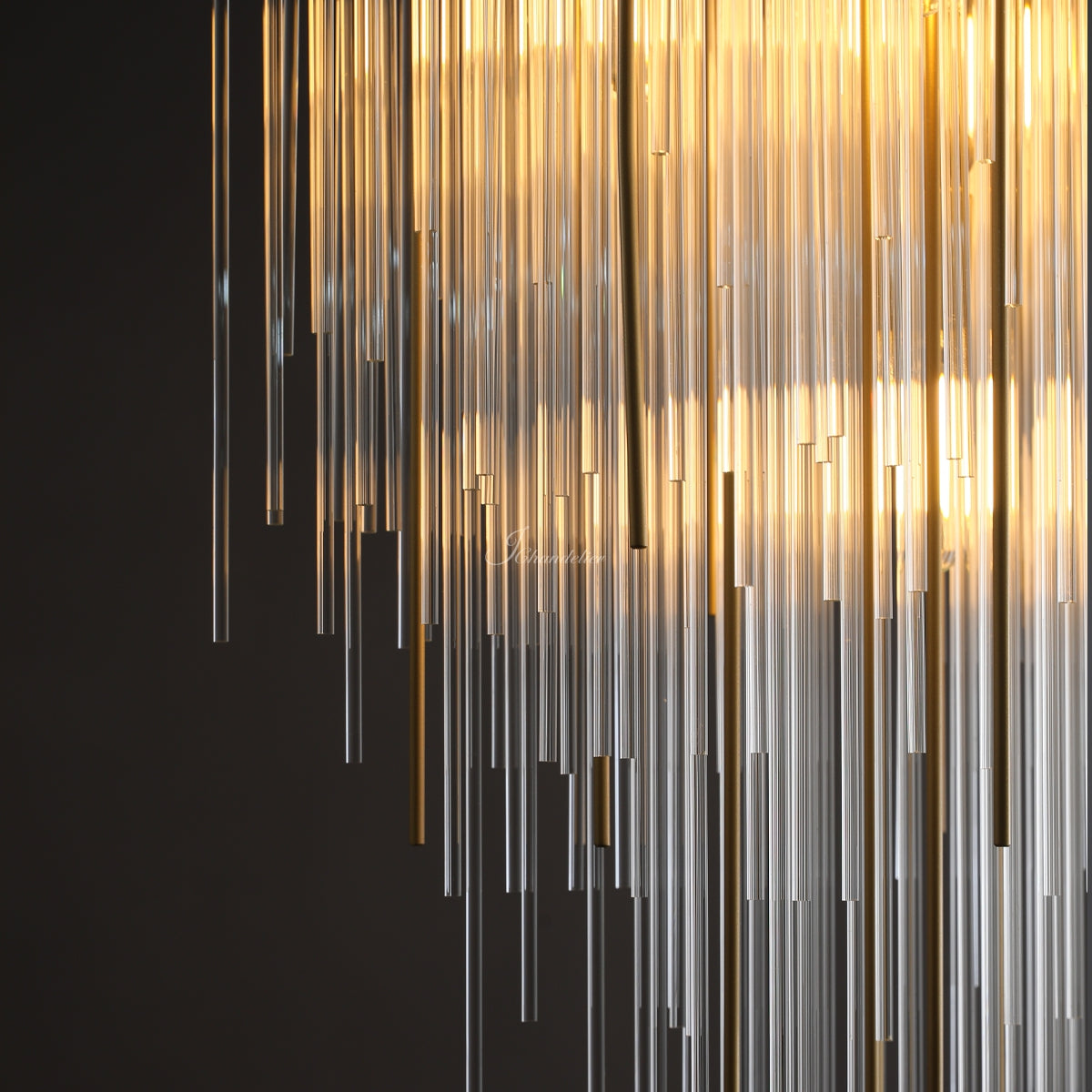 In this collection, crystal and metal rods cascade and coexist as hundreds of slender tubes are hung asymmetrically from a smooth canopy, refracting dramatically and artfully evoking rainfall frozen in time. |
