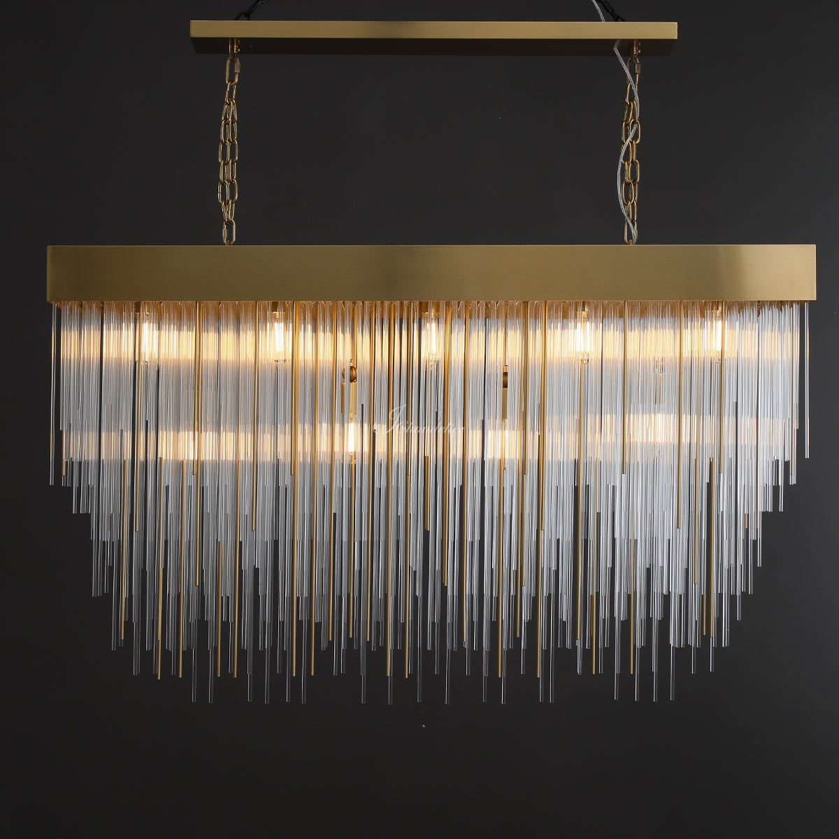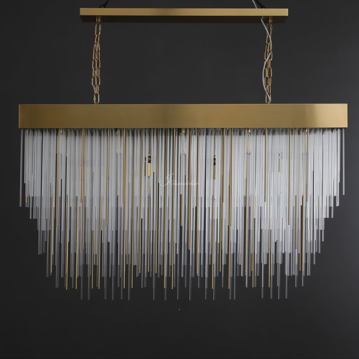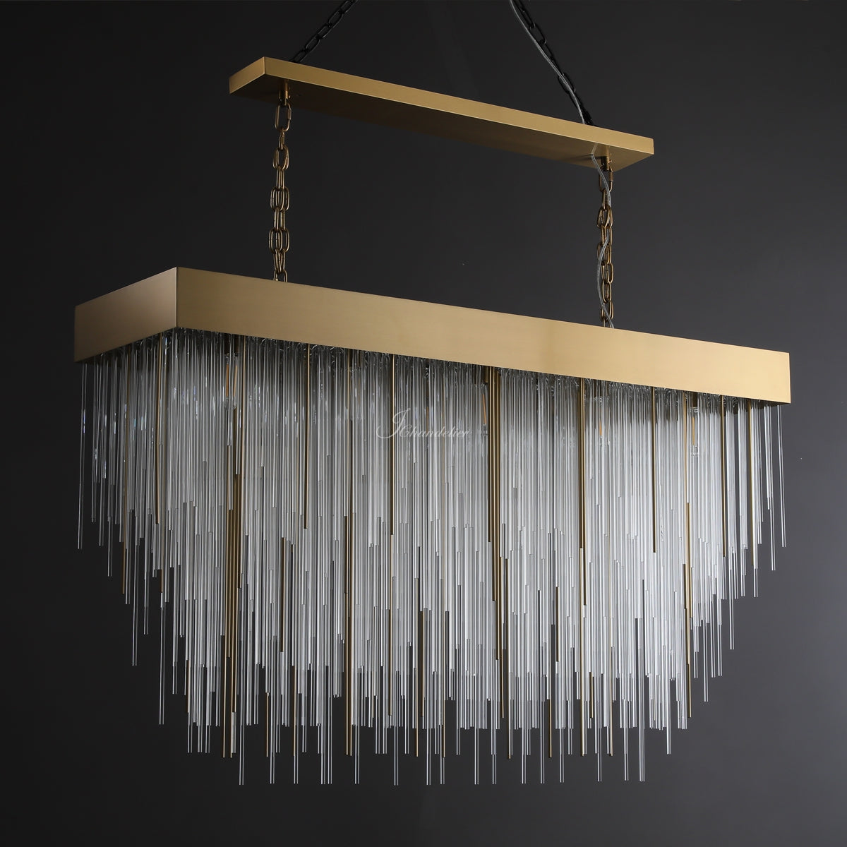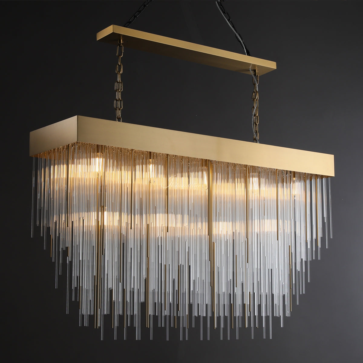 In this collection, crystal and metal rods cascade and coexist as hundreds of slender tubes are hung asymmetrically from a smooth canopy, refracting dramatically and artfully evoking rainfall frozen in time. |