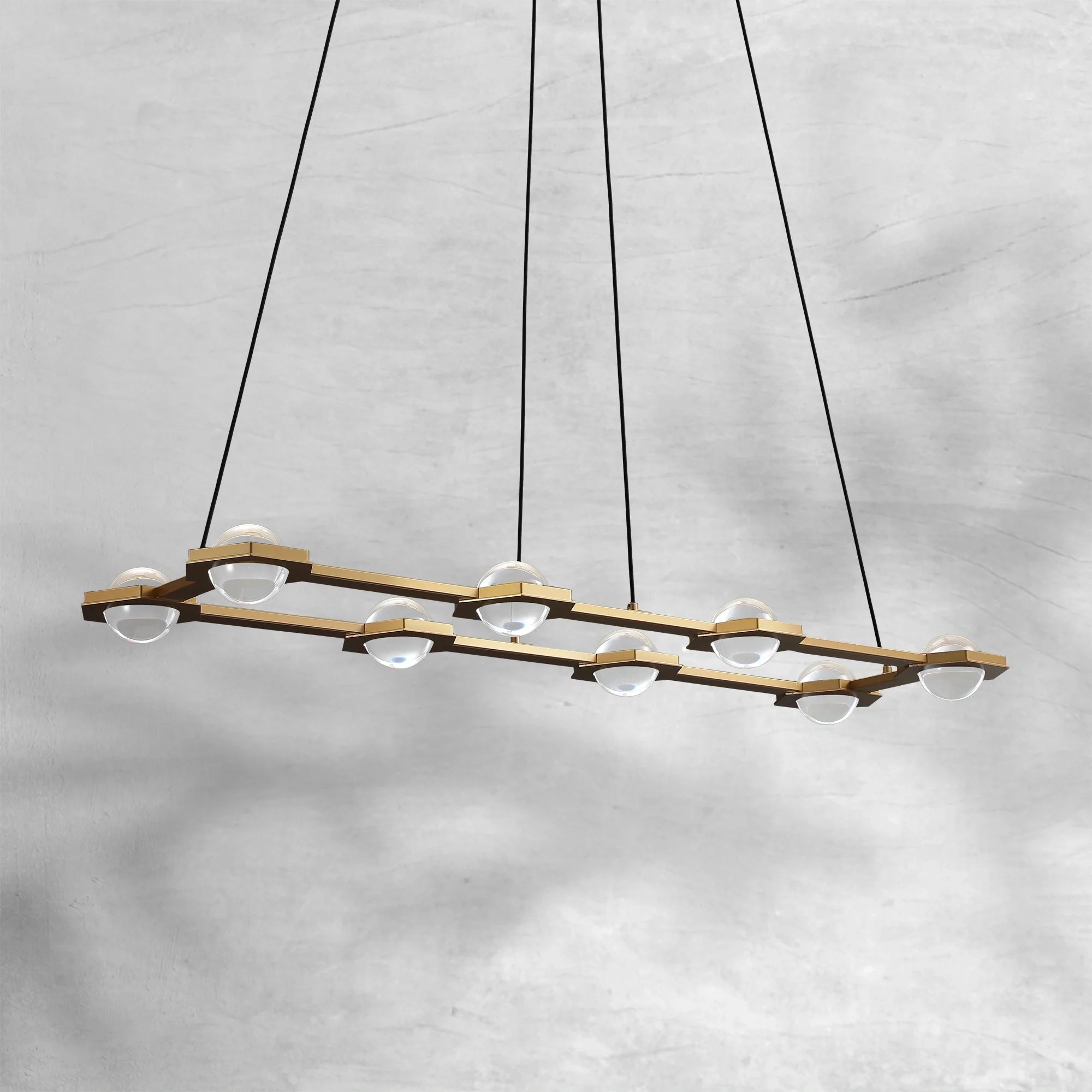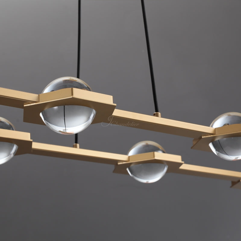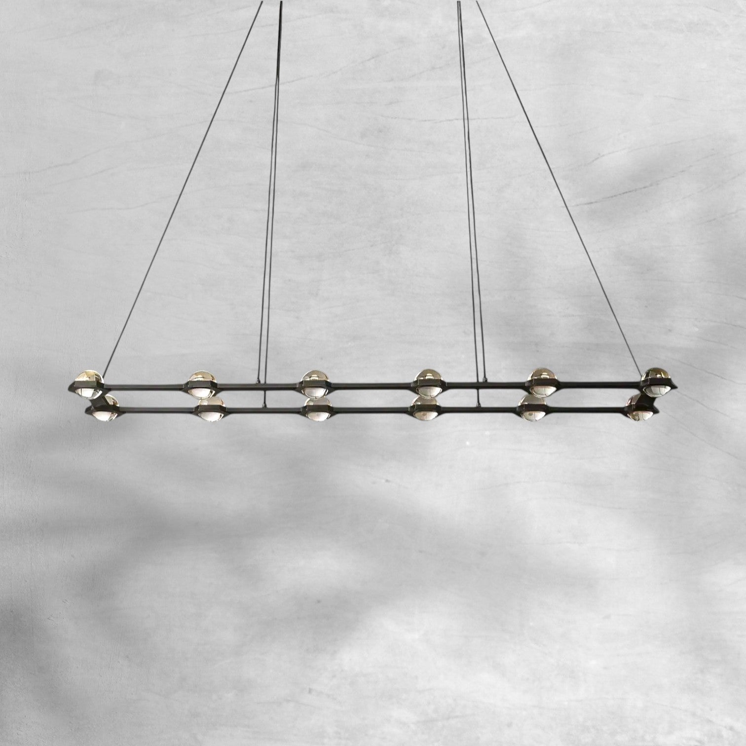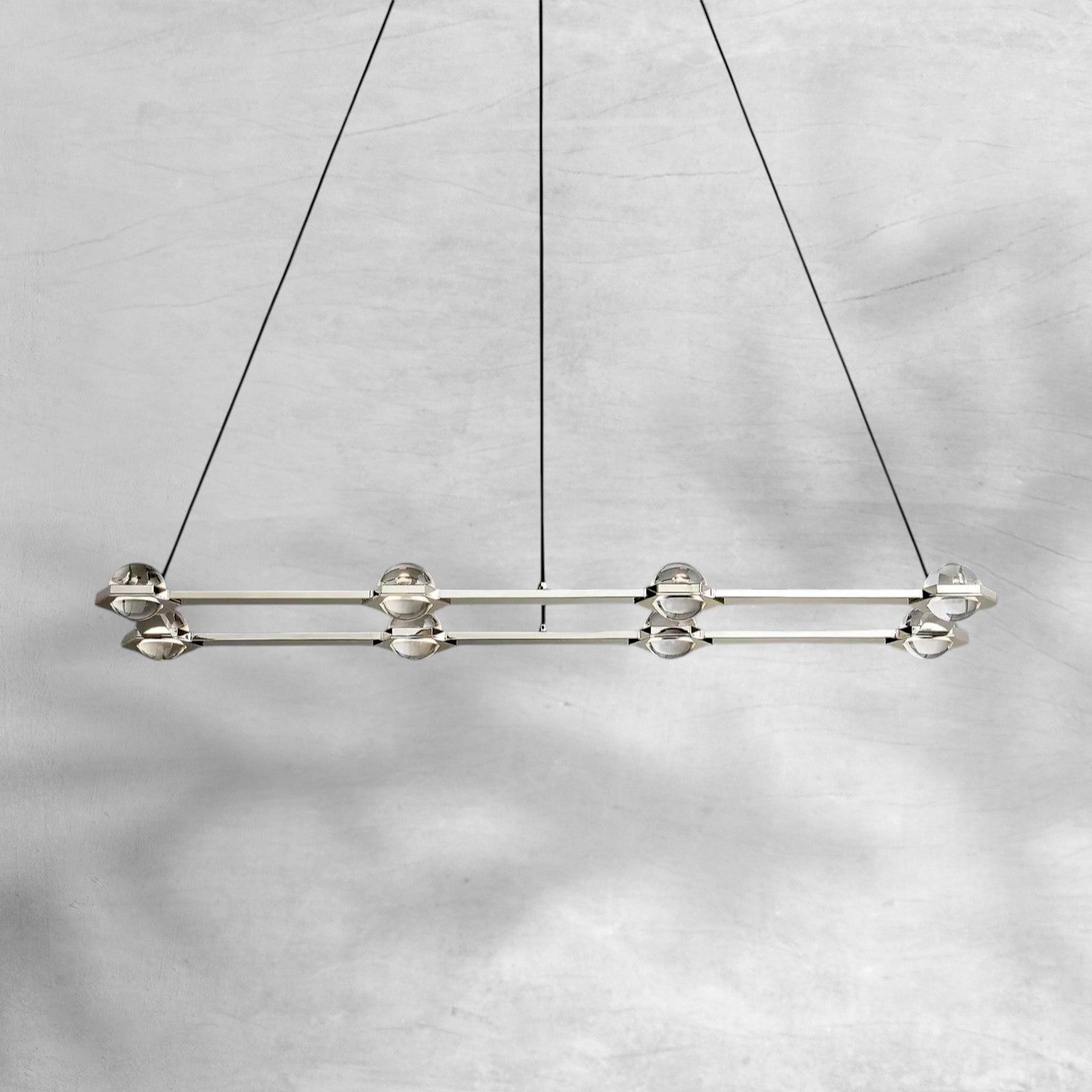 The collection features lighted crystal orbs, suspended in hexagonal fittings within a flat metal frame. The design was inspired by plans for the cenotaph of Sir Isaac Newton drawn by 18th-century architect Etienne Louis Boullée, a visionary ode to physics reinterpreted in a stunning contemporary form. |
