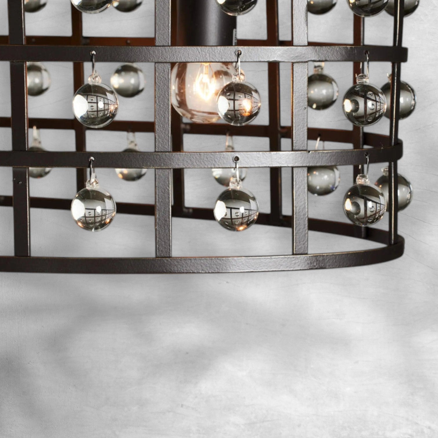 - Industrial chic meets modern flair in our eye-catching La Cage Lighting Collection. Crafted in Italy, this fixture’s iron cage frame with antiqued patina is inspired by vintage factory lighting. Glass crystal spheres add unexpected glamour.