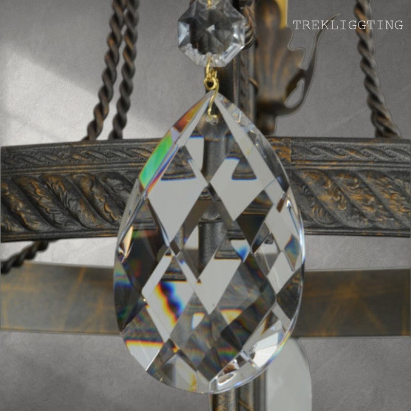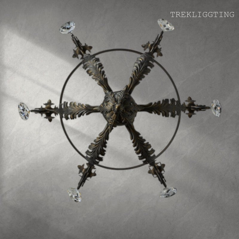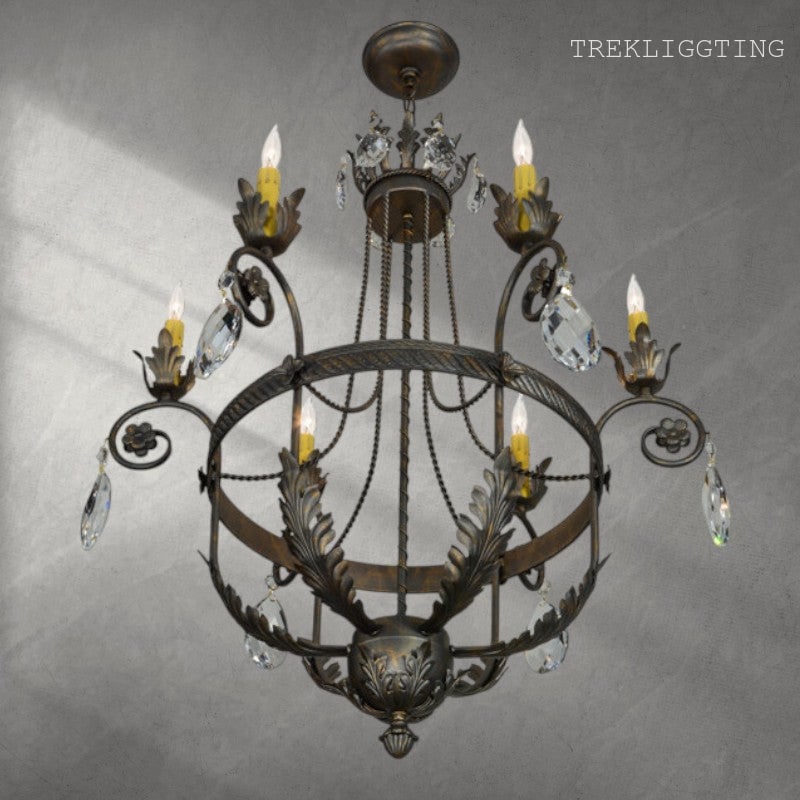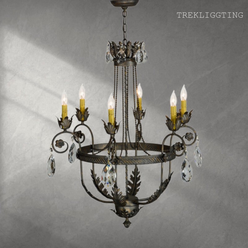 xquisite styling and luxurious charm are reflected in the Antonia Chandelier, which is adorned with 6 Amber faux candlelights perched on floral bobeches with scrolled arms. The lush decorative accents, including Acanthus leaves, frame and Hand-forged Iron hardware are featured in a French Bronze finish and enhanced with Crystal droplet accents. The fixture features quality materials and hand detailed American craftsmanship perfected by years of time honored artistry, passed down from generations of highly skilled artisans.