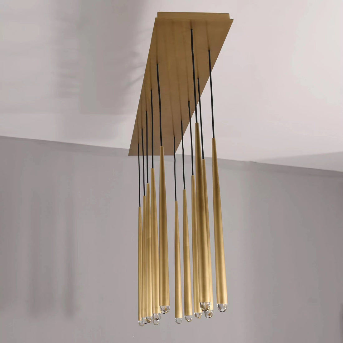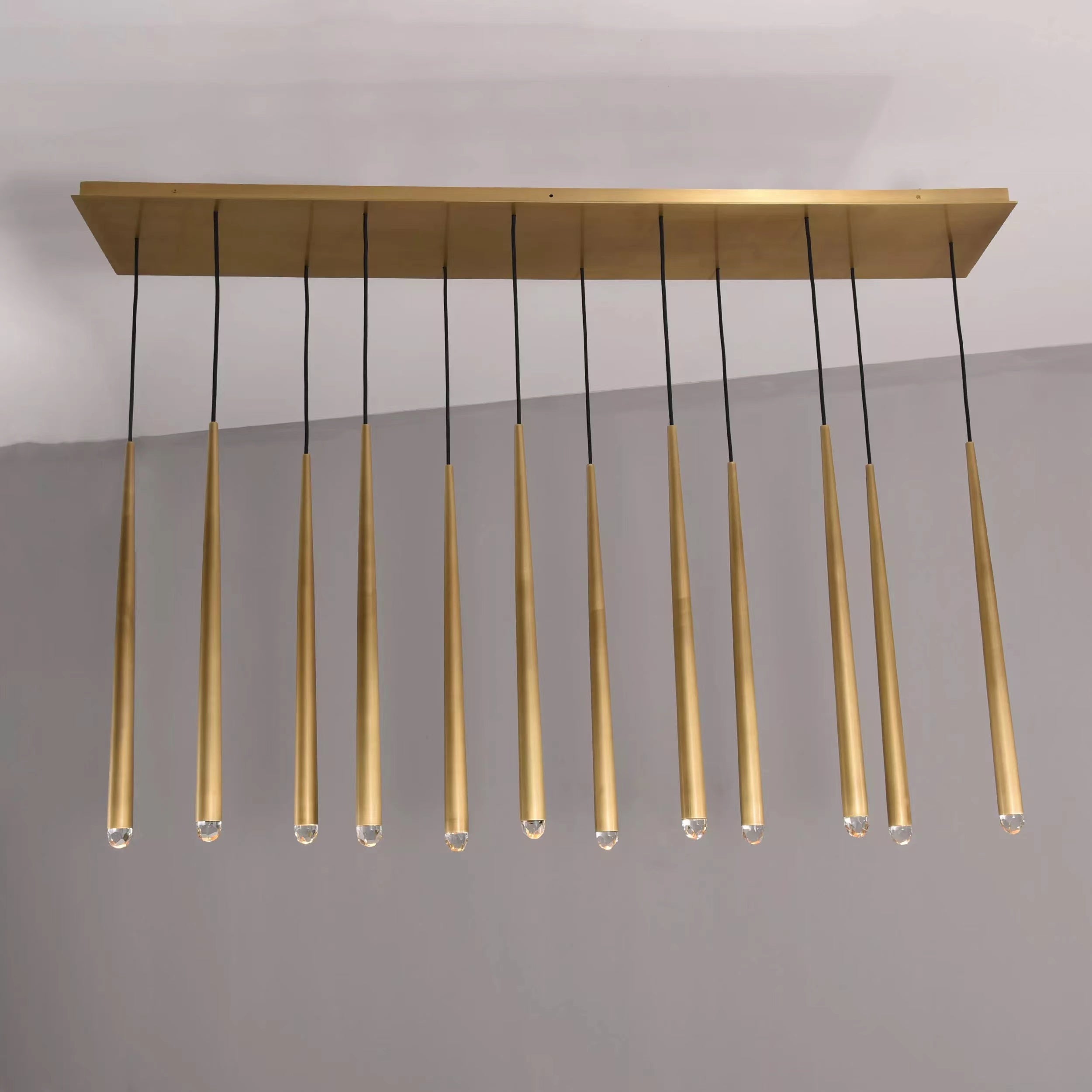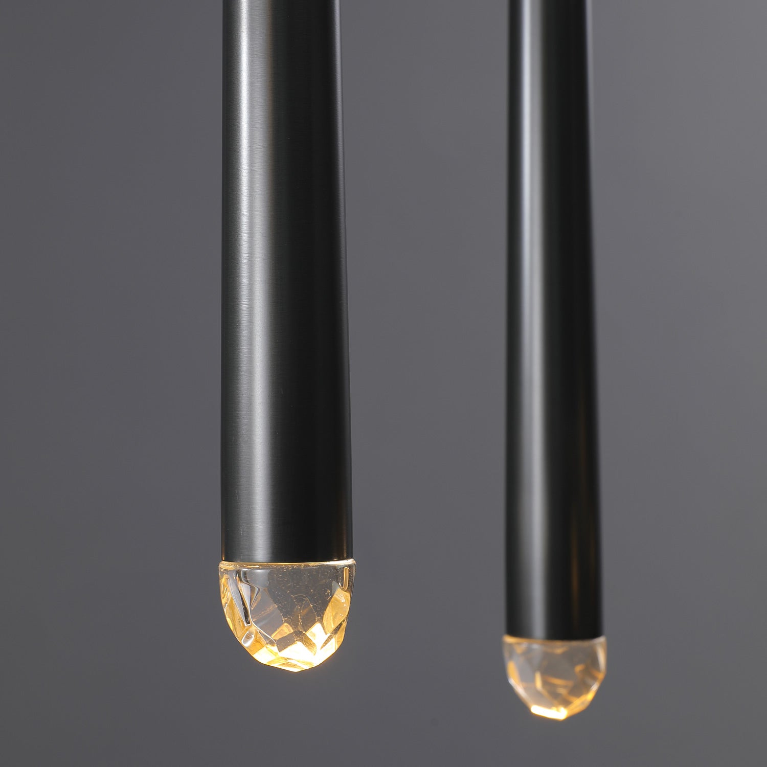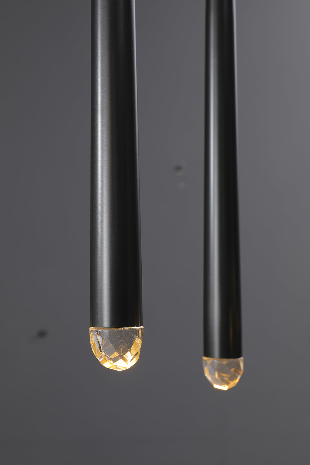 The elegant design of this chandelier features a cluster of solid brass forms suspended from a slender black cord. Recessed LEDs at the top of the faceted glass provide a warm light.