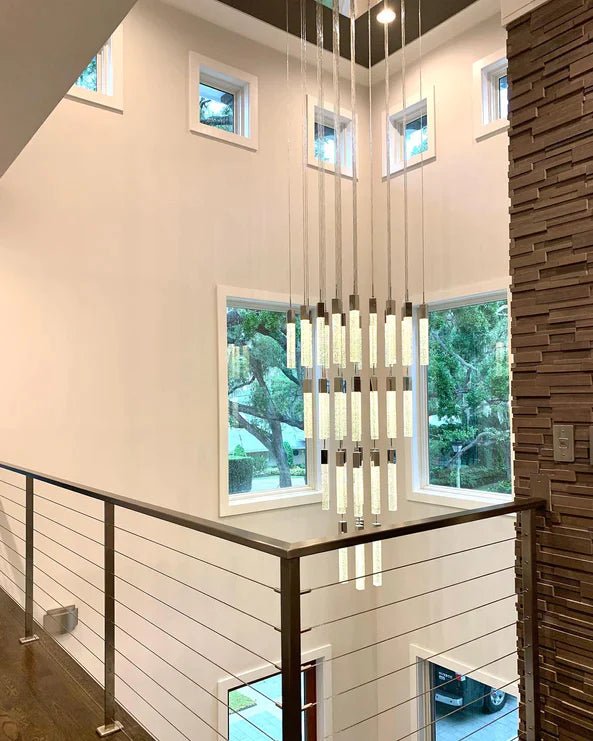Add a touch of glamour to your home with our Rylight Glacier Bubble Crystal Chandelier. Suspended in a unique pattern. the carefully crafted bubbled crystals create a captivating effect illuminated by stunning LED lighting. Make it the centerpiece of any room and embrace its alluring charm.
