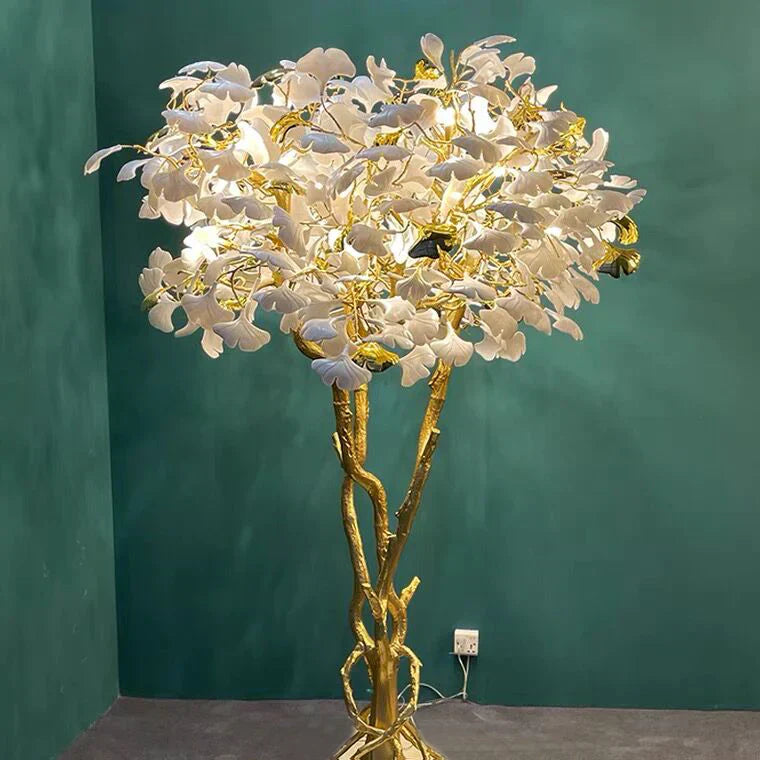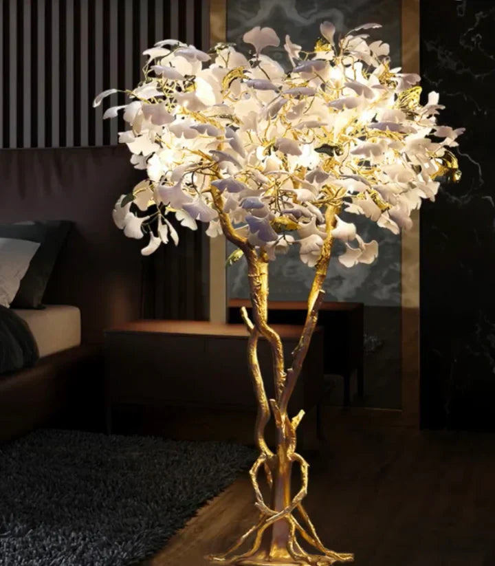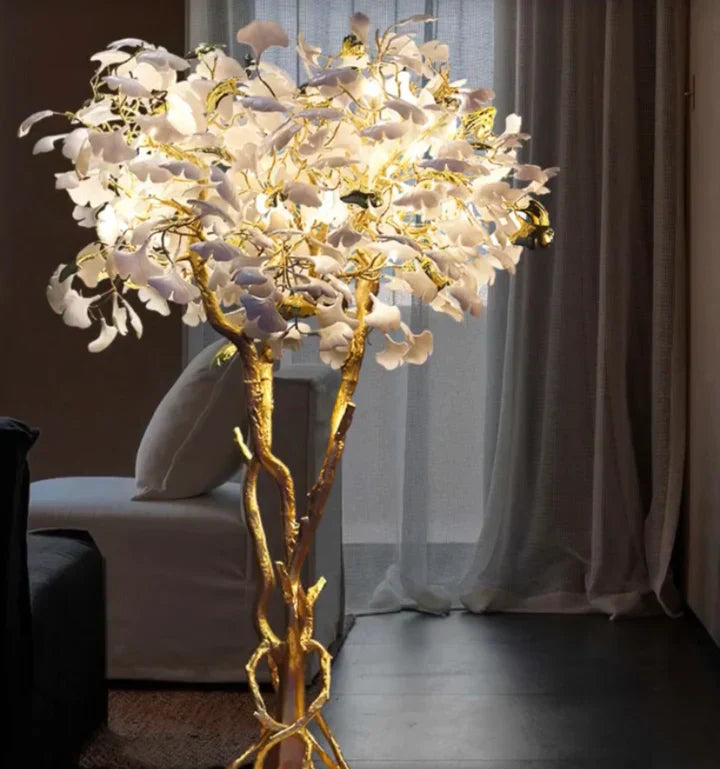 This artistic floor lamp is like a dazzling lush ginkgo tree, using ceramic production simulation ginkgo leaves, white ginkgo leaves and golden copper branches complement each other, the special thing about this lamp is that the simulation leaves are also dotted with a little gold leaves, so that this lamp is no longer monotonous, this decorative floor lamp is particularly suitable for decorating the home or coffee shops, bars and other places to illuminate the place while creating a romantic atmosphere.