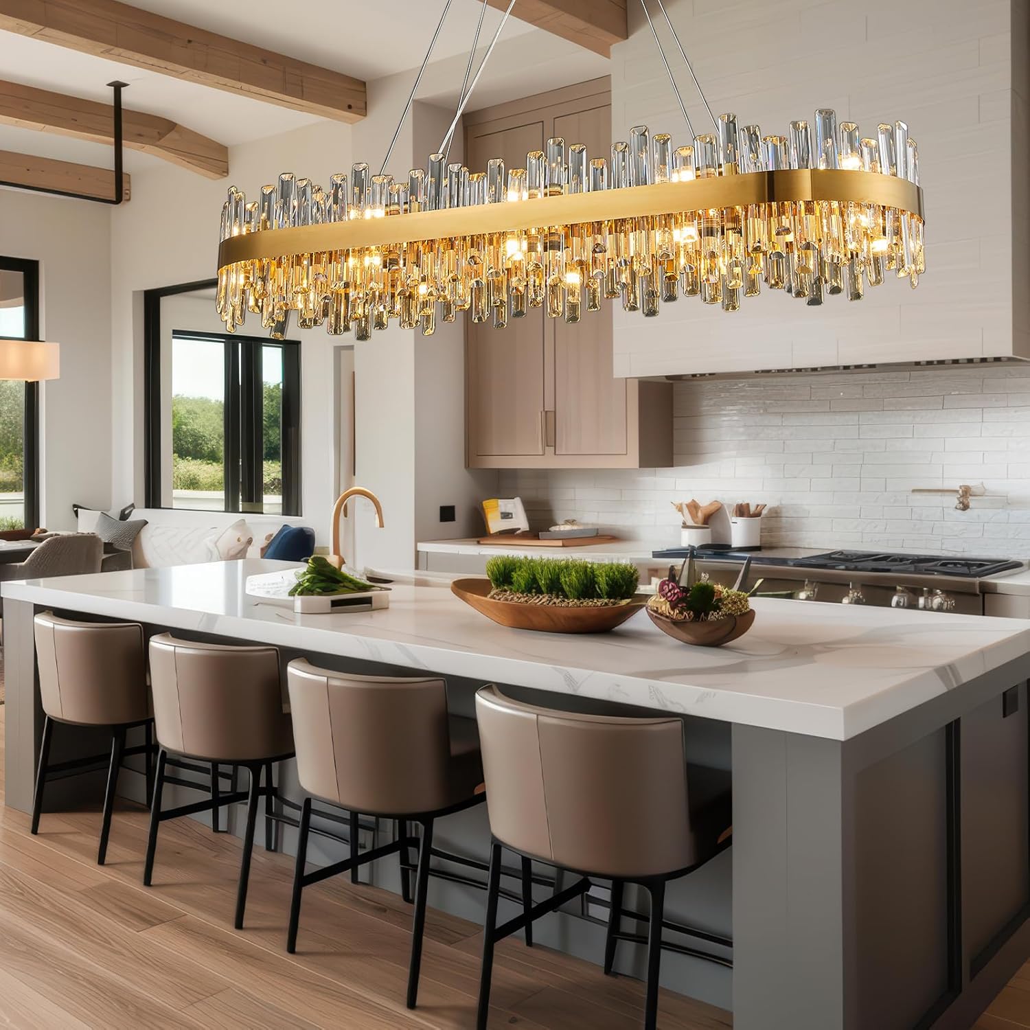 This dazzling gold‑finished chandelier boasts two tiers of sparkling K9 crystal that scatter light in every direction, turning any room into a glamorous showcase. It holds up to 20 E12 bulbs and offers warm, neutral, or cool lighting with a simple dimmer switch for the perfect mood. The adjustable stainless‑steel wires let you set the height up to 98 inches, making it ideal for lofty ceilings in dining rooms, kitchens, or grand foyers. Heavy‑duty construction (about 55 lb) ensures stability while adding an unmistakable touch of elegance.