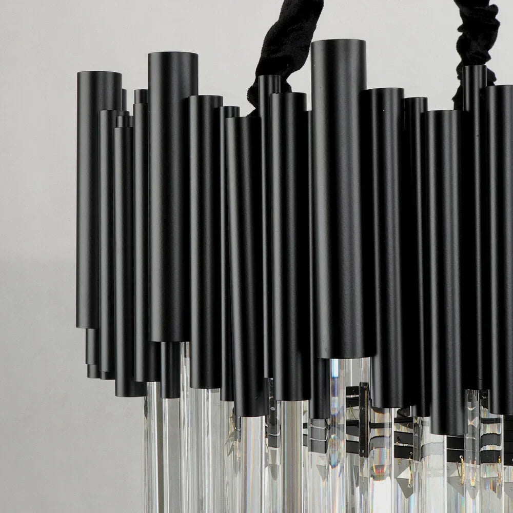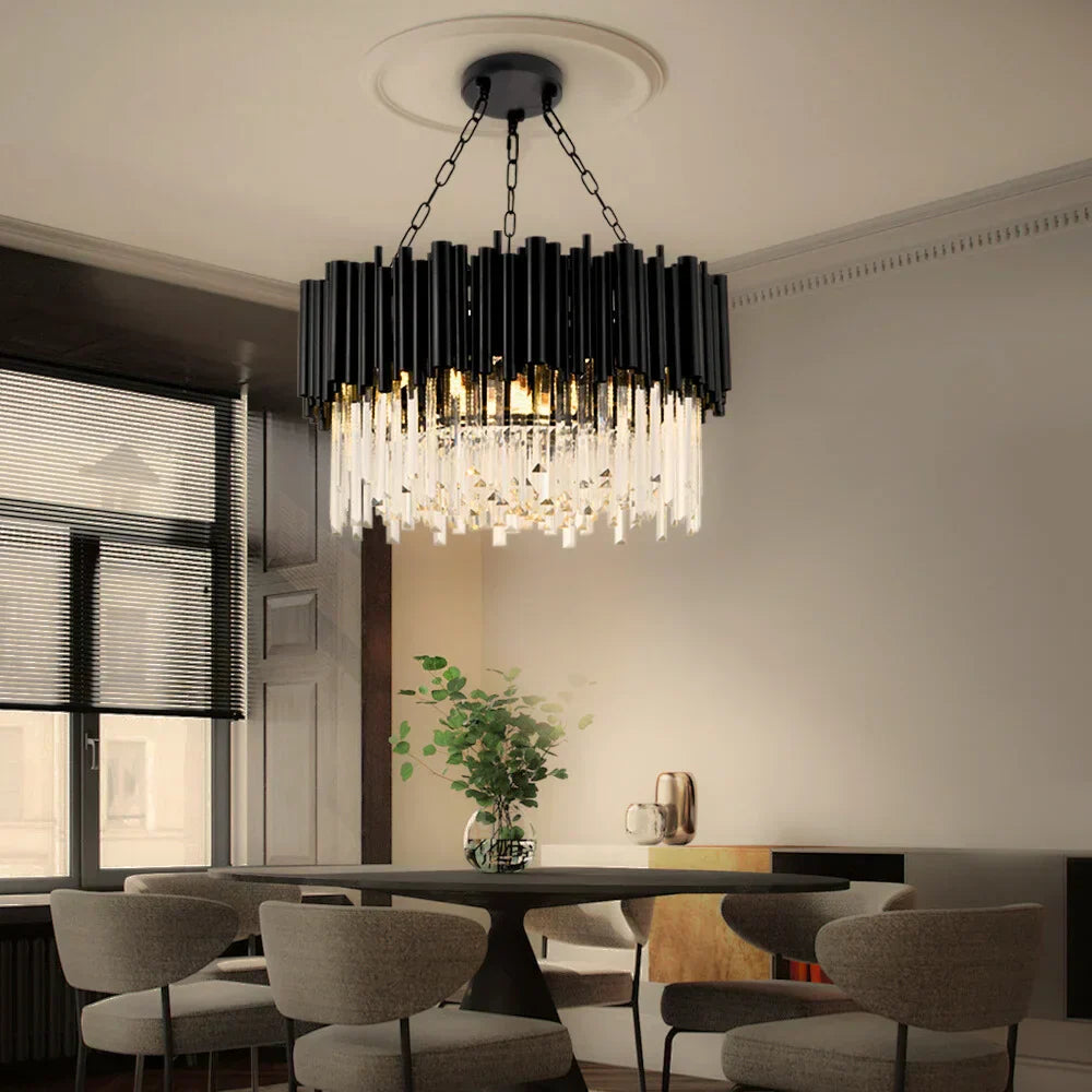 Illuminate your space with this black crystal lighting, a nocturne matte black hanging chandelier and stunning K9 crystals. Our contemporary black chandelier is perfect for creating a bold, elegant statement in your home that features a dimmable color temperature and adjustable hanging chain that you can customize the light to suit any mood.