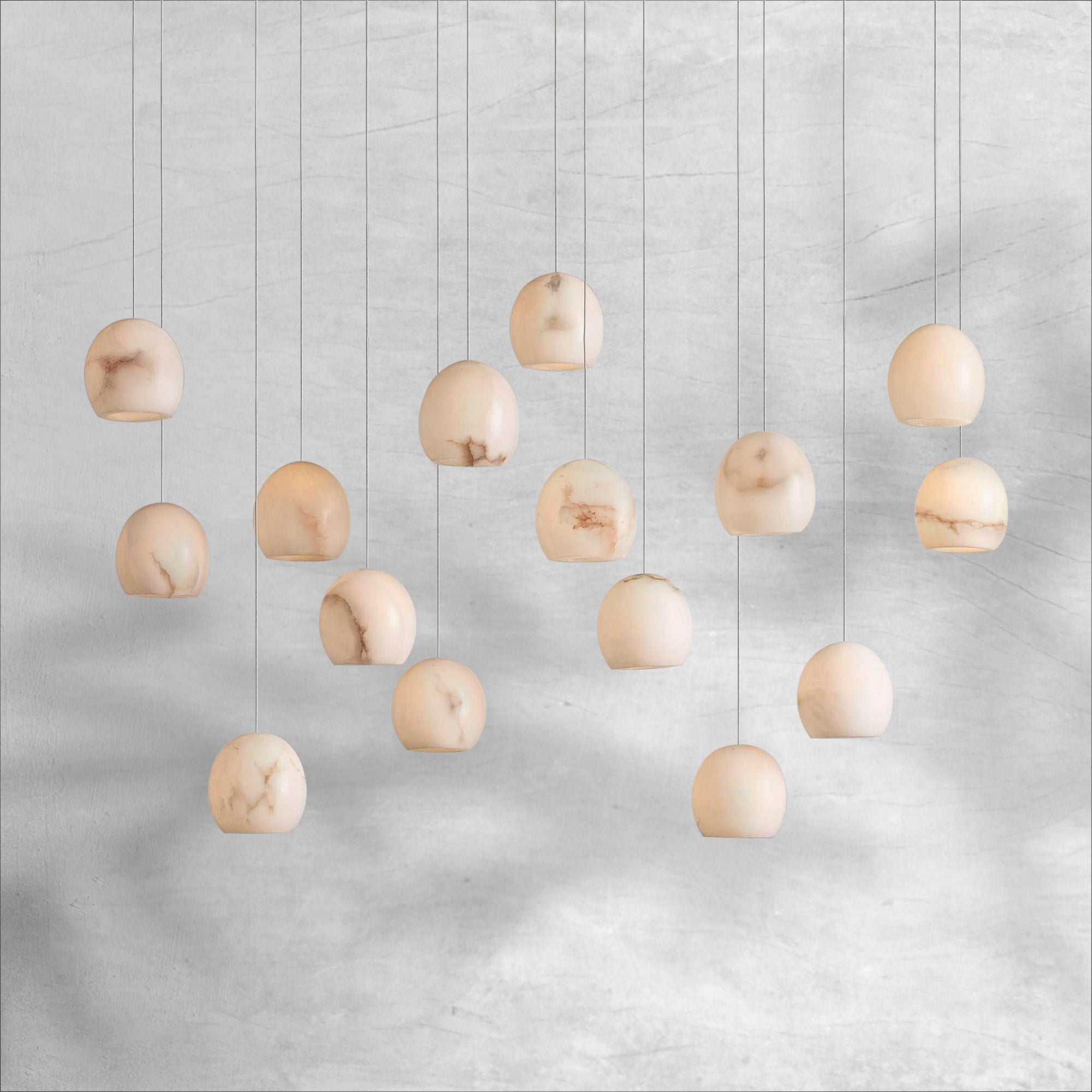 - Featuring an adjustable cable cascading into a curved shade made from natural alabaster stone, our Arica Collection adds a touch of organic elegance. Designed to highlight the beautiful variations found in natural alabaster, each luminous shade showcases delicate swirls of unique veining making each pendant truly one-of-a-kind.