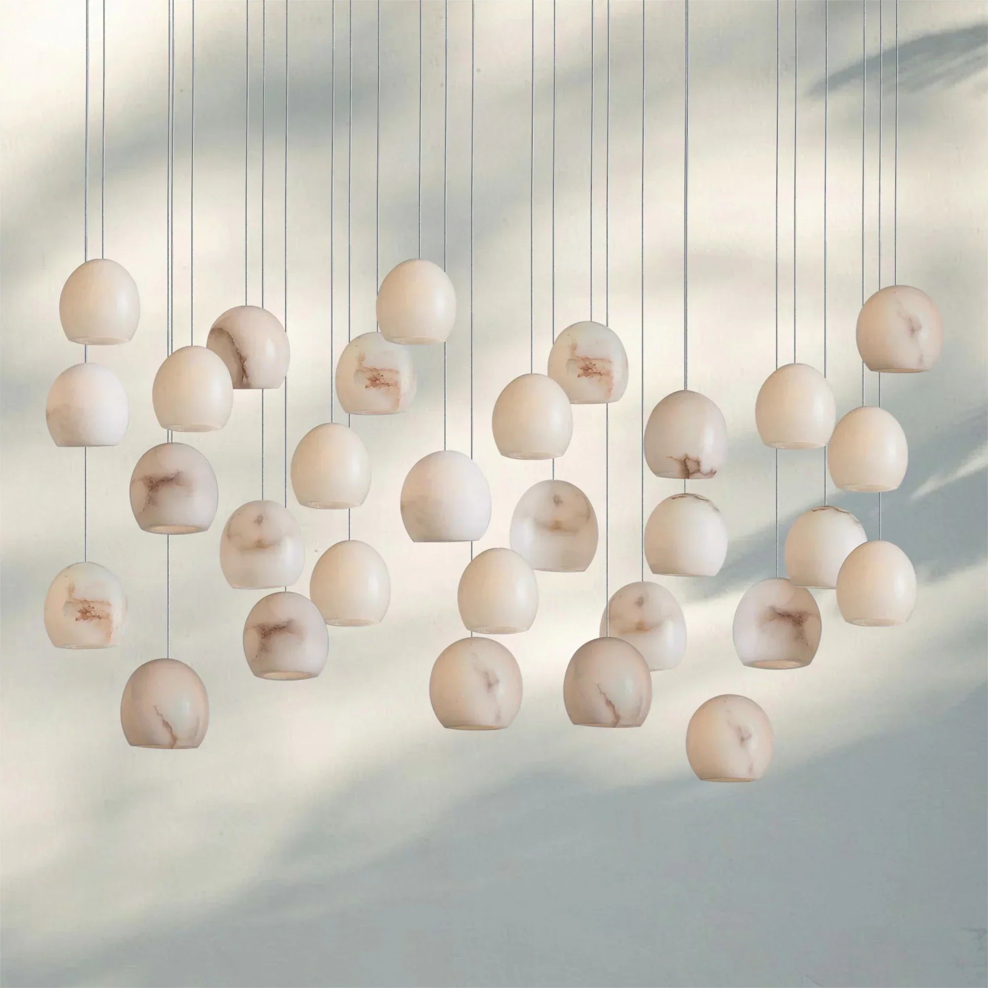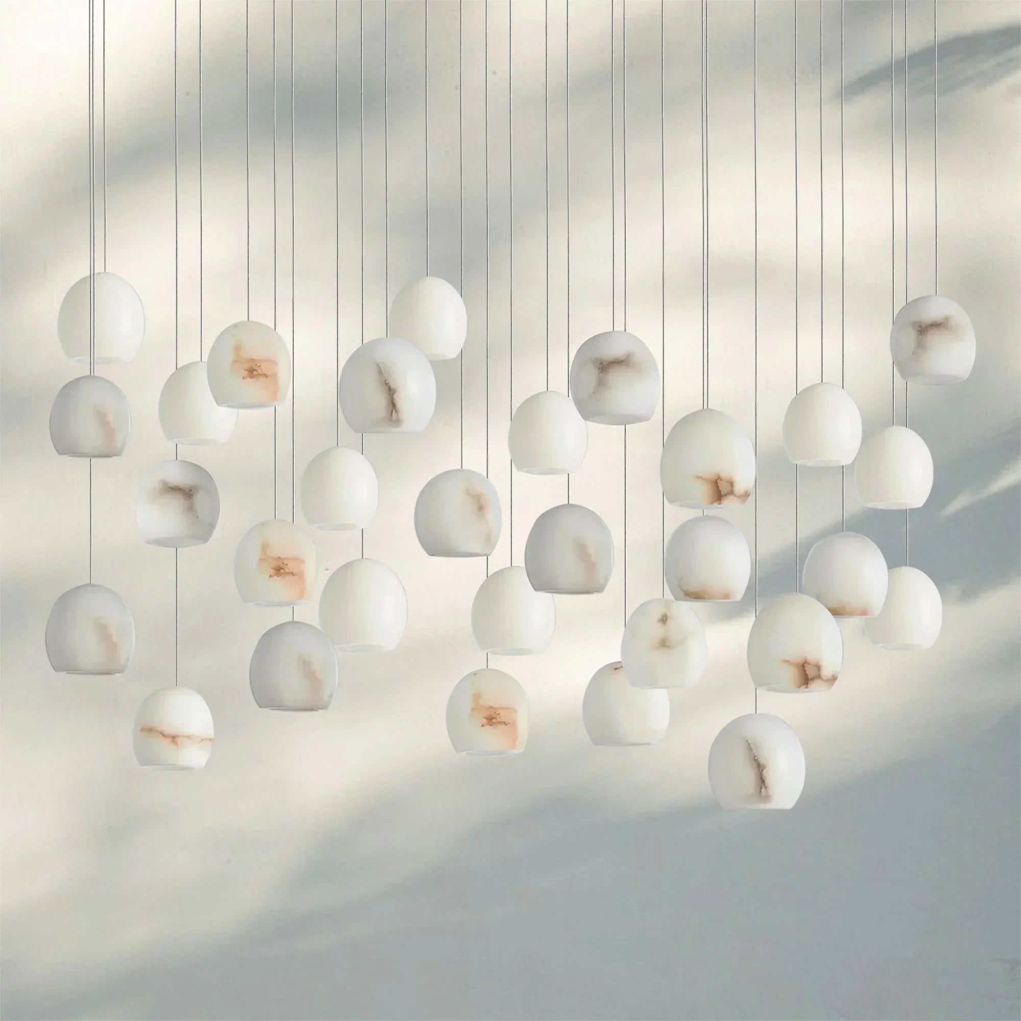 Featuring an adjustable cable cascading into a curved shade made from natural alabaster stone, our Arika Collection adds a touch of organic elegance. Designed to highlight the beautiful variations found in natural alabaster, each luminous shade showcases delicate swirls of unique veining making each pendant truly one-of-a-kind.