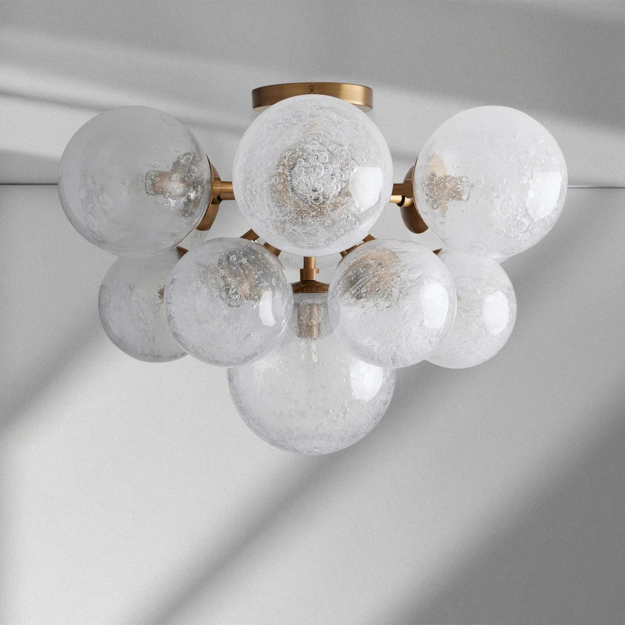 A fusion of rustic charm and industrial design, our Mandoza Collection features stunning silhouettes and mixed-material style. Each individual glass globe is hand-blown with a redraft technique, creating a dense network of bubbles under a thick layer of glass. The result has a striking effect when illuminated from within, casting light from every angle.